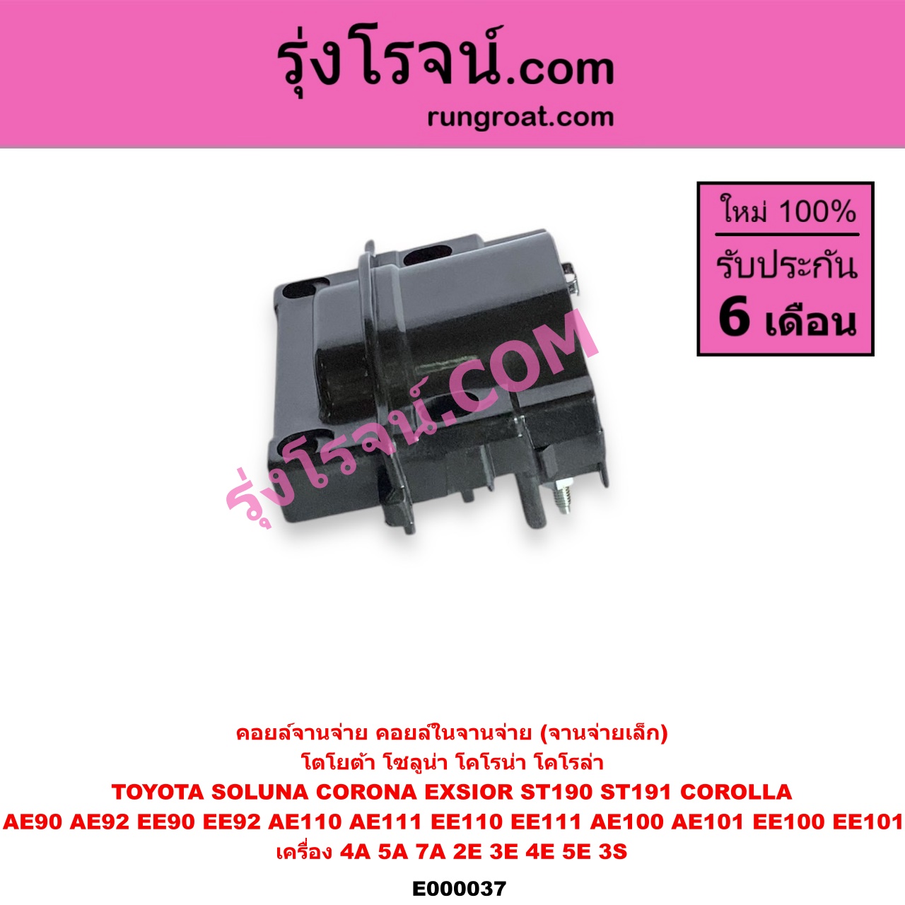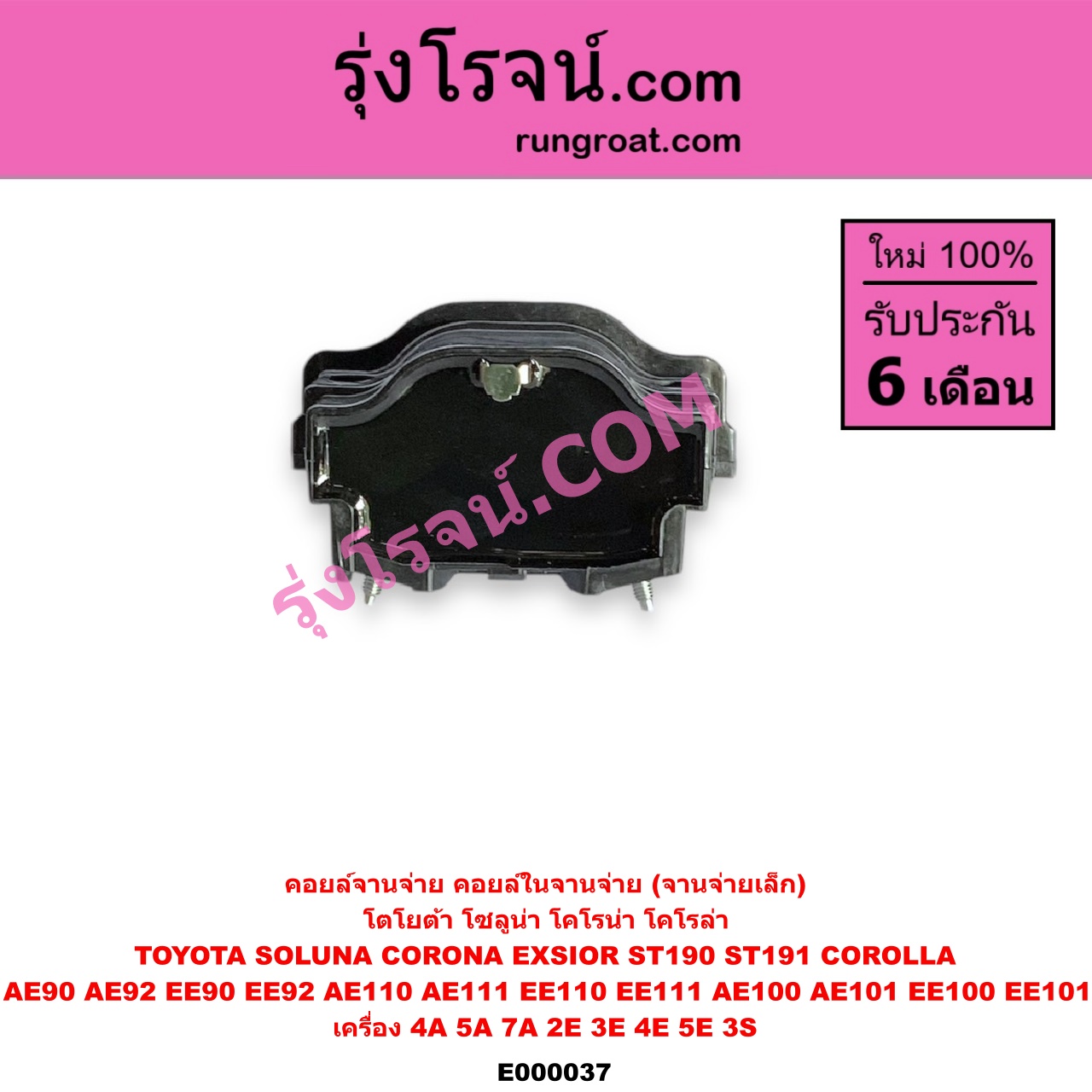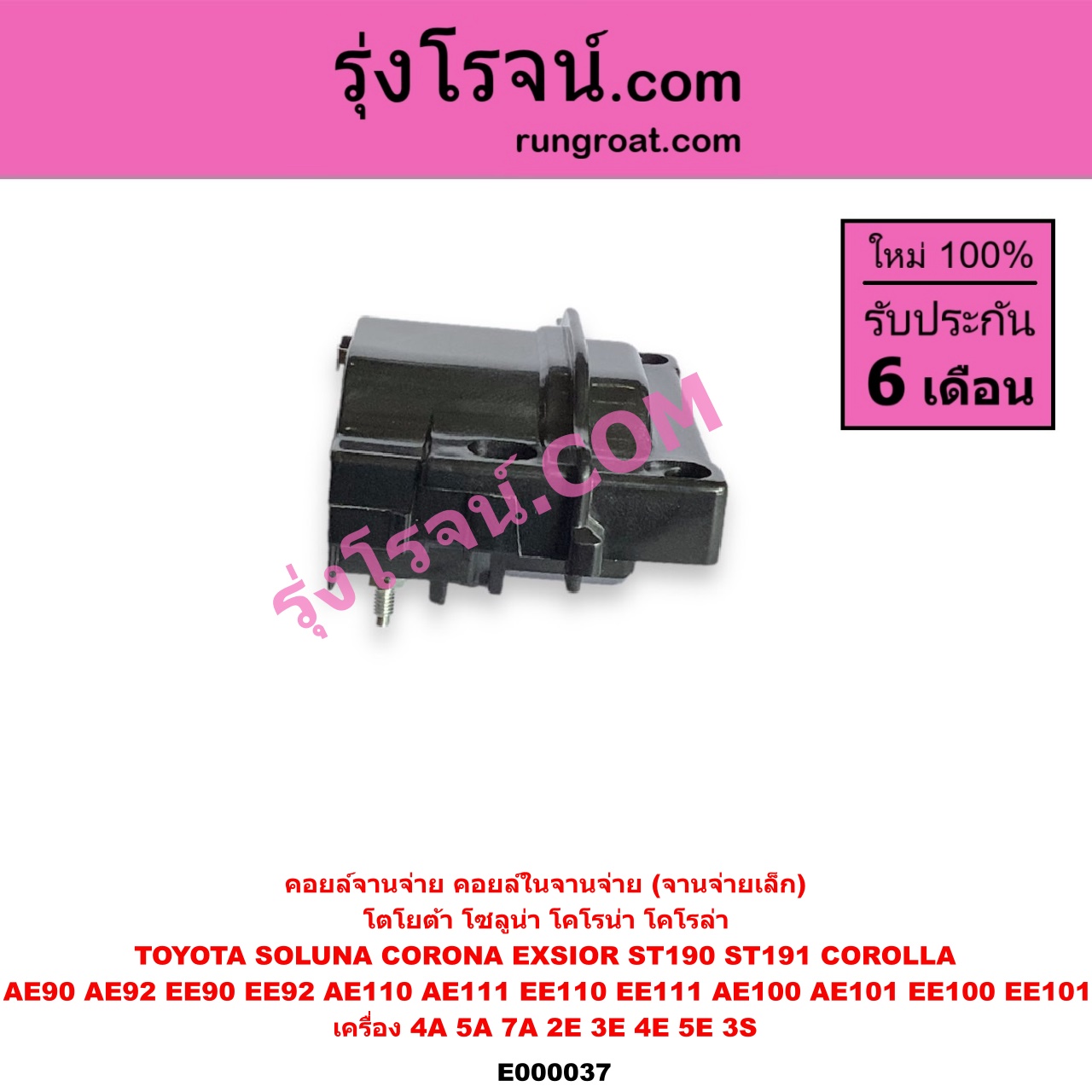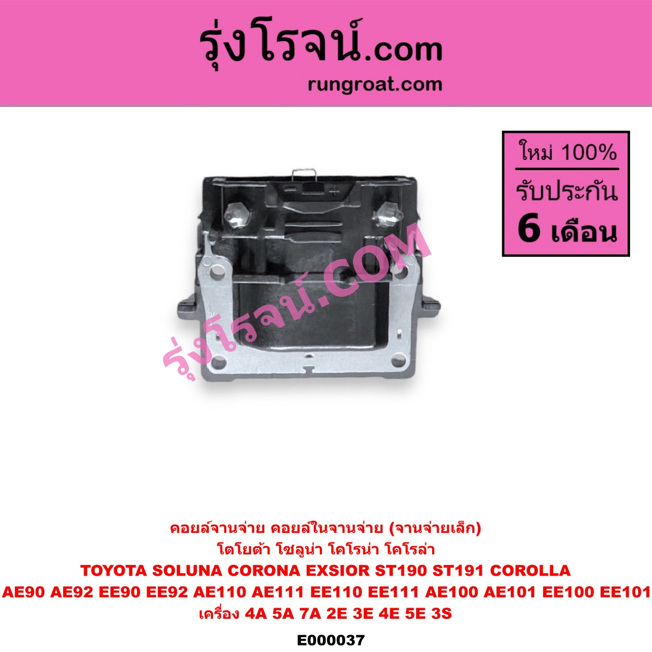 | E000037 | คอยล์จานจ่าย (คอยล์ในจานจ่าย) | TOYOTA (โตโยต้า) / COROLLA (โคโรล่า AE100/101) (สามห่วง) , TOYOTA (โตโยต้า) / COROLLA (โคโรล่า AE110/111) (ตูดเป็ด / ไฮทอร์ค) , TOYOTA (โตโยต้า) / COROLLA (โคโรล่า AE90/92) (โดเรม่อน) , TOYOTA (โตโยต้า) / CORONA (โคโรน่า ST190/191/EXSIOR) (ท้ายโด่ง) , TOYOTA (โตโยต้า) / SOLUNA (โซลูน่า 97/99) |
