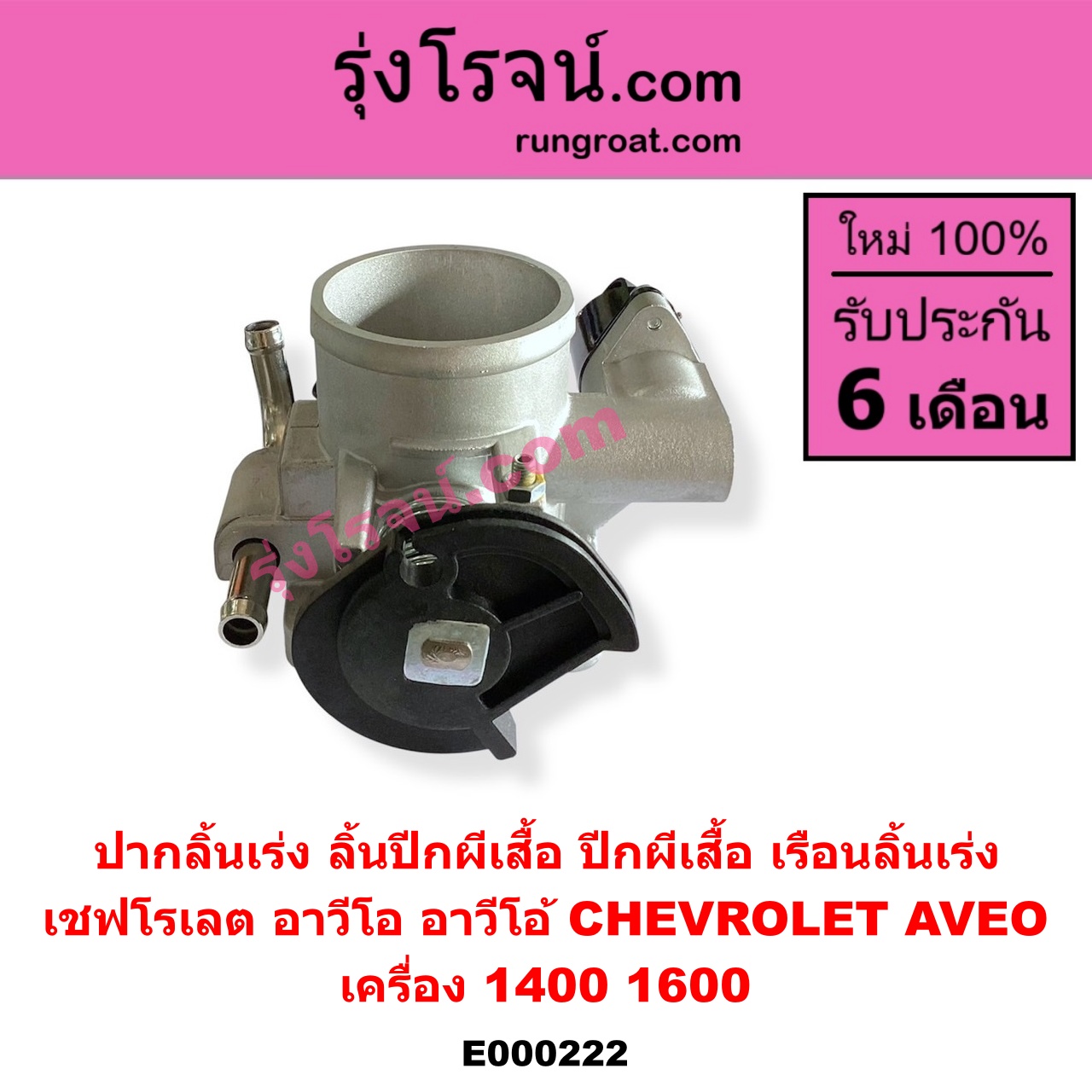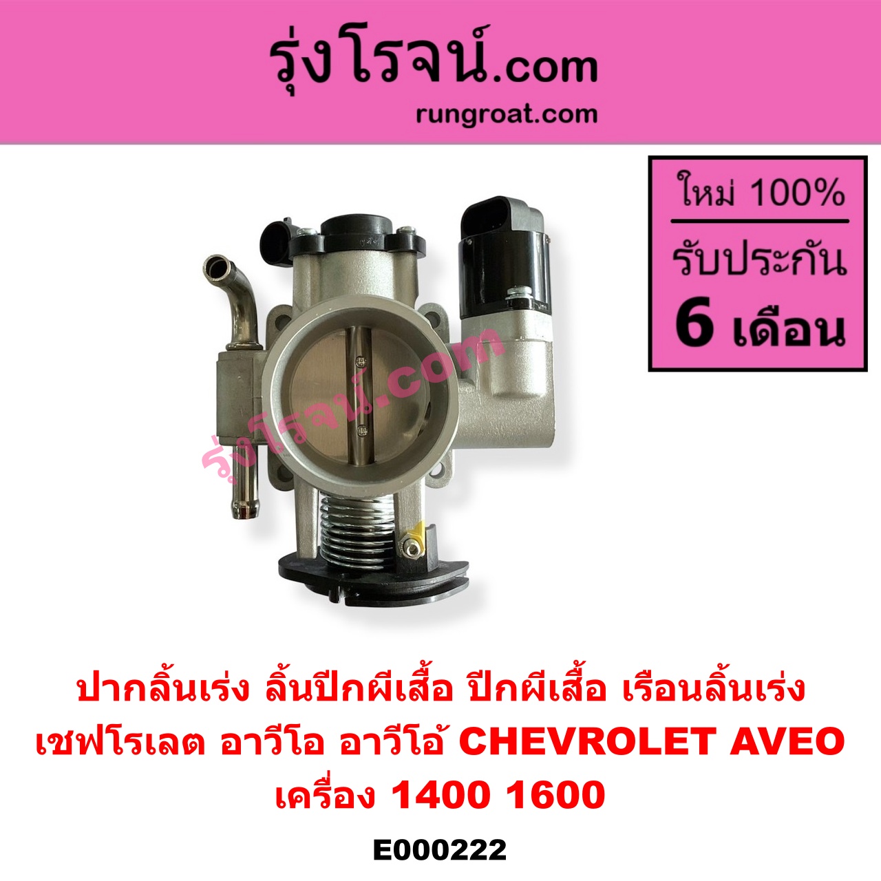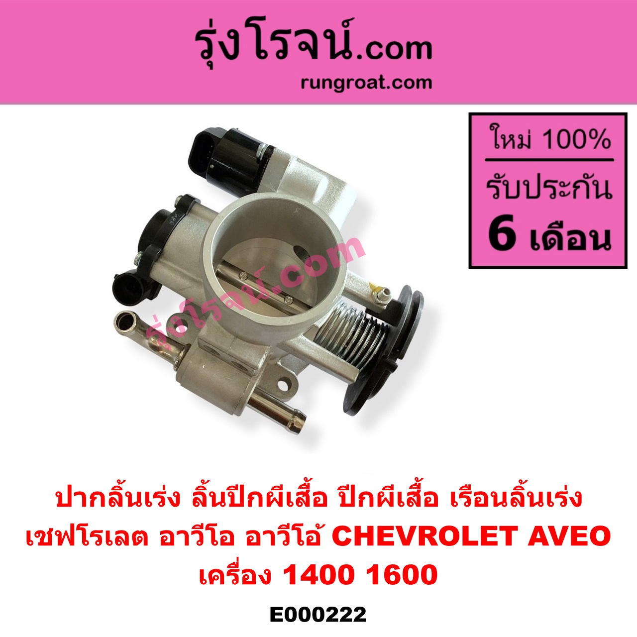 | E000222 | ปากลิ้นเร่ง (ลิ้นปีกผีเสื้อ, ปีกผีเสื้อ, เรือนลิ้นเร่ง) | CHEVROLET (เชฟโรเลต) / AVEO (อาวีโอ อาวีโอ้ 2002) | เครื่อง 1400, 1600 | ไต้หวัน (ใหม่) |