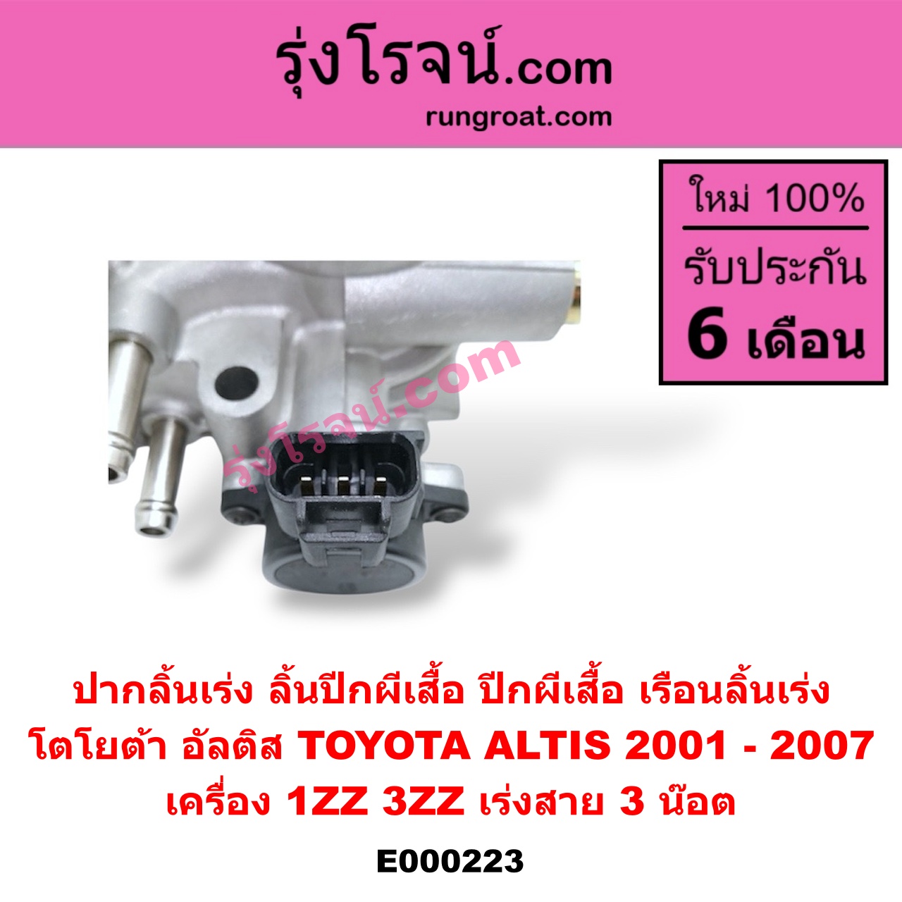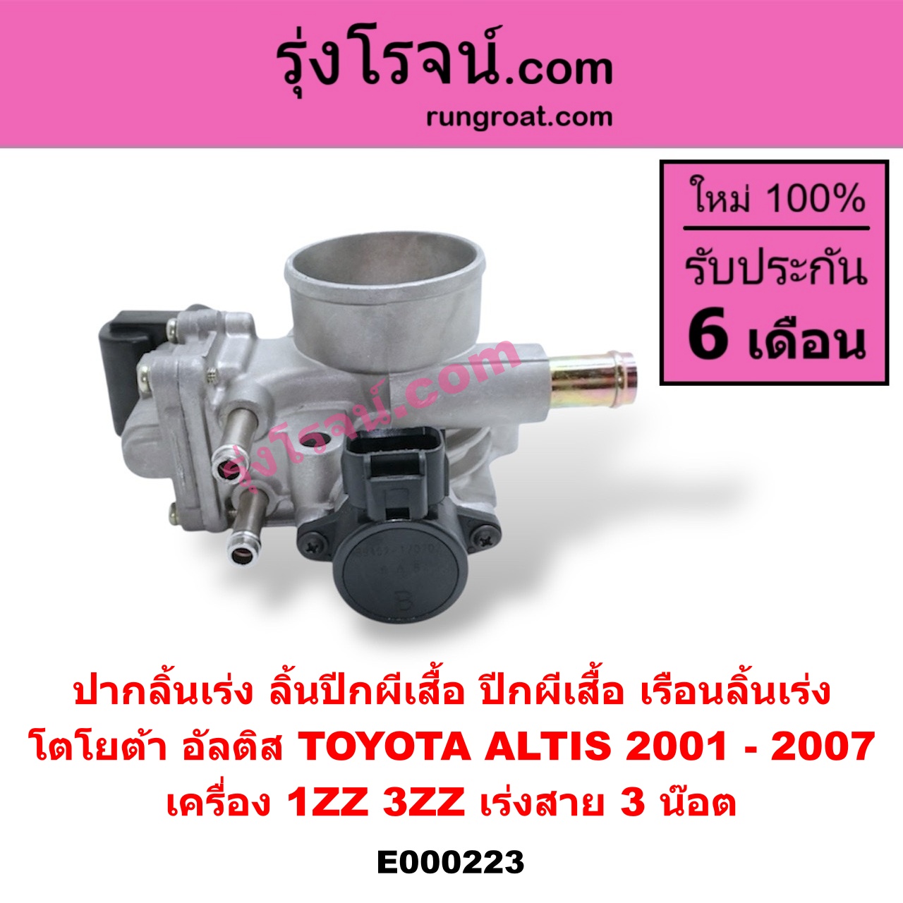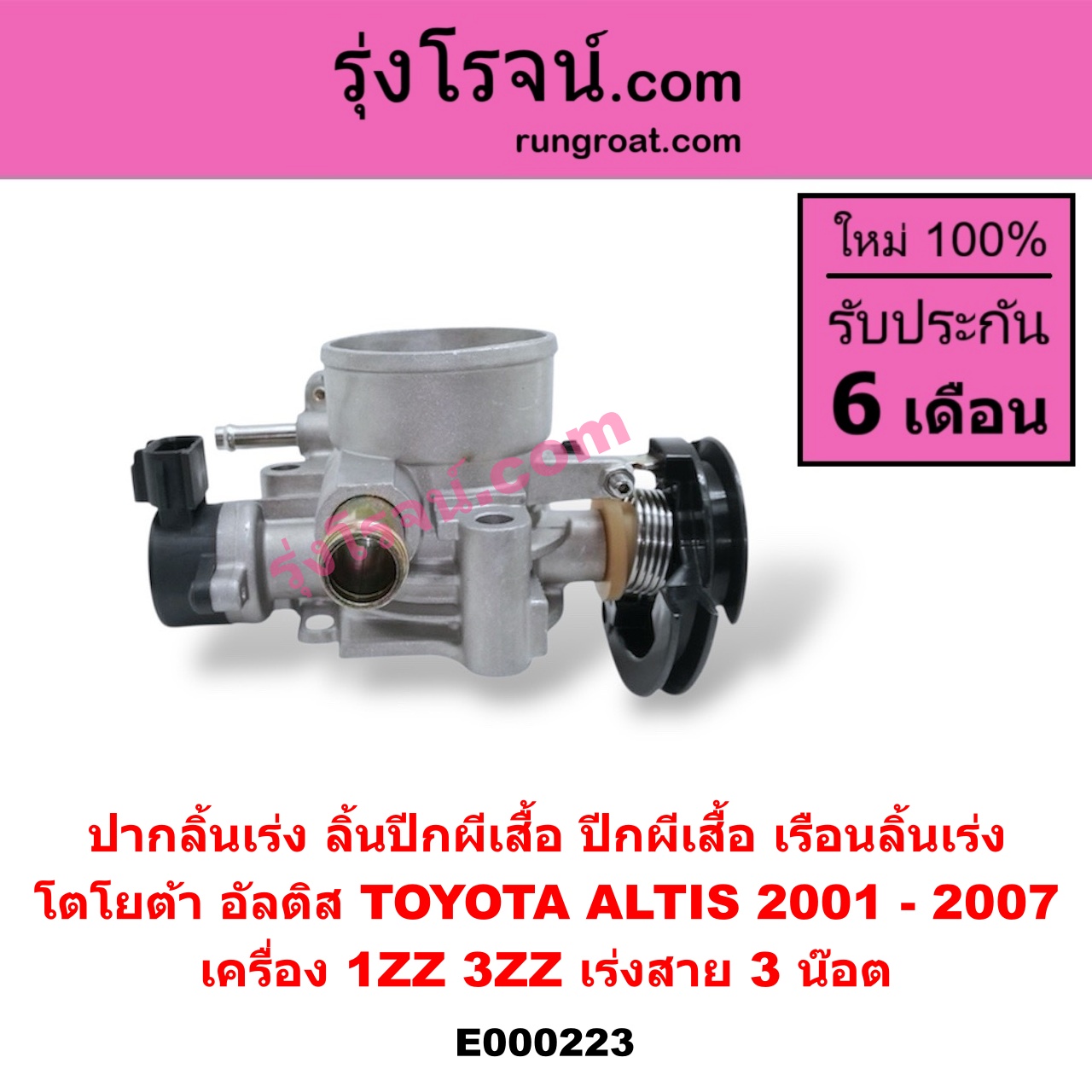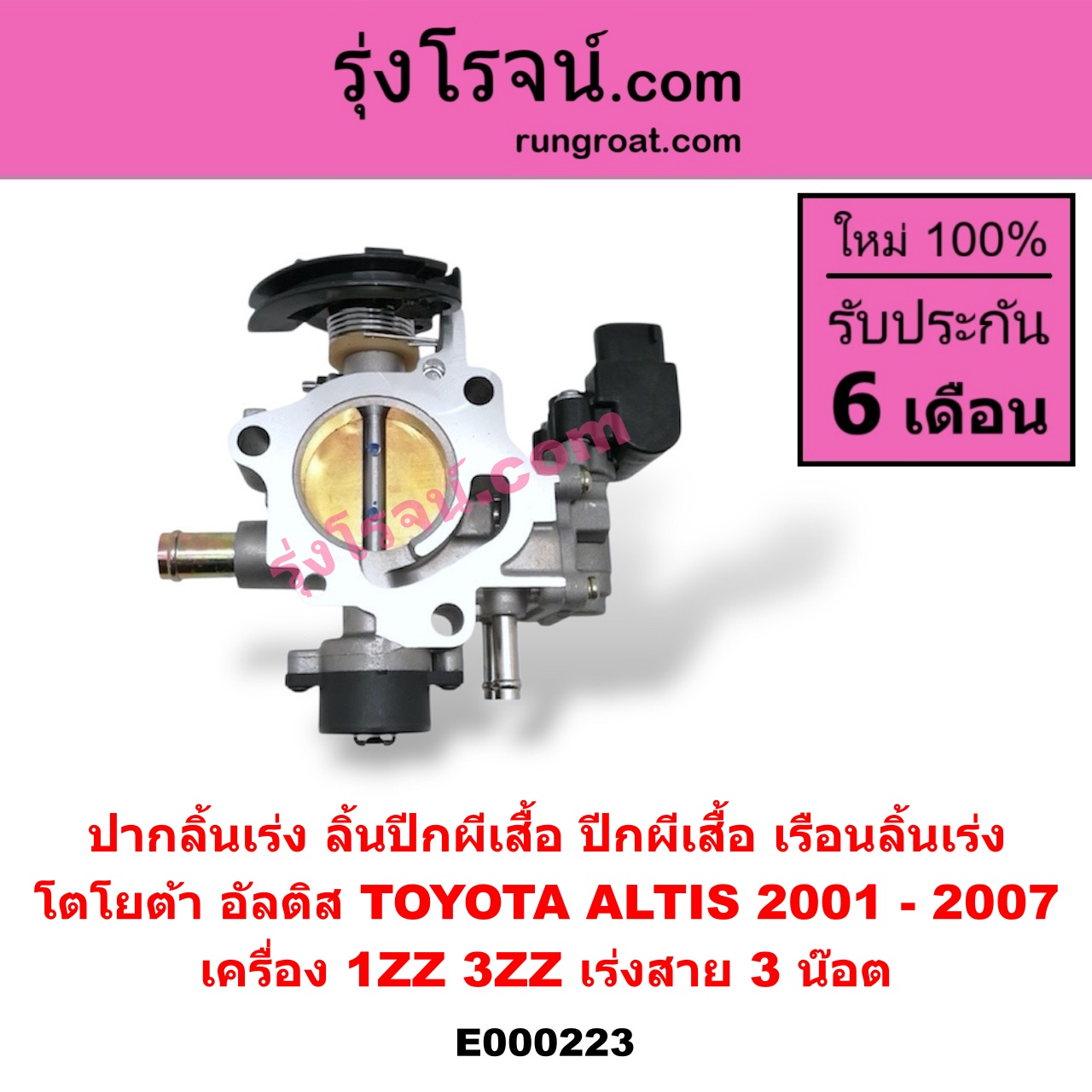 | E000223 | ปากลิ้นเร่ง (ลิ้นปีกผีเสื้อ, ปีกผีเสื้อ, เรือนลิ้นเร่ง) | TOYOTA (โตโยต้า) / ALTIS (อัลติส 2001 – 2007) (หน้าหมู รุ่นแรก) | เครื่อง 1ZZ, 3ZZ (เร่งสาย) (3 น๊อต) | ไต้หวัน (ใหม่) |