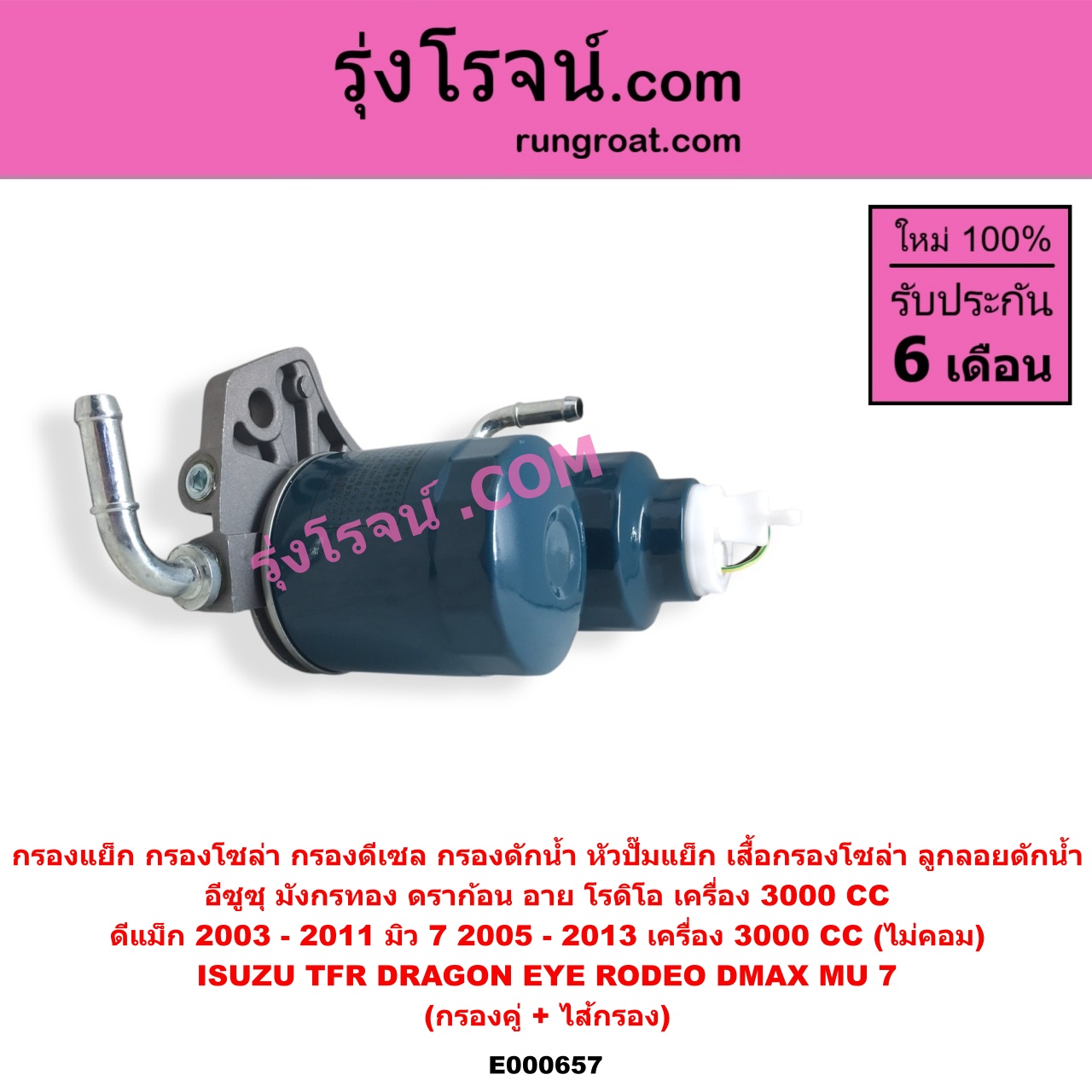 | E000657 | กรองแย็ก (กรองโซล่า, กรองดีเซล, กรองดักน้ำ) | ISUZU (อีซูซุ) / D-MAX (ดีแม็ก ดีแม็ค DMAX 2003 – 2011) (รุ่นแรก) , ISUZU (อีซูซุ) / DRAGON EYE (ดราก้อน อาย) (TFR 1997 – 2002) , ISUZU (อีซูซุ) / MU 7 (มิว 7 2005 – 2013) , ISUZU (อีซูซุ) / RODEO (โรดิโอ) , ISUZU (อีซูซุ) / TFR (มังกรทอง 90/95) |