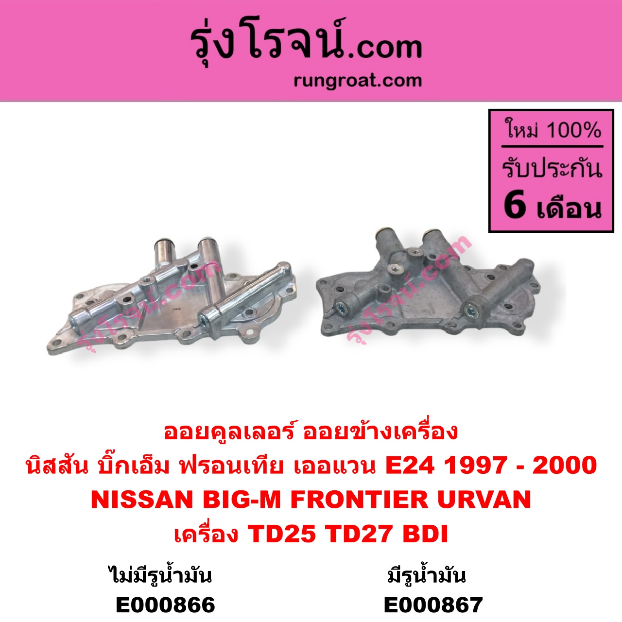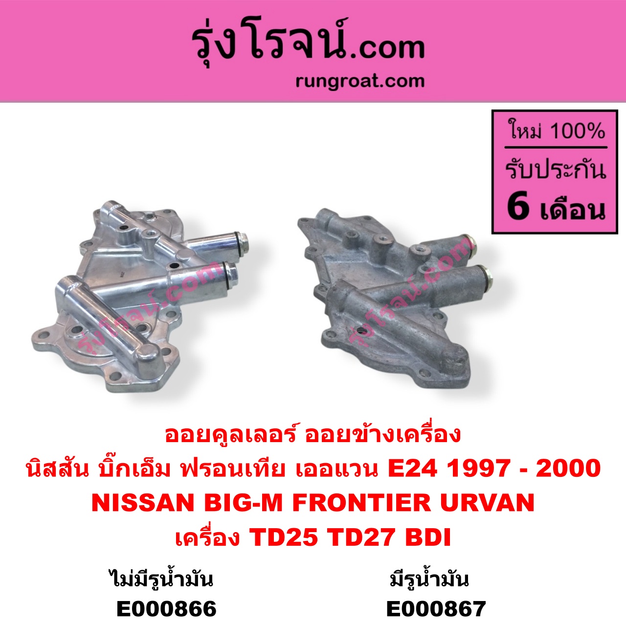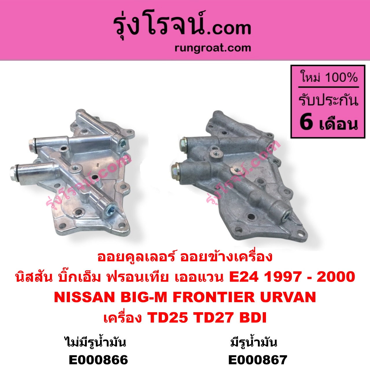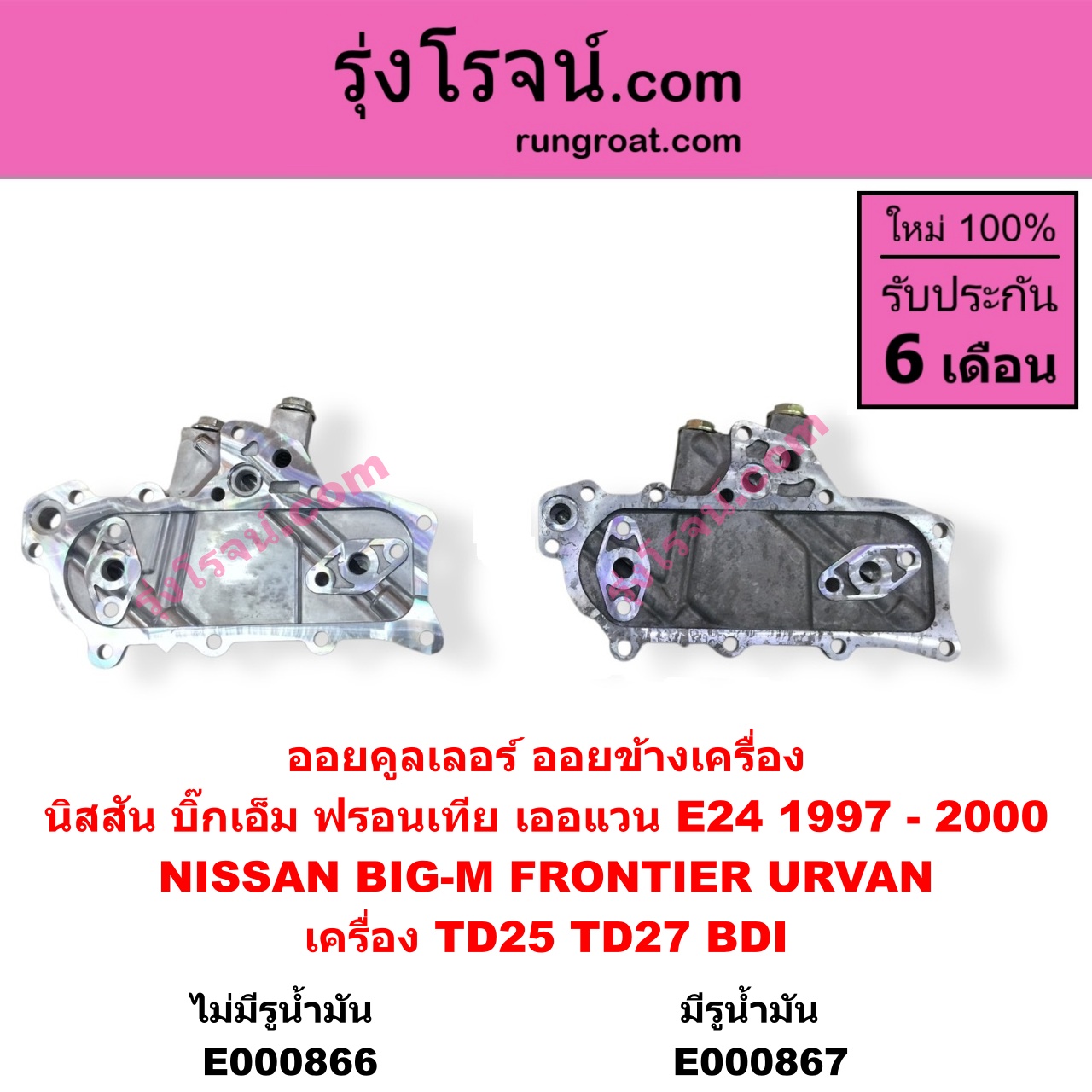 | E000867 | ออยคูลเลอร์ (ออยข้างเครื่อง) | NISSAN (นิสสัน) / BIG-M (บิ๊กเอ็ม TD, BDI / 925 / 993) , NISSAN (นิสสัน) / FRONTIER (ฟรอนเทีย 1998 – 2006) , NISSAN (นิสสัน) / URVAN (เออแวน E25 2001 – 2011) |