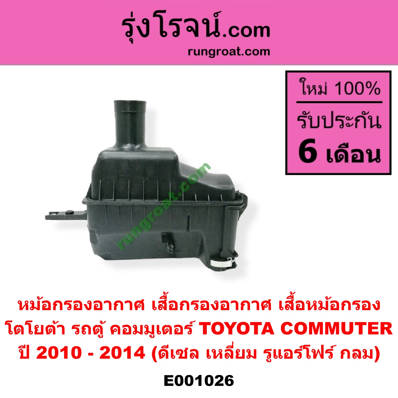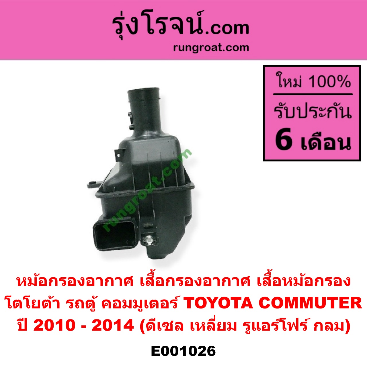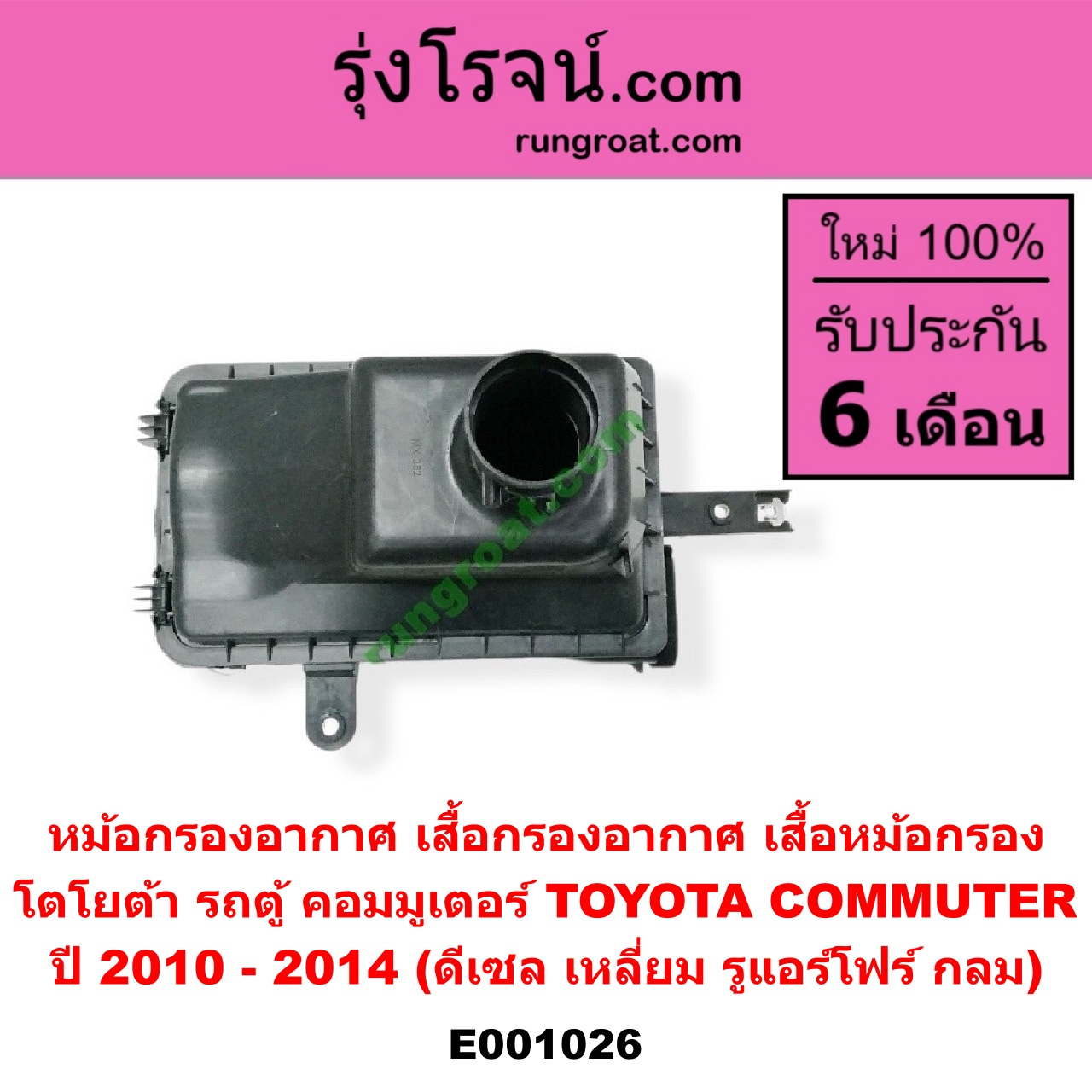 | E001026 | หม้อกรองอากาศ | TOYOTA (โตโยต้า) / COMMUTER (คอมมิวเตอร์ 05/09/12/14) | ปี 2010 – 2014 (ดีเซล เหลี่ยม) (รูแอร์โฟร์ กลม) | ไต้หวัน (ใหม่) |