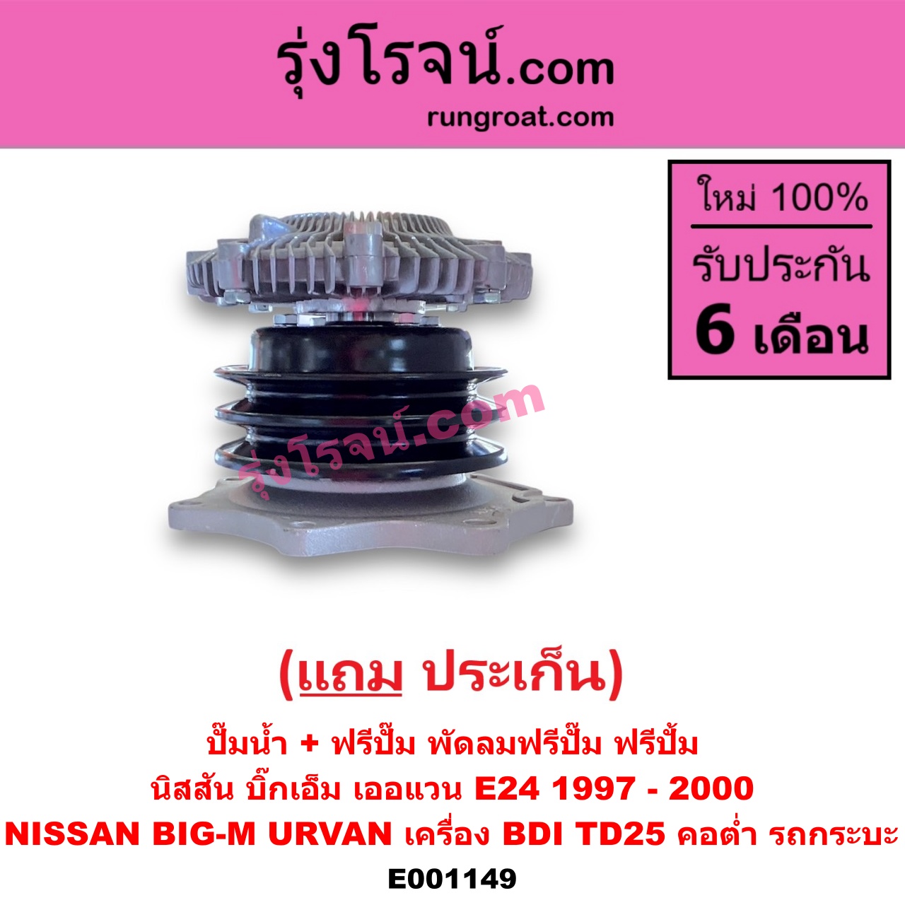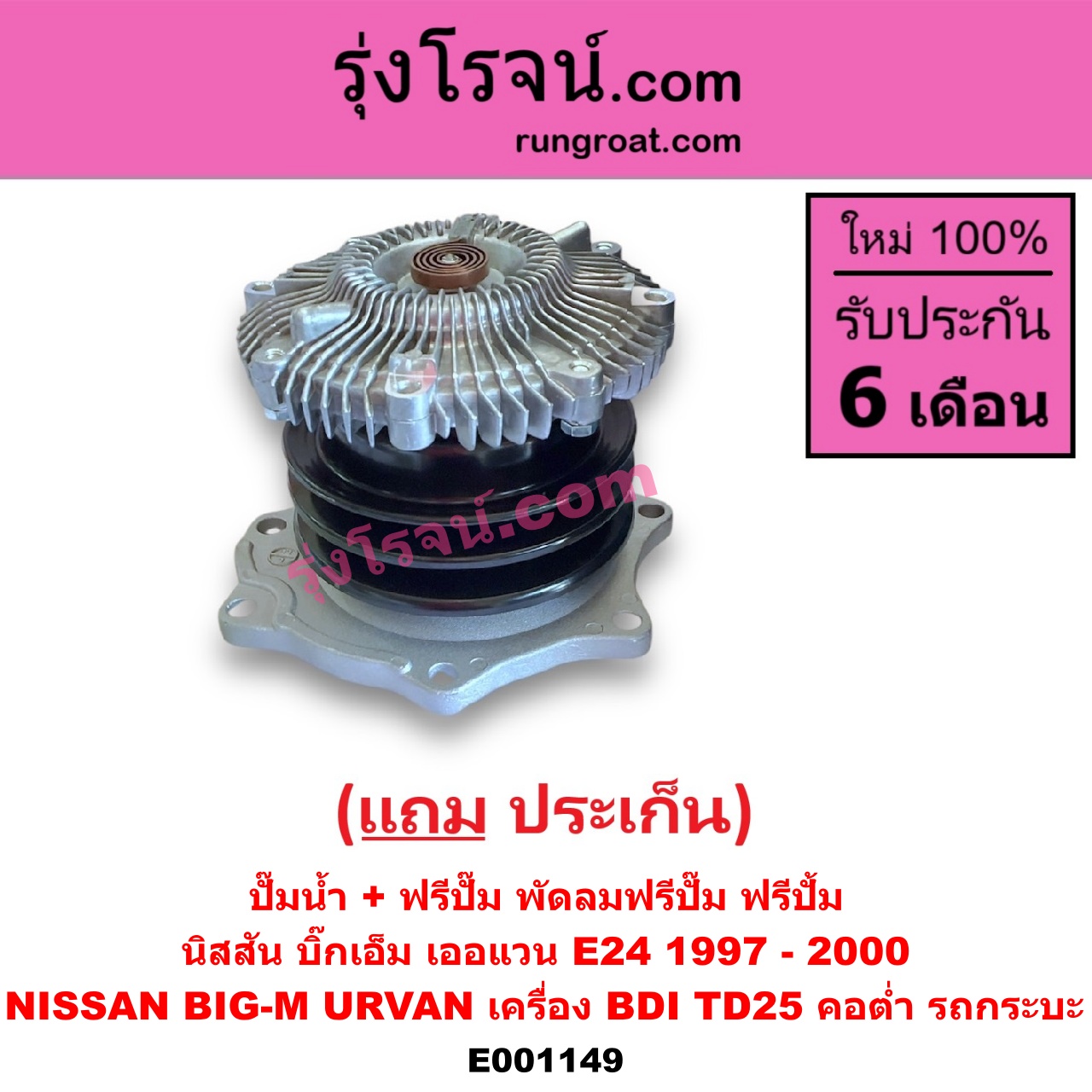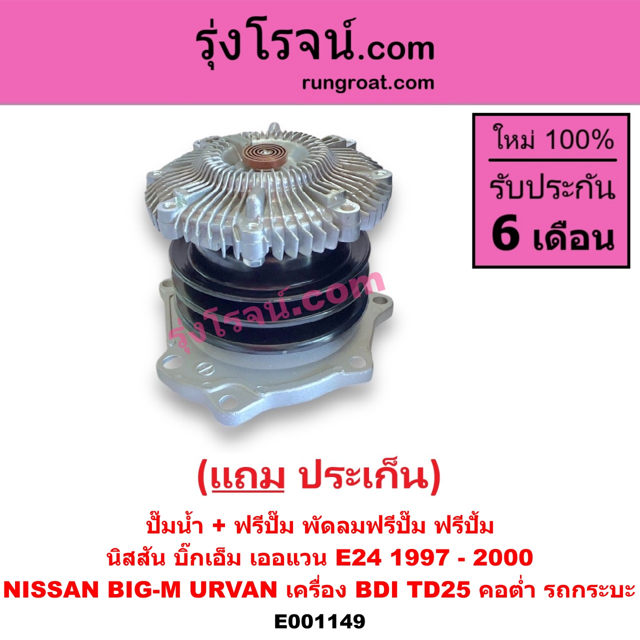 | E001149 | ปั๊มน้ำ + ฟรีปั๊ม (พัดลมฟรีปั๊ม ฟรีปั้ม) | NISSAN (นิสสัน) / BIG-M (บิ๊กเอ็ม TD, BDI/925/993) , NISSAN (นิสสัน) / URVAN (เออแวน E24 97/99) |