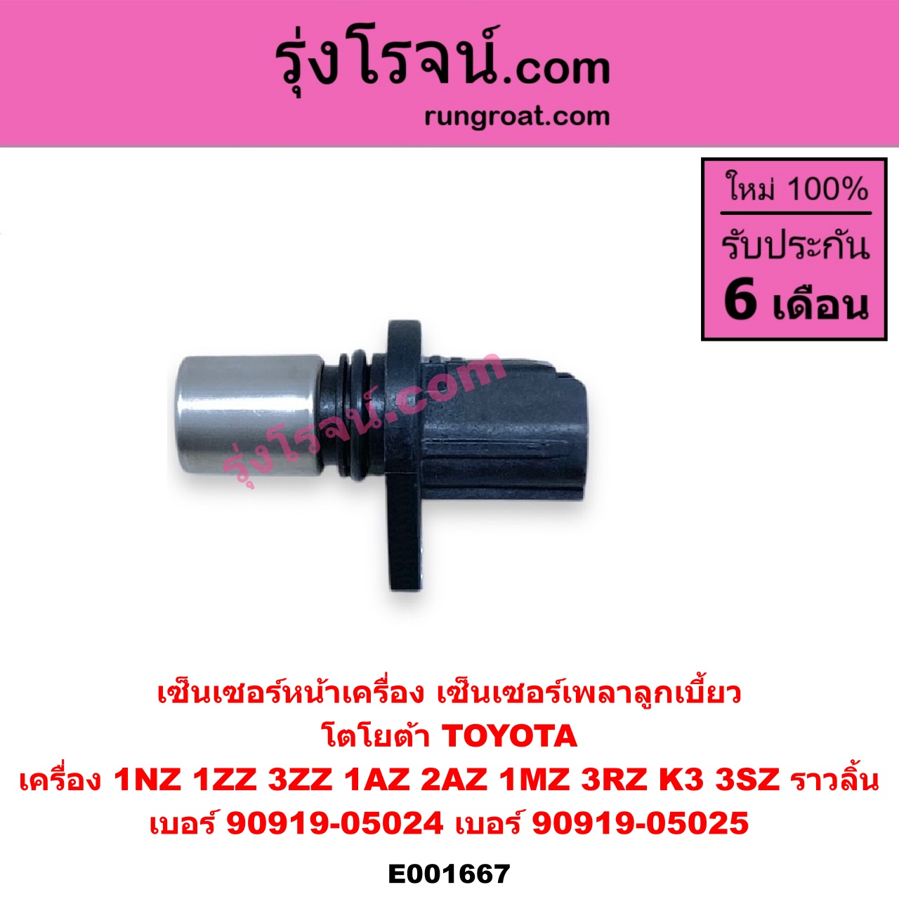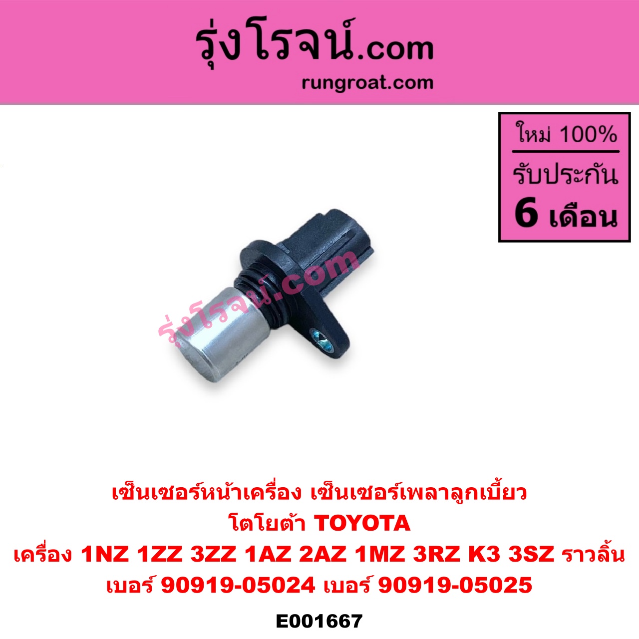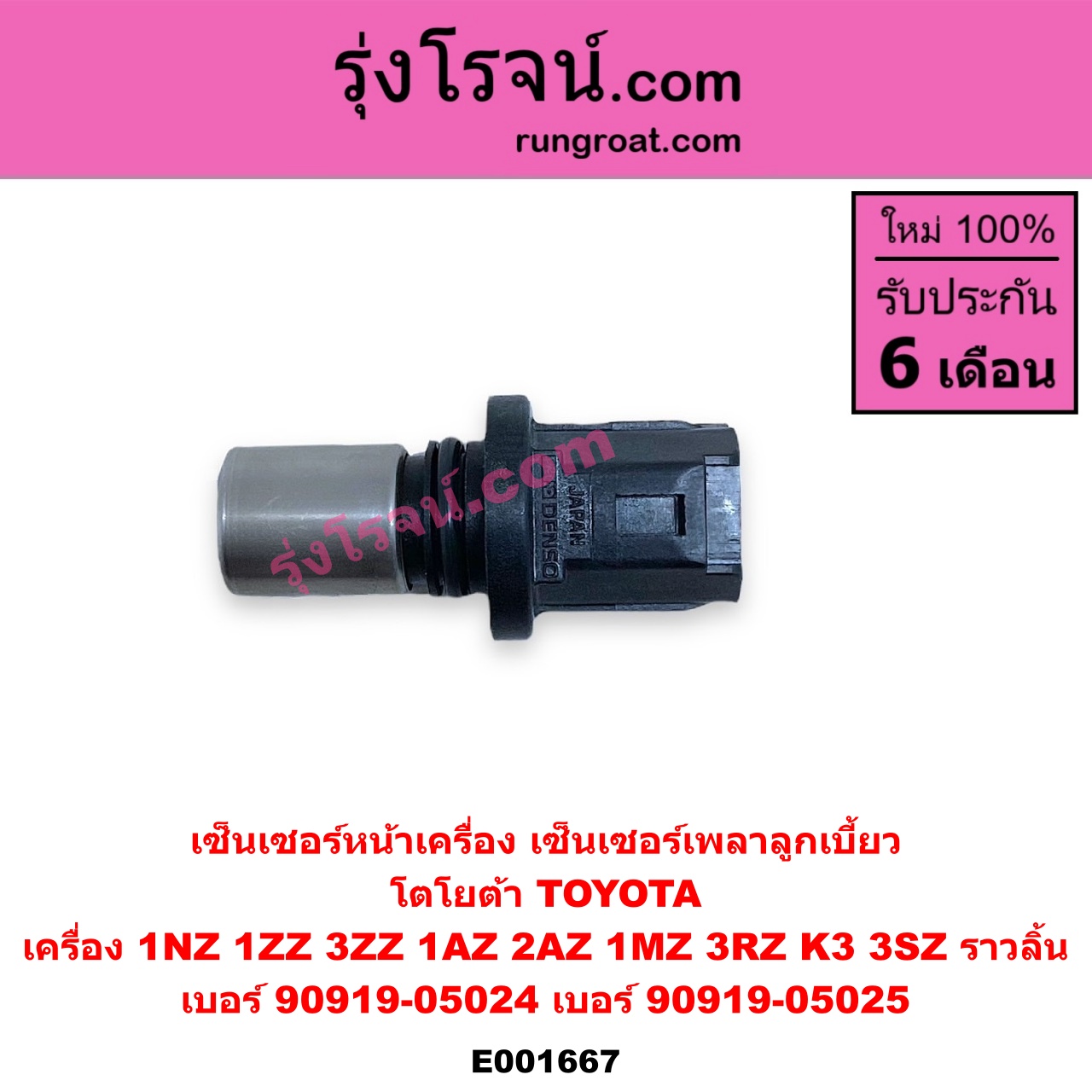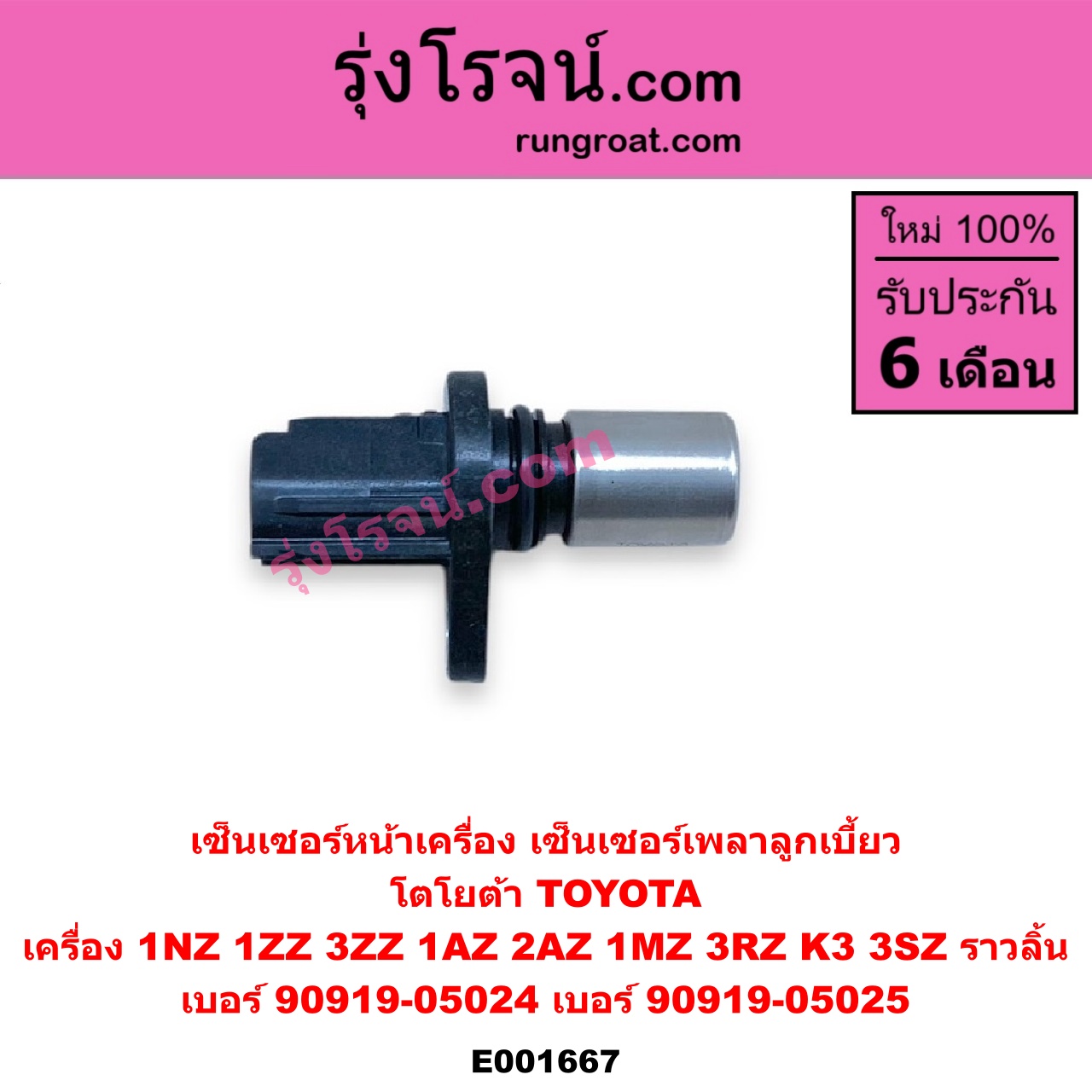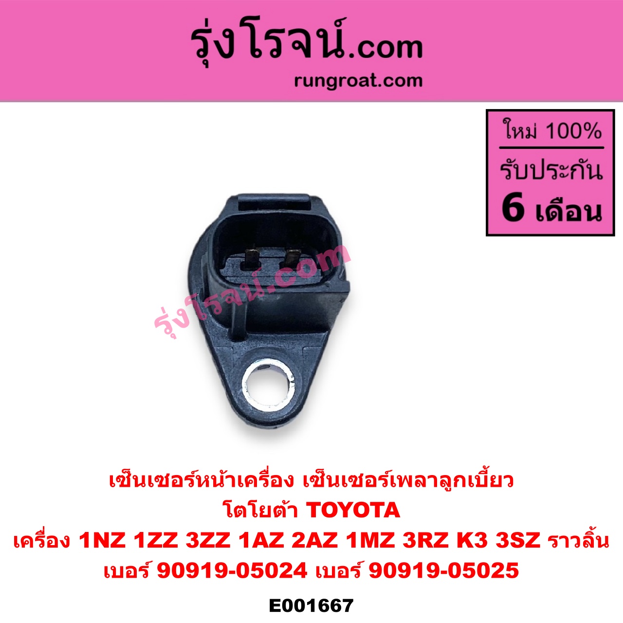 | E001667 | เซ็นเซอร์หน้าเครื่อง (เซ็นเซอร์เพลาข้อเหวี่ยง, เซ็นเซอร์เพลาลูกเบี้ยว) | TOYOTA (โตโยต้า) / * TOYOTA รุ่นอื่นๆ , TOYOTA (โตโยต้า) / ALPHARD / VELLFIRE (อัลพาร์ด / เวลไฟร์ 02) (AH10 รุ่นแรก) , TOYOTA (โตโยต้า) / ALTIS (อัลติส 2001 – 2007) (หน้าหมู รุ่นแรก) , TOYOTA (โตโยต้า) / ALTIS (อัลติส 2008 – 2013) (รุ่น 2, ดูโอ้, DUAL VVTI) , TOYOTA (โตโยต้า) / AVANZA (อแวนซ่า 2004 – 2011) (รุ่นแรก) , TOYOTA (โตโยต้า) / AVANZA (อแวนซ่า 2012 – 2017) (รุ่น 2) , TOYOTA (โตโยต้า) / CAMRY (คัมรี่ แคมรี่ 2003 – 2006) (ผู้นำ, ท้ายหงส์, ACV30) , TOYOTA (โตโยต้า) / CAMRY (คัมรี่ แคมรี่ 2007 – 2011 ไฮบริด) (ACV40) , TOYOTA (โตโยต้า) / HARRIER (แฮริเออร์ MCU10,15) (รุ่นแรก) , TOYOTA (โตโยต้า) / HARRIER (แฮริเออร์ MCU30) (รุ่น 2) , TOYOTA (โตโยต้า) / VIOS (วีออส 2003 – 2006) (รุ่นแรก) , TOYOTA (โตโยต้า) / VIOS (วีออส 2008 – 2012) (รุ่น 2) , TOYOTA (โตโยต้า) / WISH (วิช 2003 – 2010) , TOYOTA (โตโยต้า) / YARIS (ยาริส 2006 – 2012) (รุ่นแรก) |