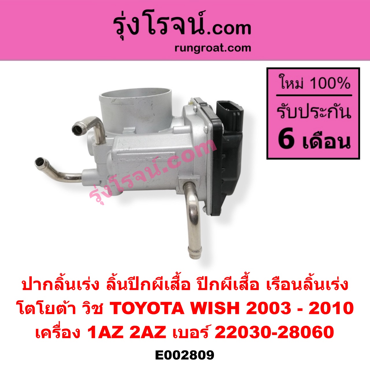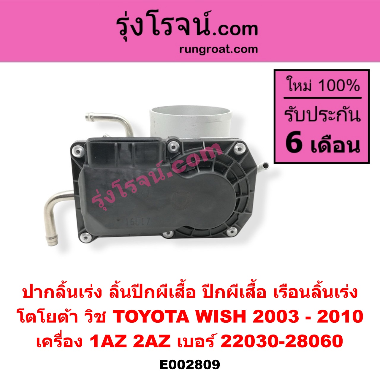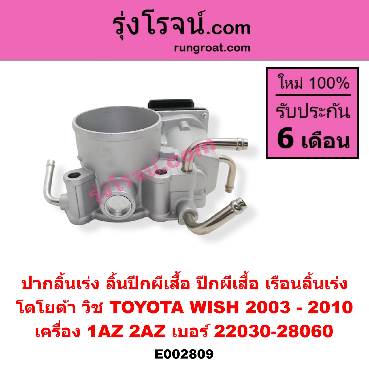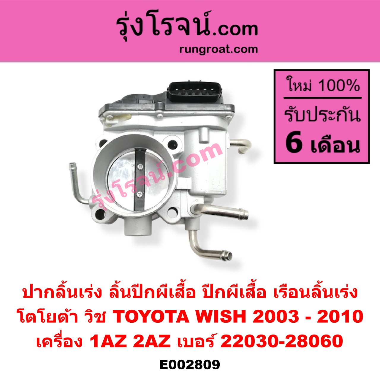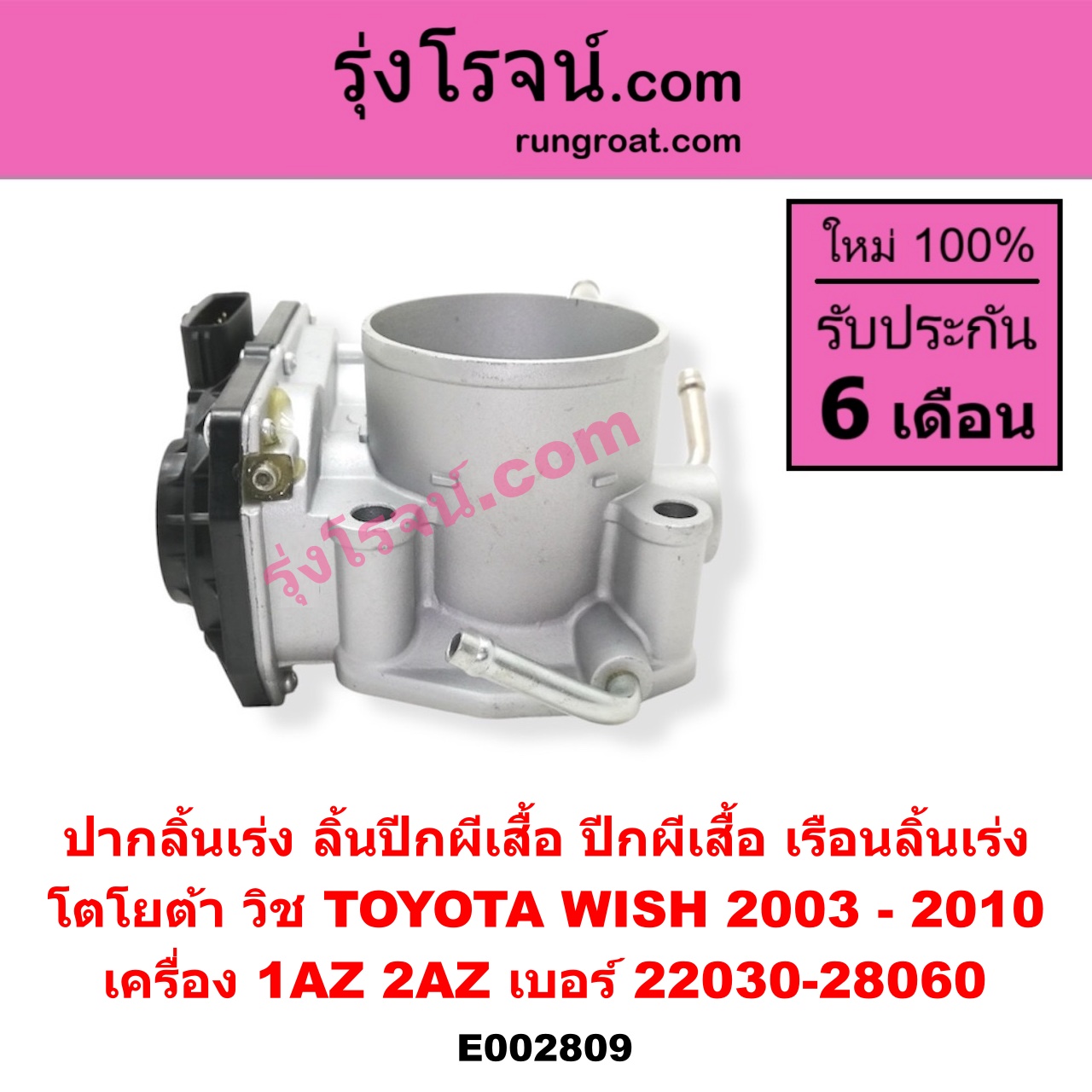 | E002809 | ปากลิ้นเร่ง (ลิ้นปีกผีเสื้อ, ปีกผีเสื้อ, เรือนลิ้นเร่ง) | TOYOTA (โตโยต้า) / WISH (วิช 2003 – 2010) | เครื่อง 1AZ, 2AZ (เบอร์ 22030-28060) | ไต้หวัน (ใหม่) |
