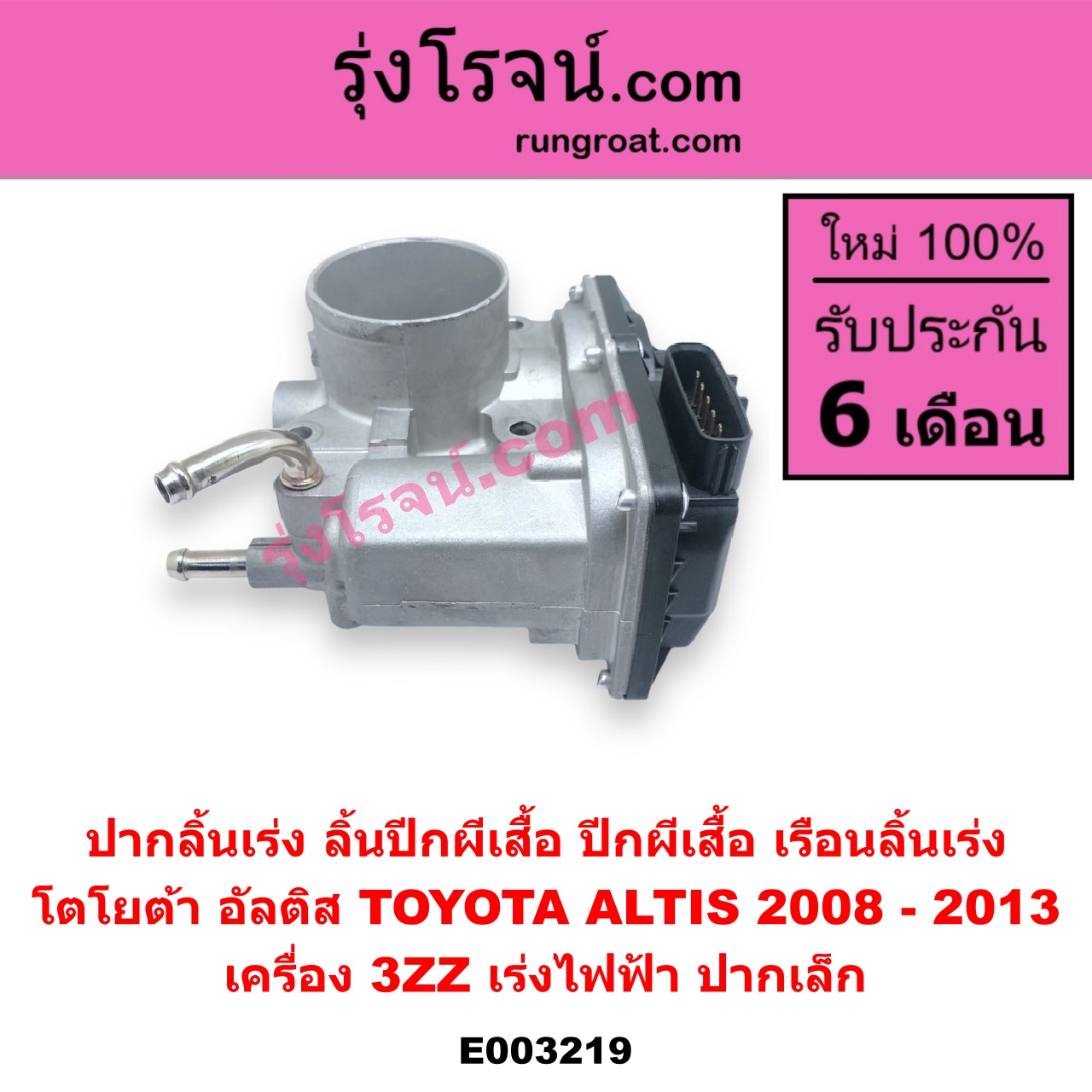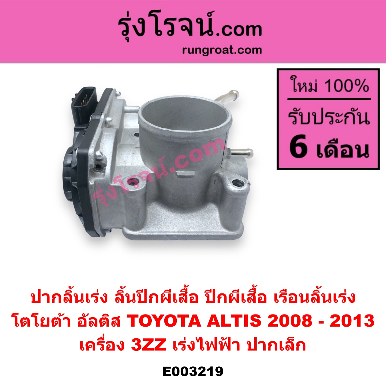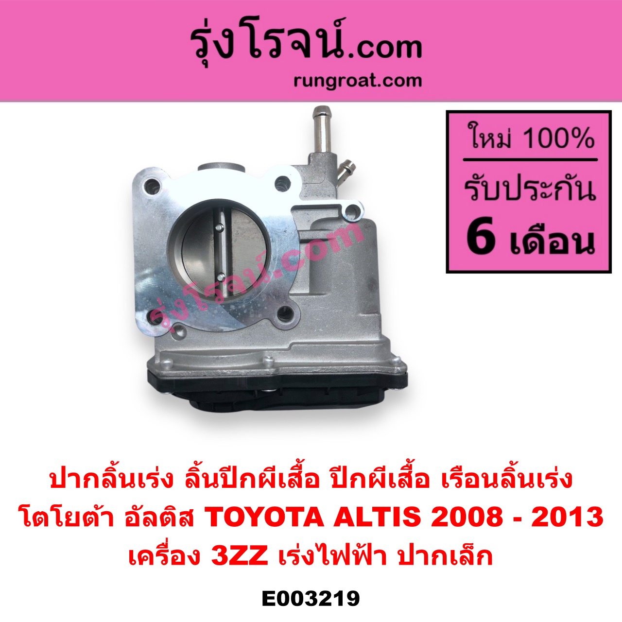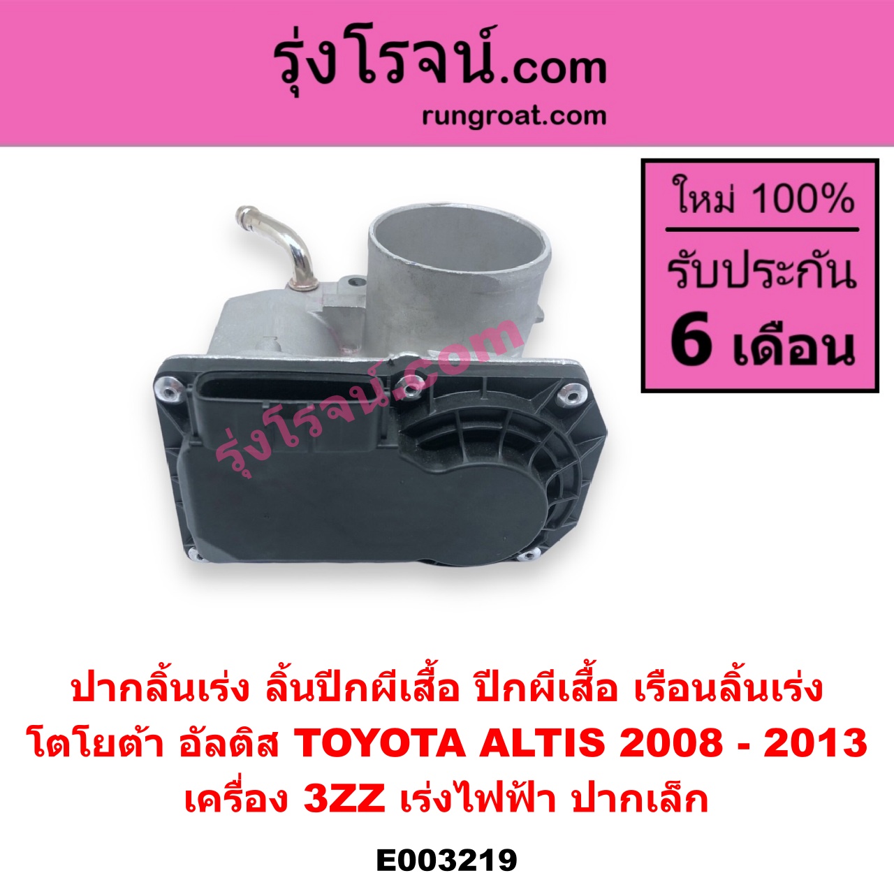 | E003219 | ปากลิ้นเร่ง (ลิ้นปีกผีเสื้อ, ปีกผีเสื้อ, เรือนลิ้นเร่ง) | TOYOTA (โตโยต้า) / ALTIS (อัลติส 2008 – 2013) (รุ่น 2, ดูโอ้, DUAL VVTI) | เครื่อง 3ZZ (เร่งไฟฟ้า ปากเล็ก) | ไต้หวัน (ใหม่) |