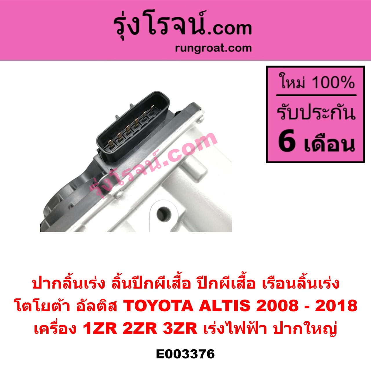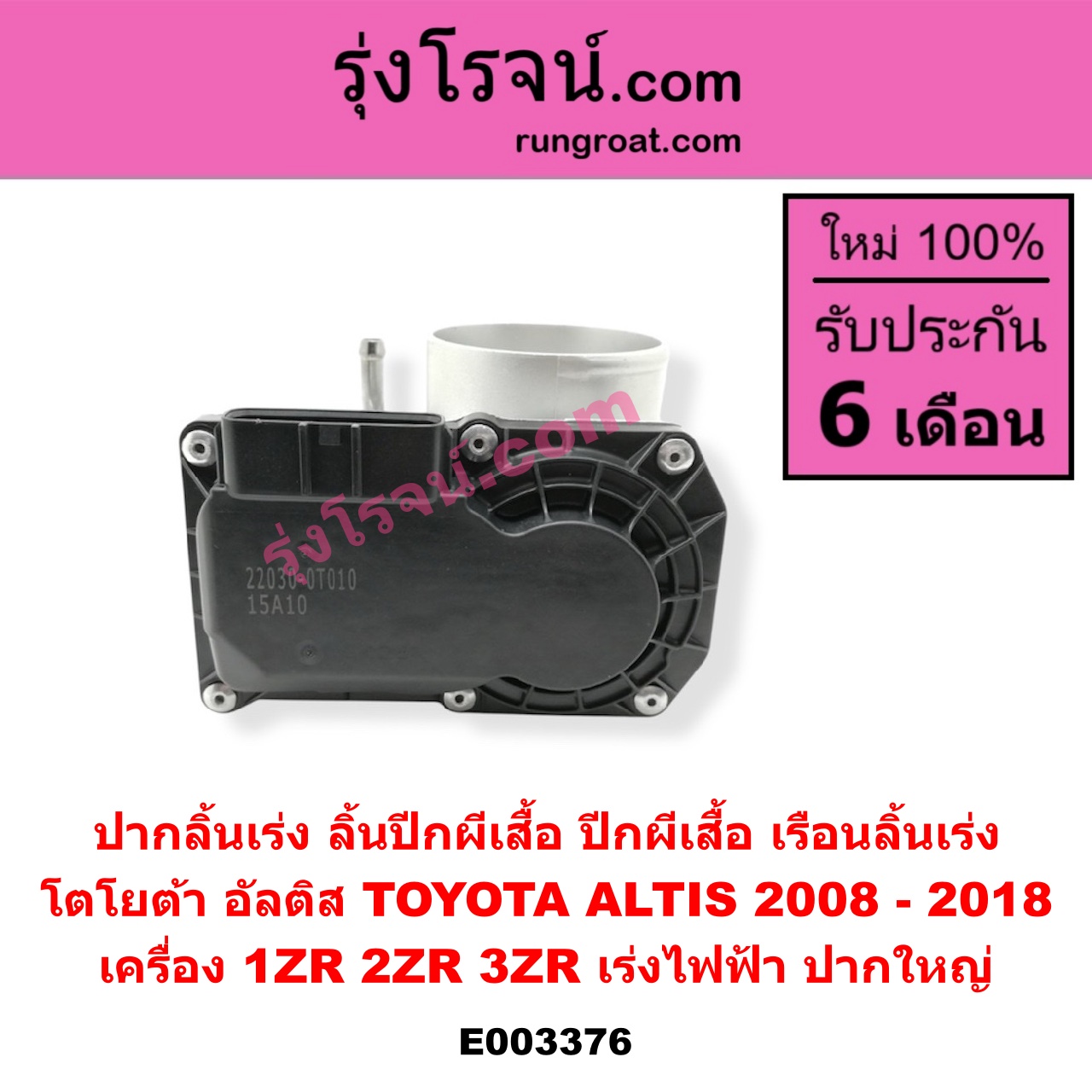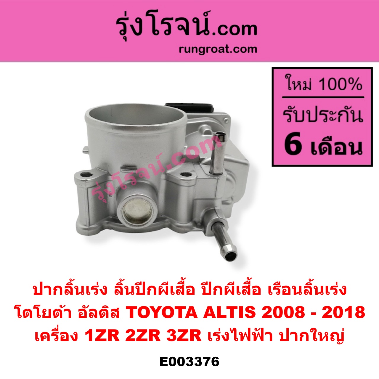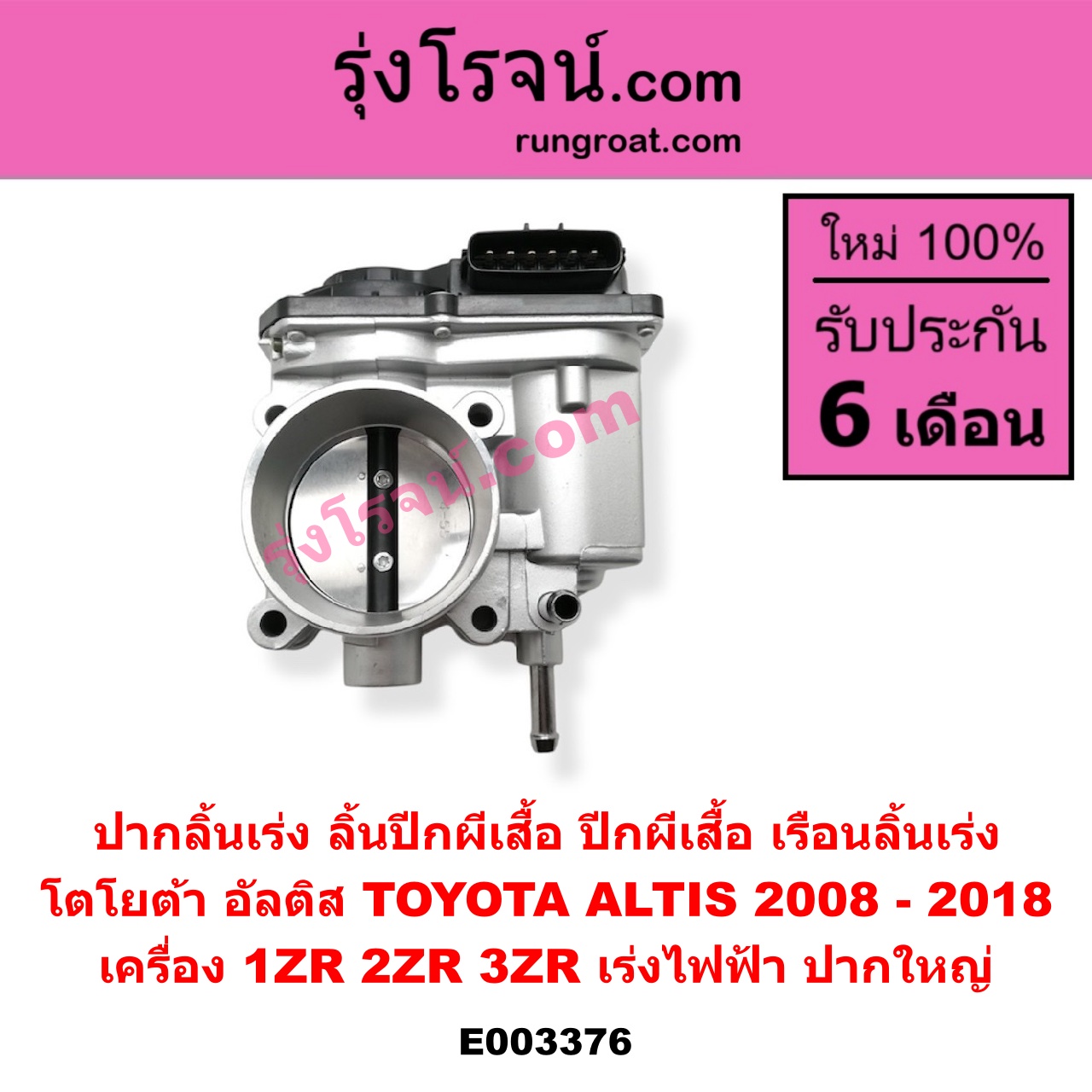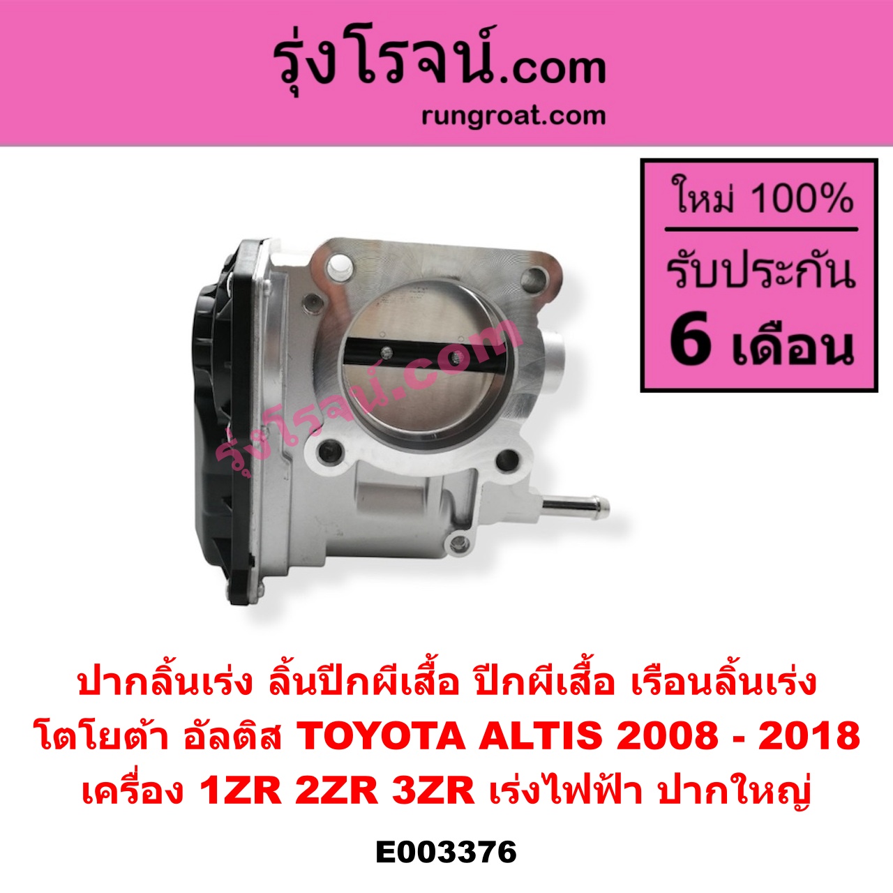 | E003376 | ปากลิ้นเร่ง (ลิ้นปีกผีเสื้อ, ปีกผีเสื้อ, เรือนลิ้นเร่ง) | TOYOTA (โตโยต้า) / ALTIS (อัลติส 2008 – 2013) (รุ่น 2, ดูโอ้, DUAL VVTI) , TOYOTA (โตโยต้า) / ALTIS (อัลติส 2014 – 2018) (รุ่น 3) |