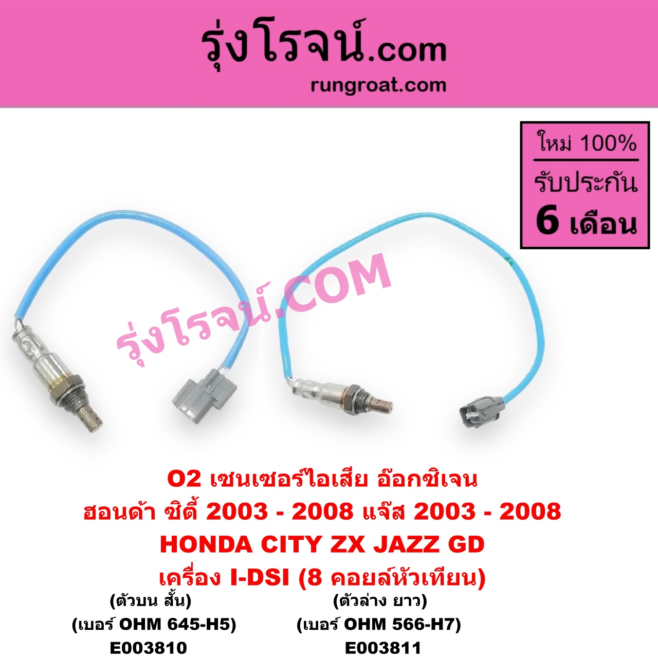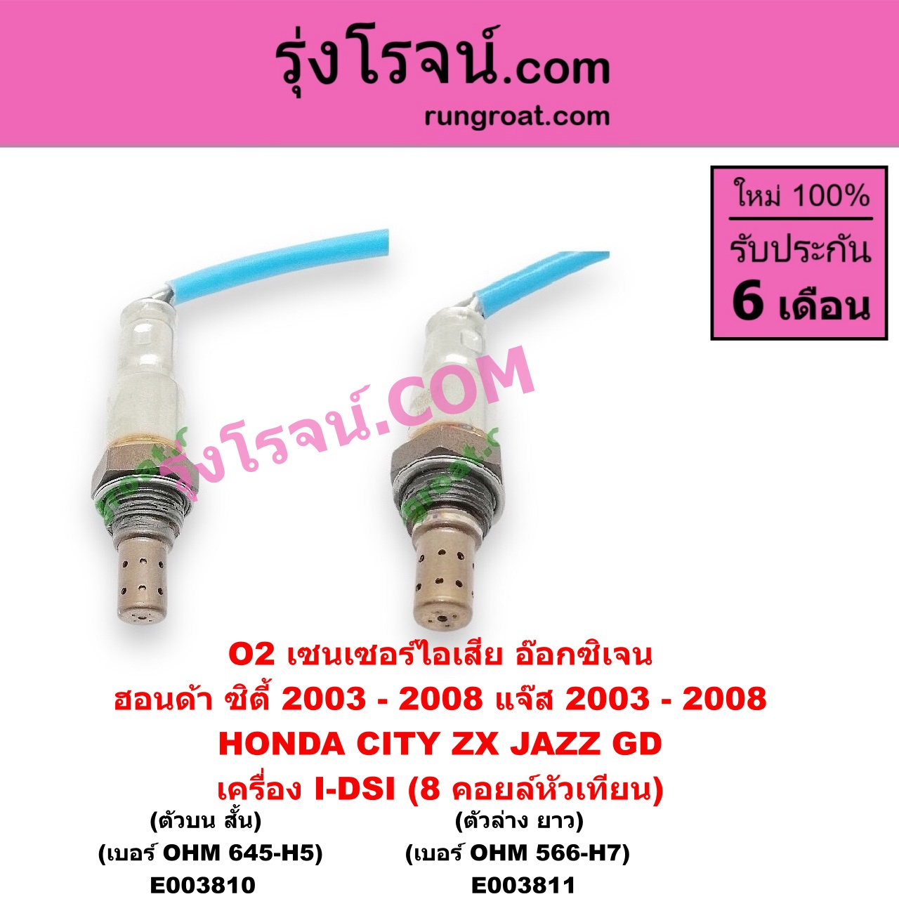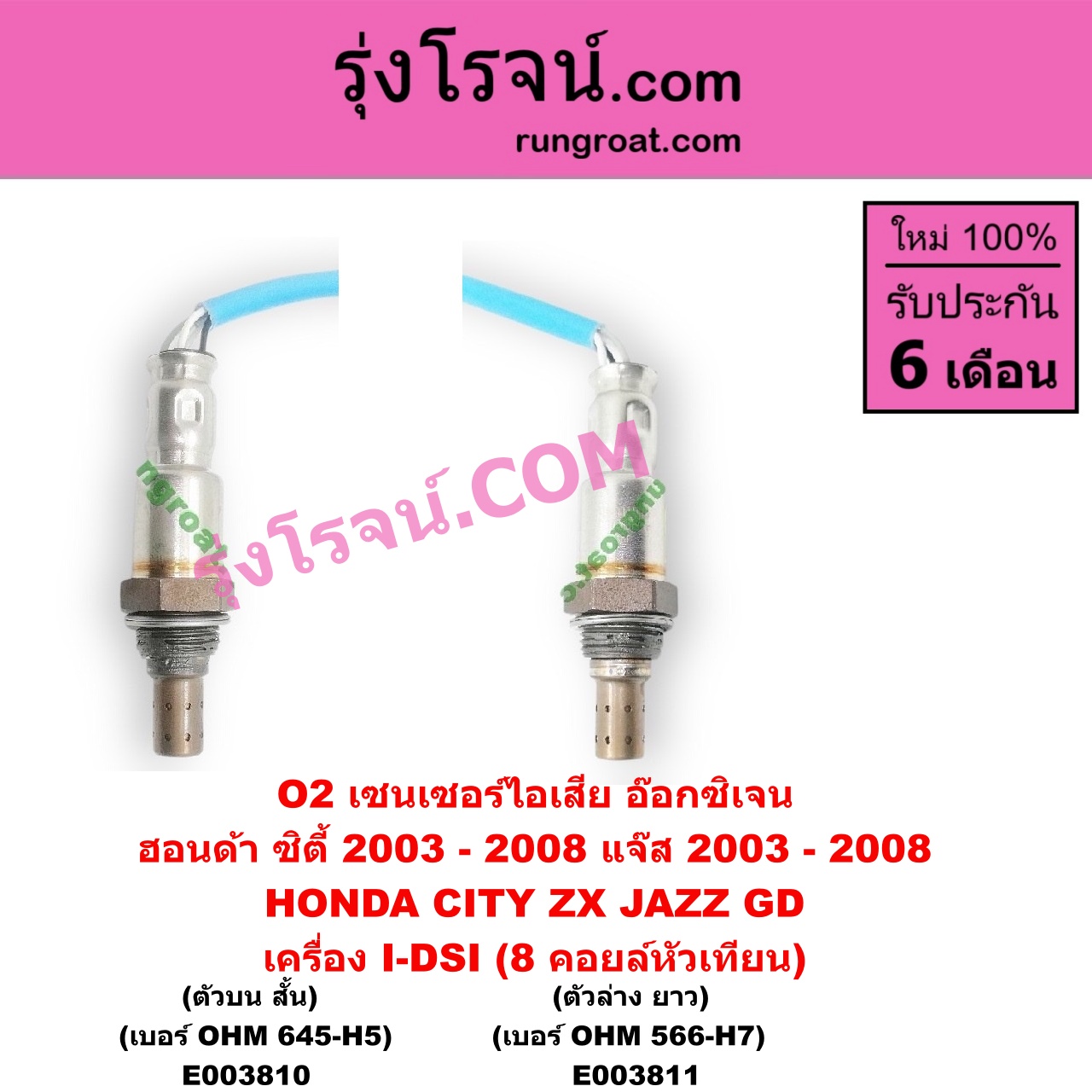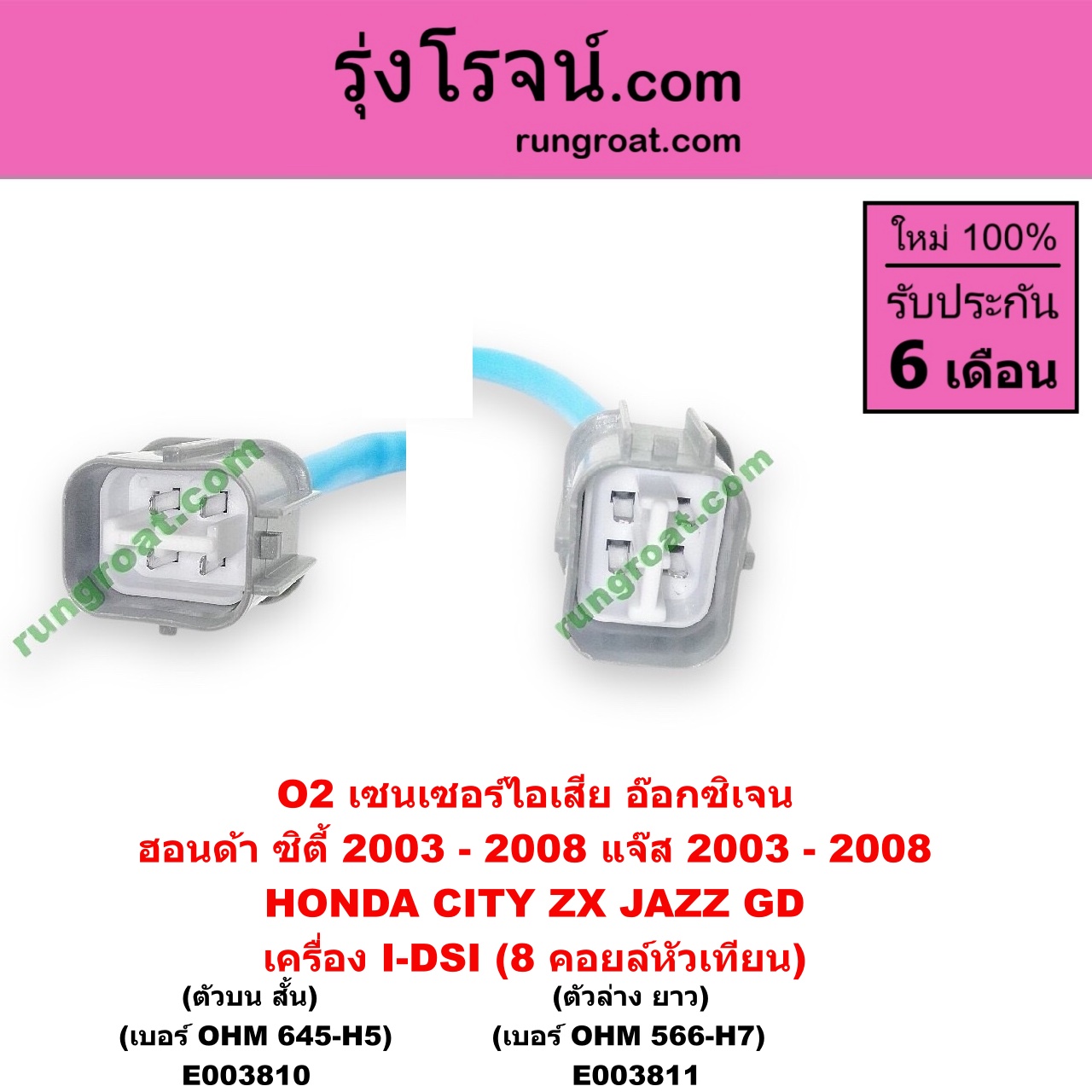 E003810 เซนเซอร์ไอเสีย อ๊อกซิเจน HONDA ฮอนด้า CITY ซิตี้ 2003 – 2008 แมลงสาบ ZX JAZZ แจ๊ส 2003 – 2008 GD เครื่อง I-DSI 8 คอยล์หัวเทียน ตัวบน สั้น เบอร์ OHM 645-H5