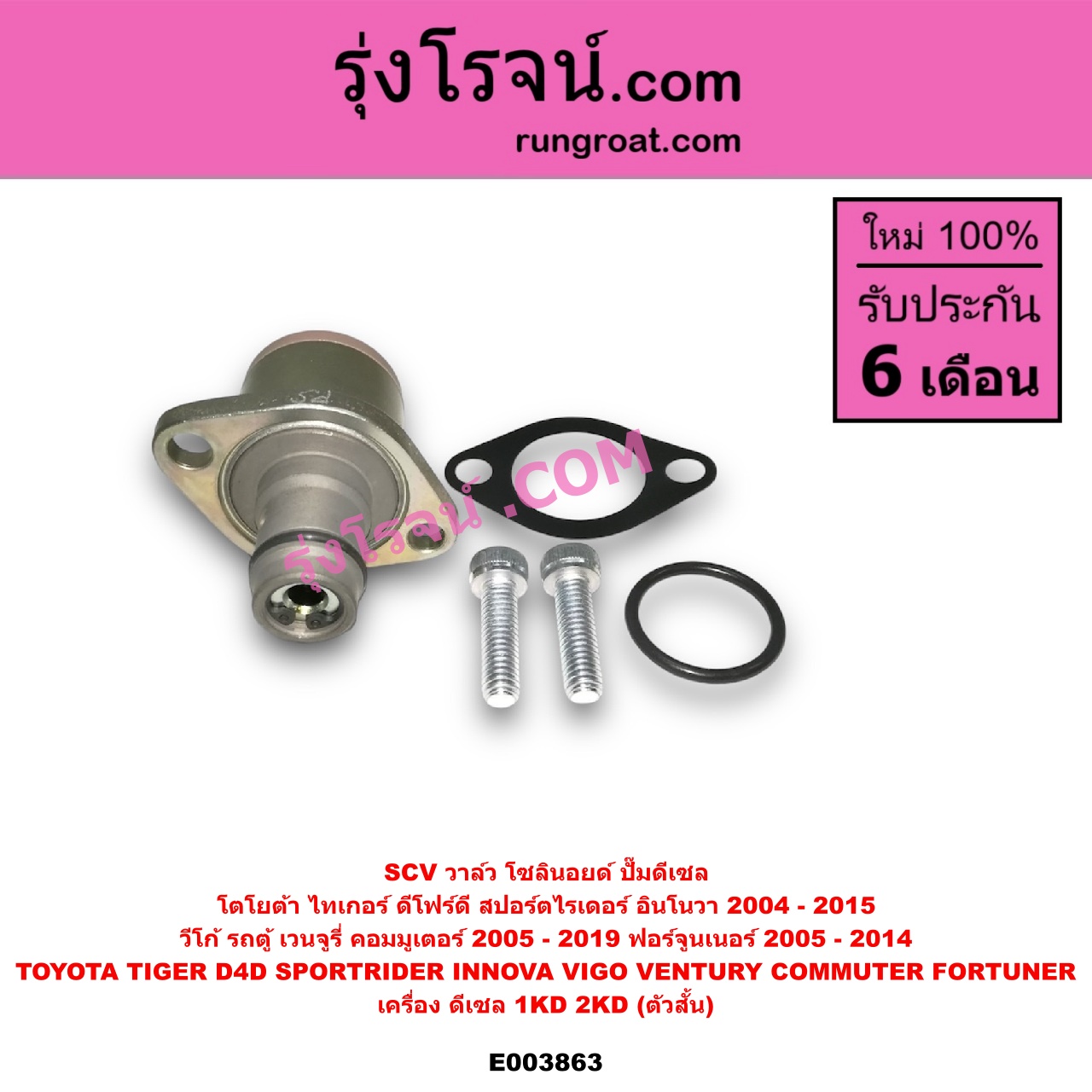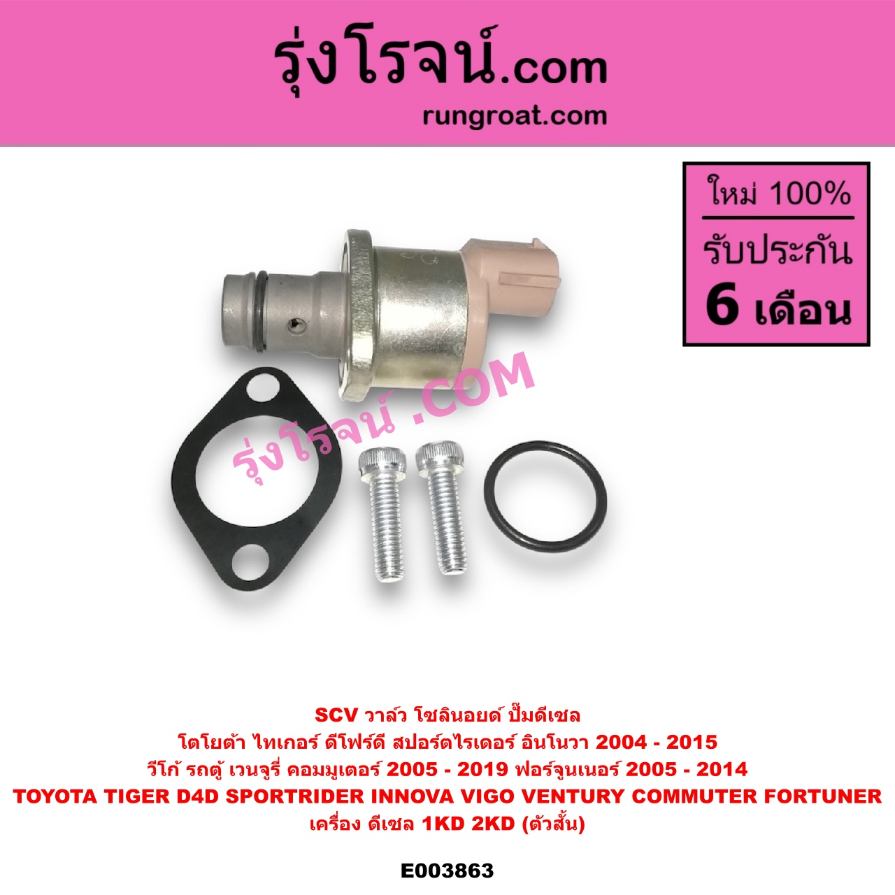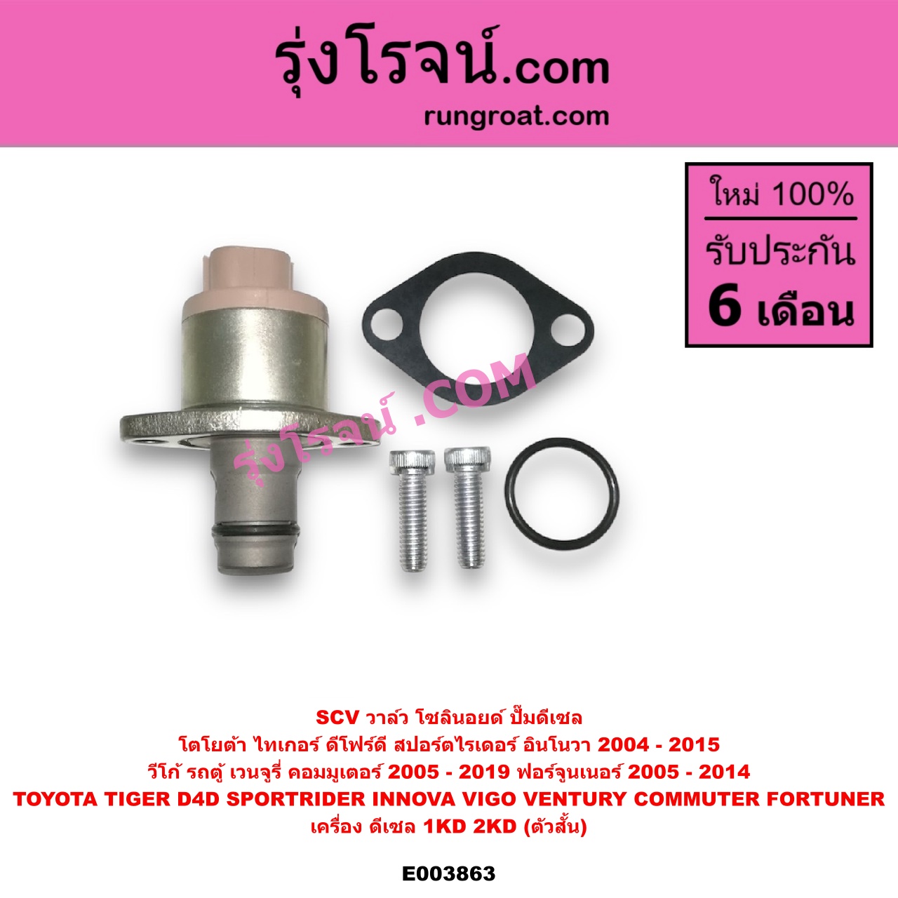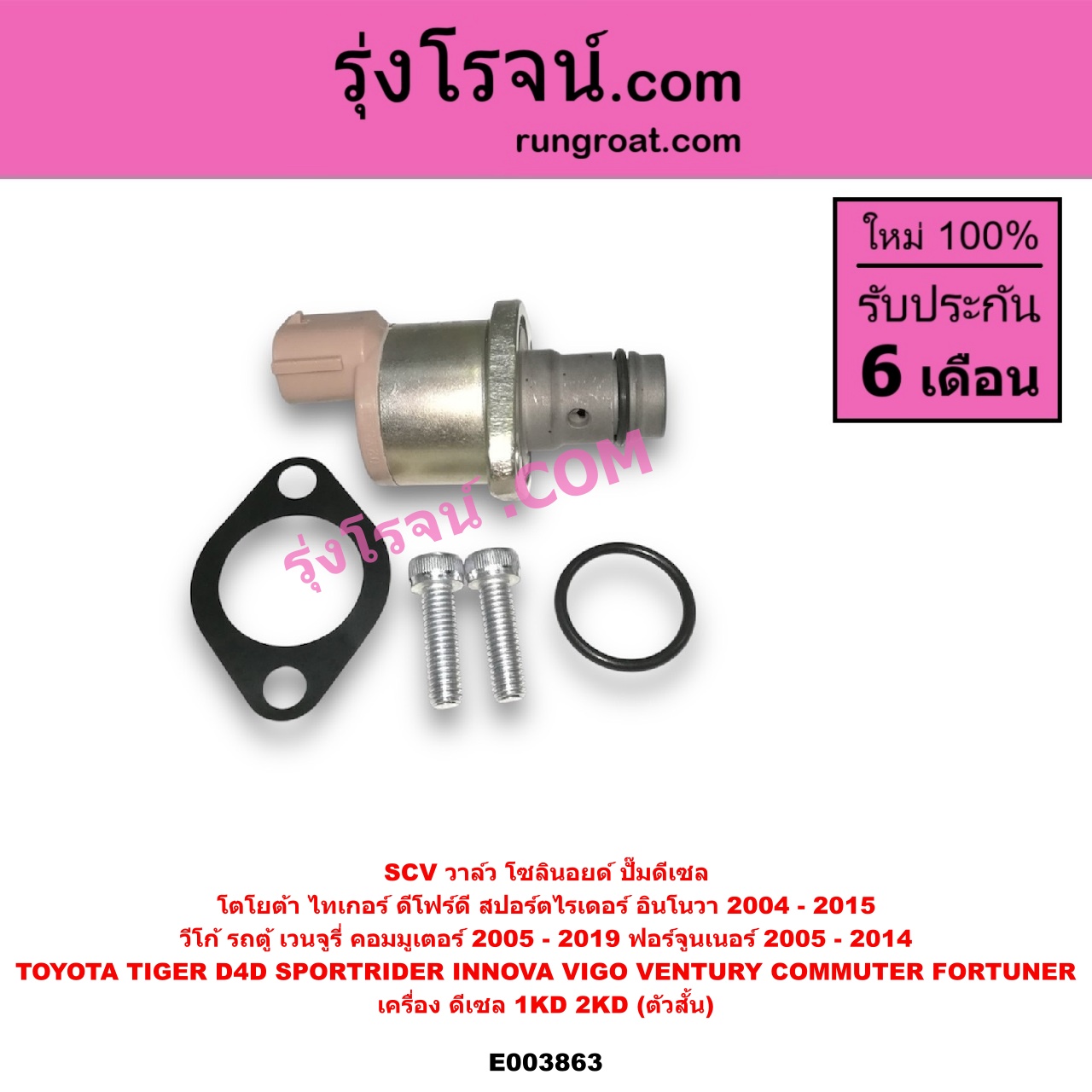 | E003863 | SCV วาล์ว (โซลินอยด์ ปั๊มดีเซล) | TOYOTA (โตโยต้า) / COMMUTER (รถตู้ คอมมิวเตอร์ คอมมูเตอร์ 2005 – 2019) , TOYOTA (โตโยต้า) / FORTUNER (ฟอร์จูนเนอร์ 2005 – 2014) (รุ่นแรก) , TOYOTA (โตโยต้า) / INNOVA (อินโนวา 2004 – 2015) , TOYOTA (โตโยต้า) / SPORTRIDER (สปอร์ตไรเดอร์) , TOYOTA (โตโยต้า) / TIGER/TIGER D4D (ไทเกอร์ / ไทเกอร์ ดีโฟร์ดี) , TOYOTA (โตโยต้า) / VENTURY (เวนจูรี่) , TOYOTA (โตโยต้า) / VIGO (วีโก้ 2004 – 2015) |
