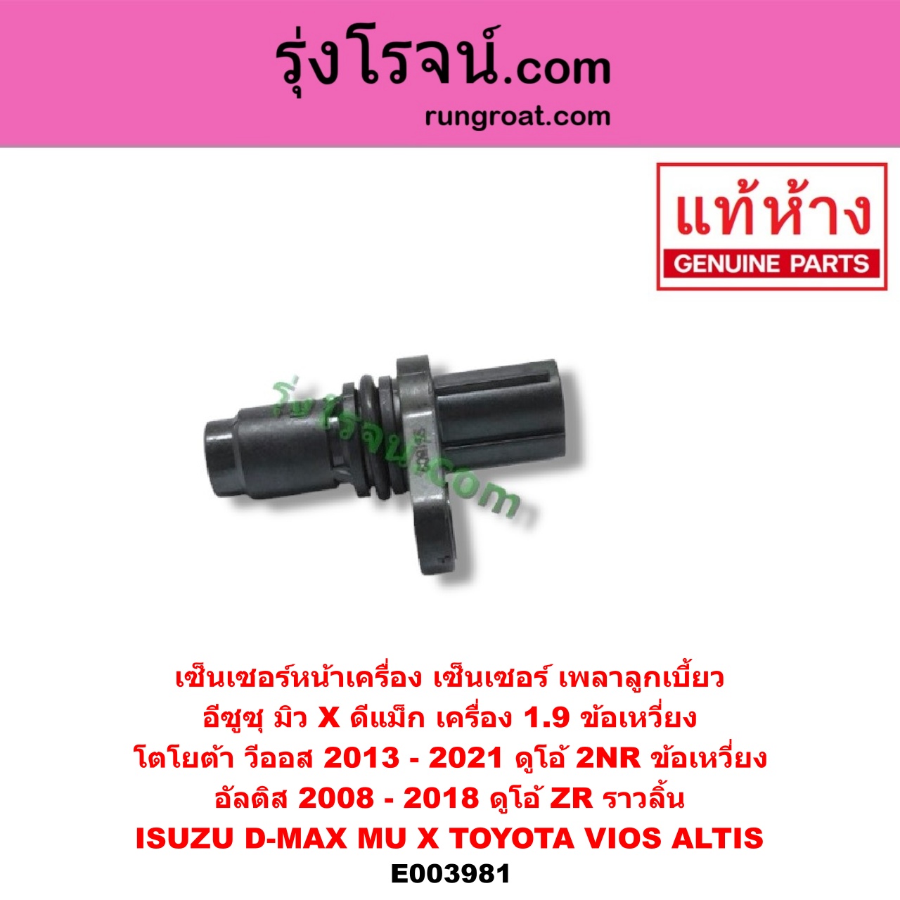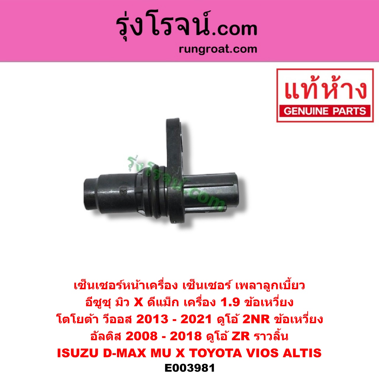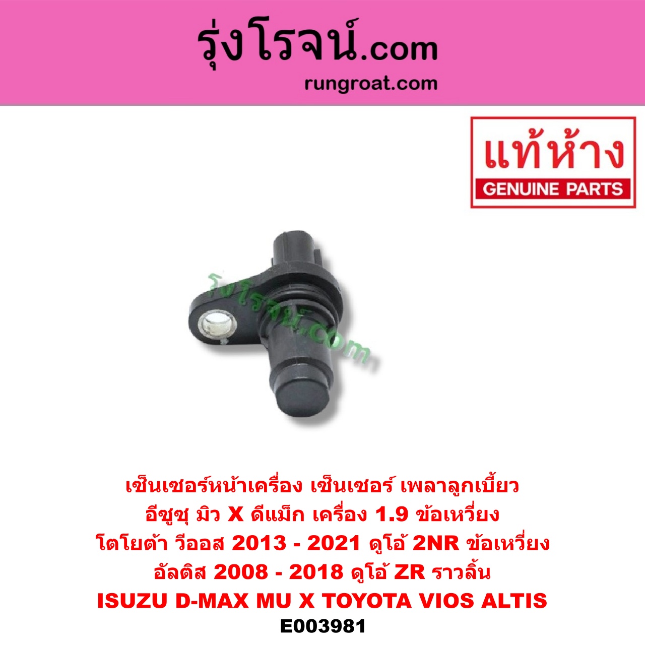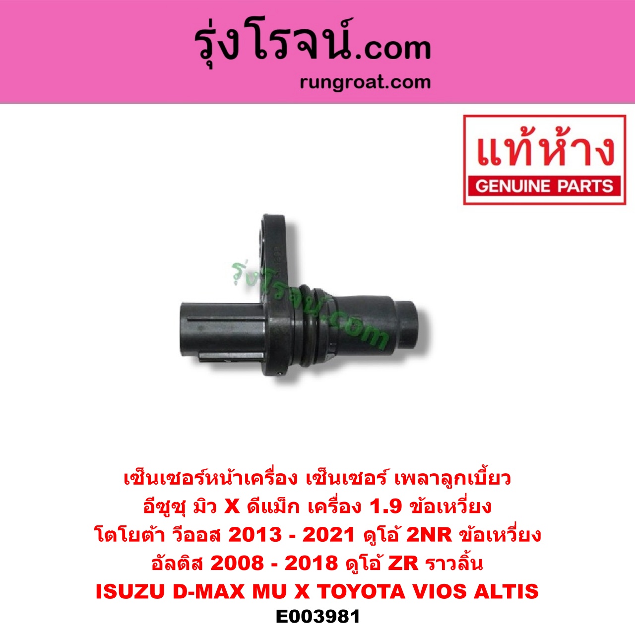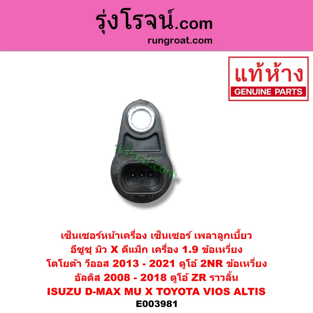 | E003981 | เซ็นเซอร์หน้าเครื่อง (เซ็นเซอร์เพลาข้อเหวี่ยง, เซ็นเซอร์เพลาลูกเบี้ยว) | ISUZU (อีซูซุ) / D-MAX (ออนิว ออลนิว ดีแม็ก ดีแม็ค DMAX 2012 / 2016) (วีครอส V-CROSS / บลูเพาเวอร์ / 1.9) , ISUZU (อีซูซุ) / MU X (มิว X 14) , TOYOTA (โตโยต้า) / ALTIS (อัลติส 2008 – 2013) (รุ่น 2, ดูโอ้, DUAL VVTI) , TOYOTA (โตโยต้า) / ALTIS (อัลติส 2014 – 2019) (รุ่น 3) , TOYOTA (โตโยต้า) / VIOS (วีออส 2013 – 2021) (รุ่น 3) |