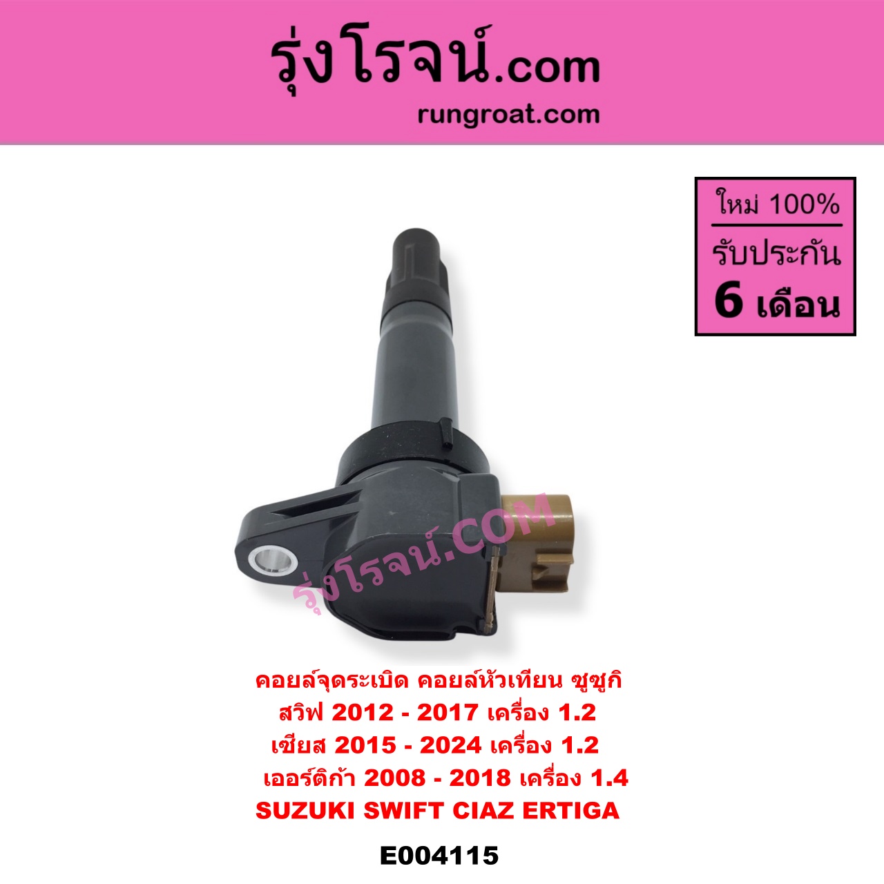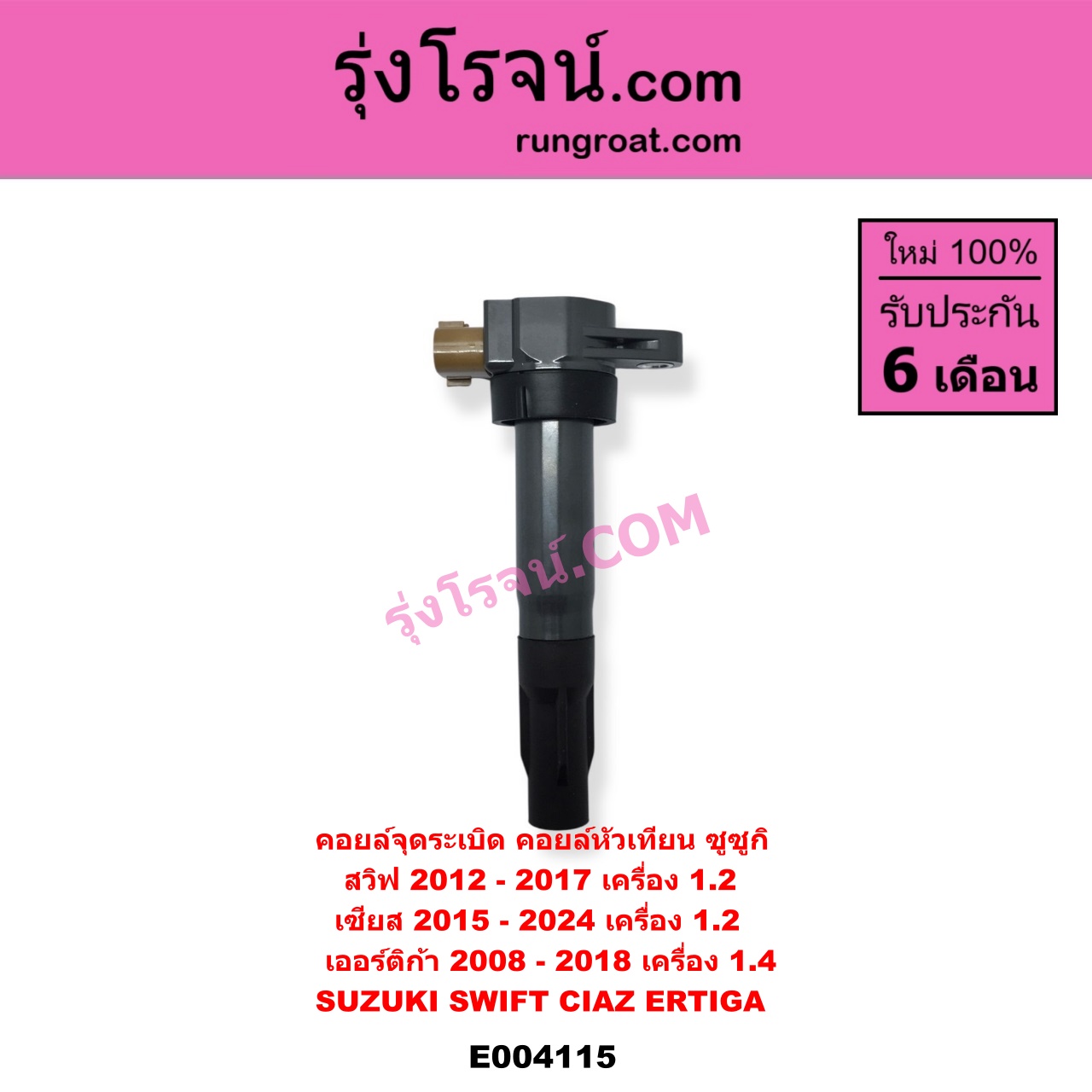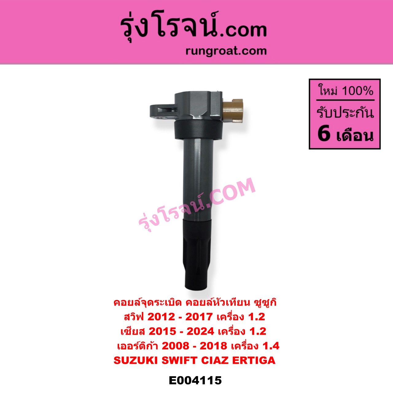 | E004115 | คอยล์จุดระเบิด (คอยล์หัวเทียน) | SUZUKI (ซูซูกิ) / CIAZ (เซียส, ซีอาส 2015 – 2024) , SUZUKI (ซูซูกิ) / ERTIGA (เออร์ติก้า) (รุ่นแรก 2008 – 2018) , SUZUKI (ซูซูกิ) / SWIFT (สวิฟ 2012 – 2017) (รุ่น 2 เครื่อง 1.2) |