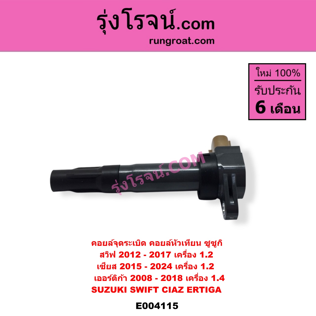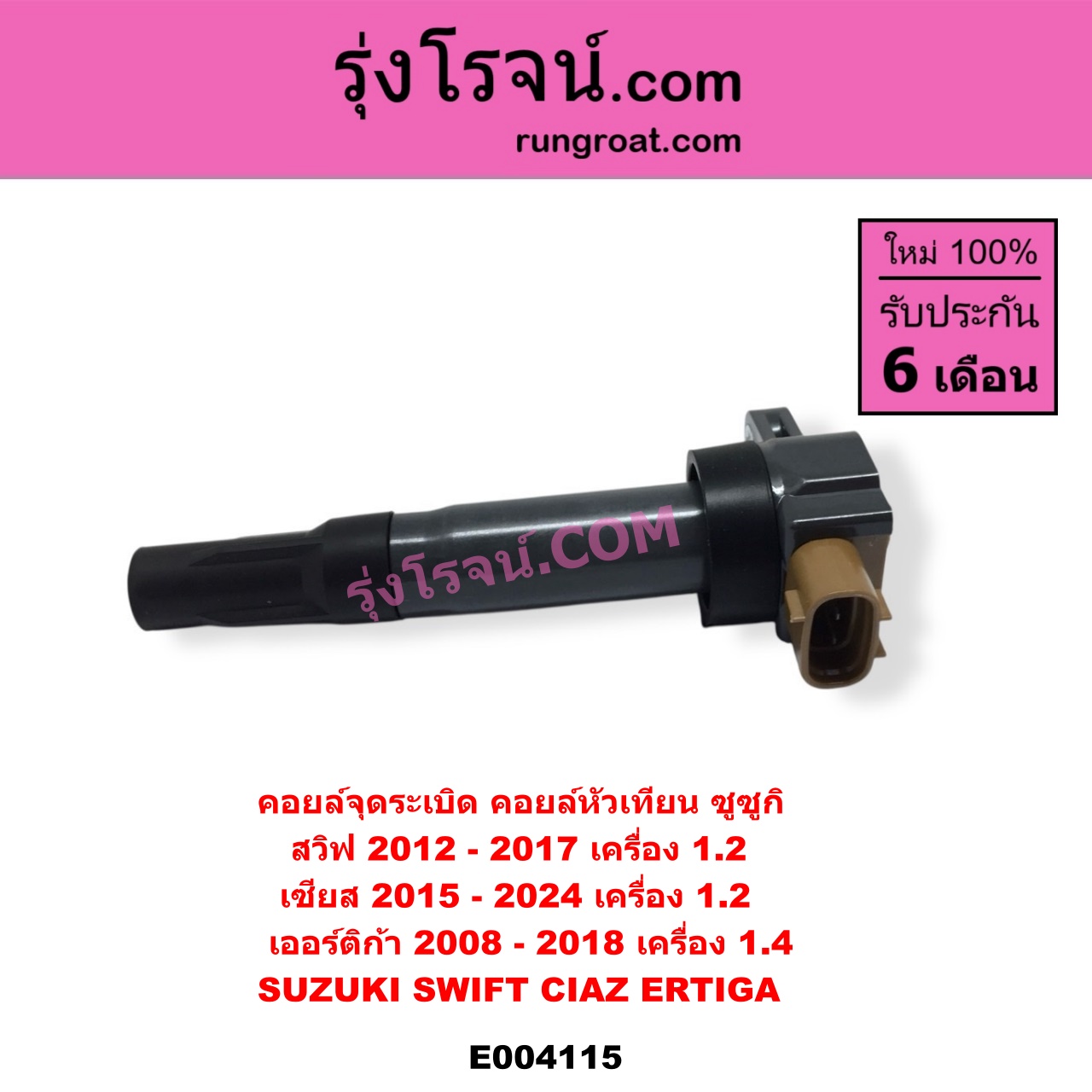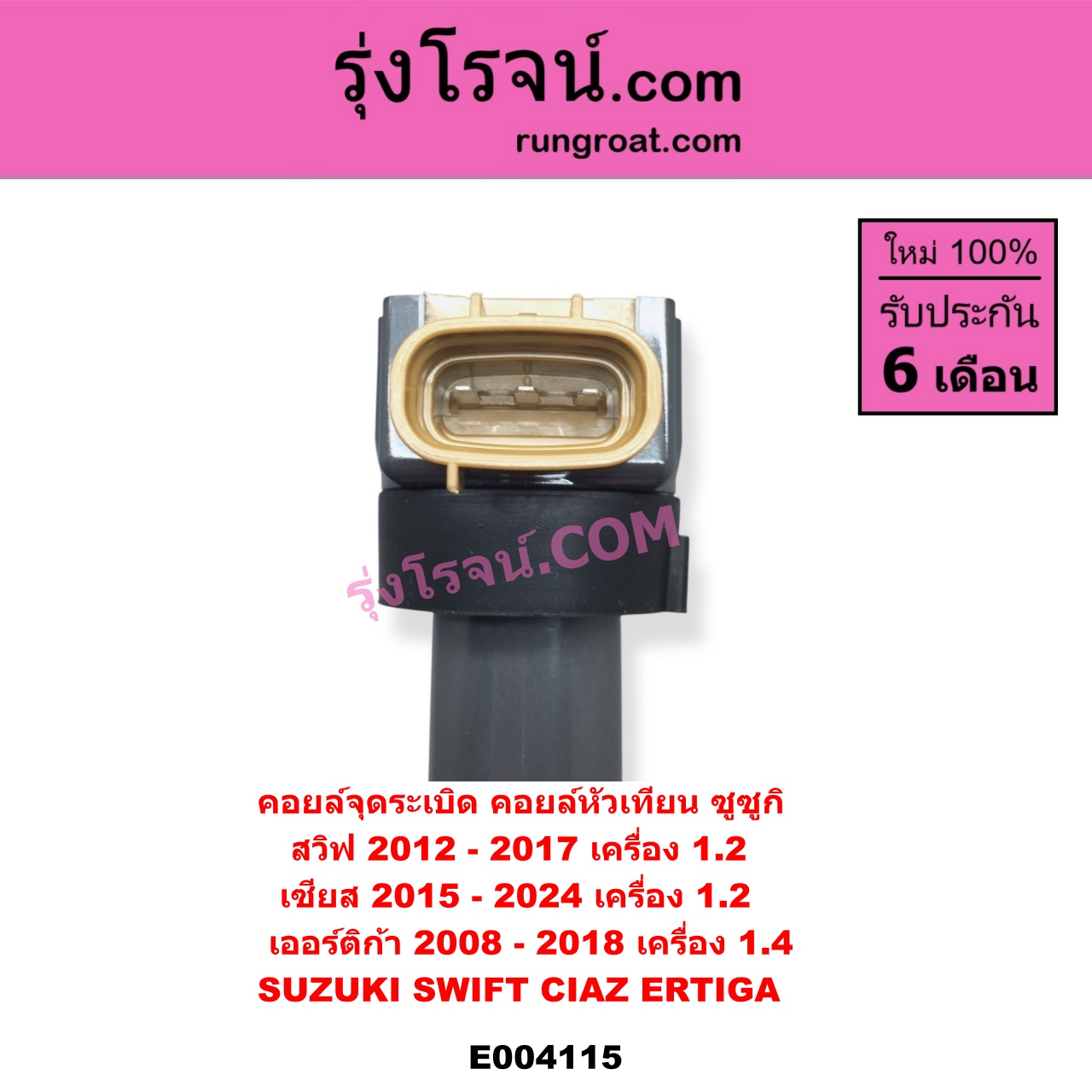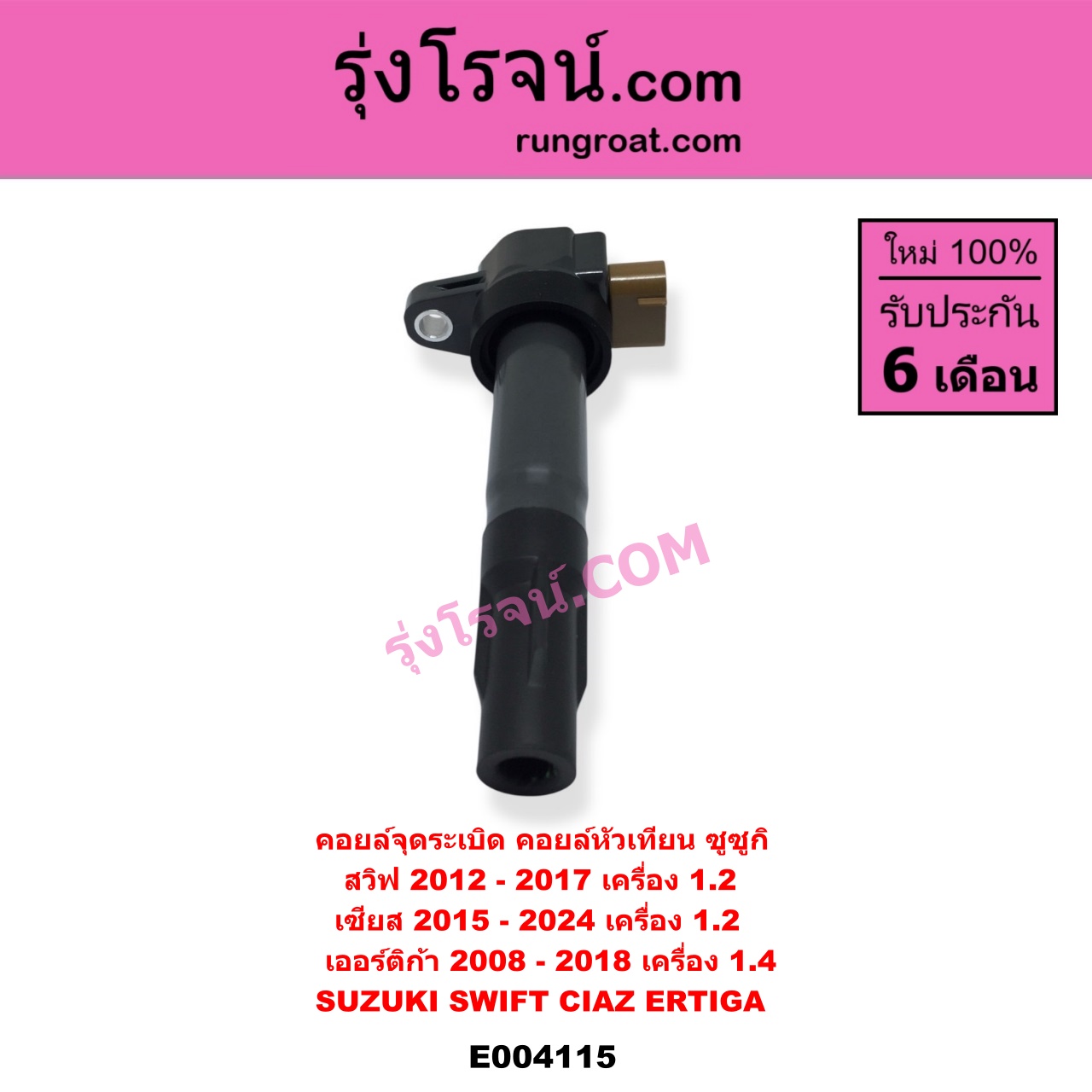 | E004115 | คอยล์จุดระเบิด (คอยล์หัวเทียน) | SUZUKI (ซูซูกิ) / CIAZ (เซียส, ซีอาส 2015 – 2024) , SUZUKI (ซูซูกิ) / ERTIGA (เออร์ติก้า) (รุ่นแรก 2008 – 2018) , SUZUKI (ซูซูกิ) / SWIFT (สวิฟ 2012 – 2017) (รุ่น 2 เครื่อง 1.2) |