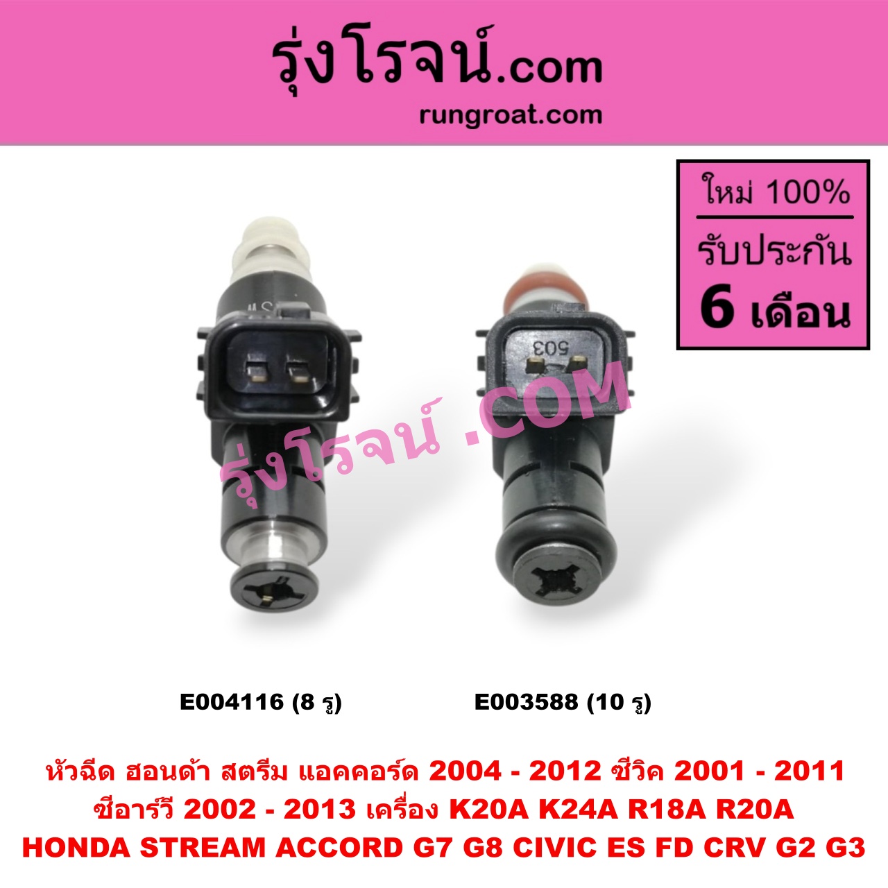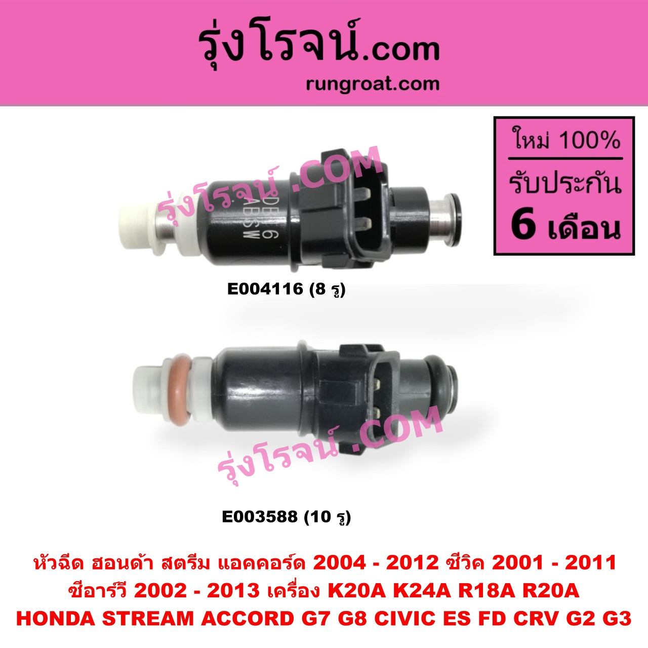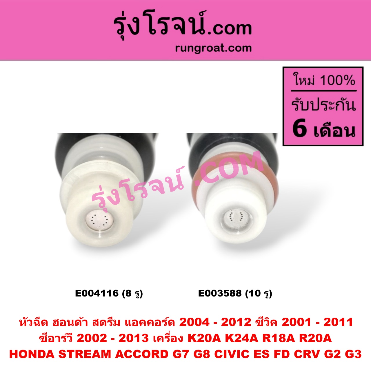 E004116 หัวฉีด (หัวละ) HONDA (ฮอนด้า) / ACCORD (แอคคอร์ด 04/06) (ปลาวาฬ / G7) , ACCORD (แอคคอร์ด 08/10) (G8) , CIVIC (ซีวิค 01/04) (ไดเมนชั่น) (ES) , CIVIC (ซีวิค 06/09) (FD / นางฟ้า) , CRV (ซีอาร์วี 02/05) (รุ่น 2 ไฟท้ายยาว) , CRV (ซีอาร์วี 08/10) (รุ่น 3) ,STREAM (สตรีม 01) เครื่อง K20A, K24A, R18A, R20A (8 รู)