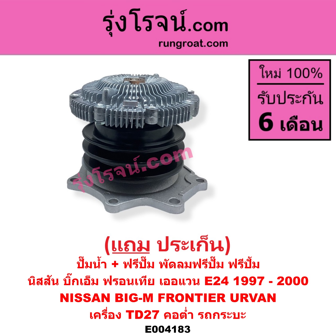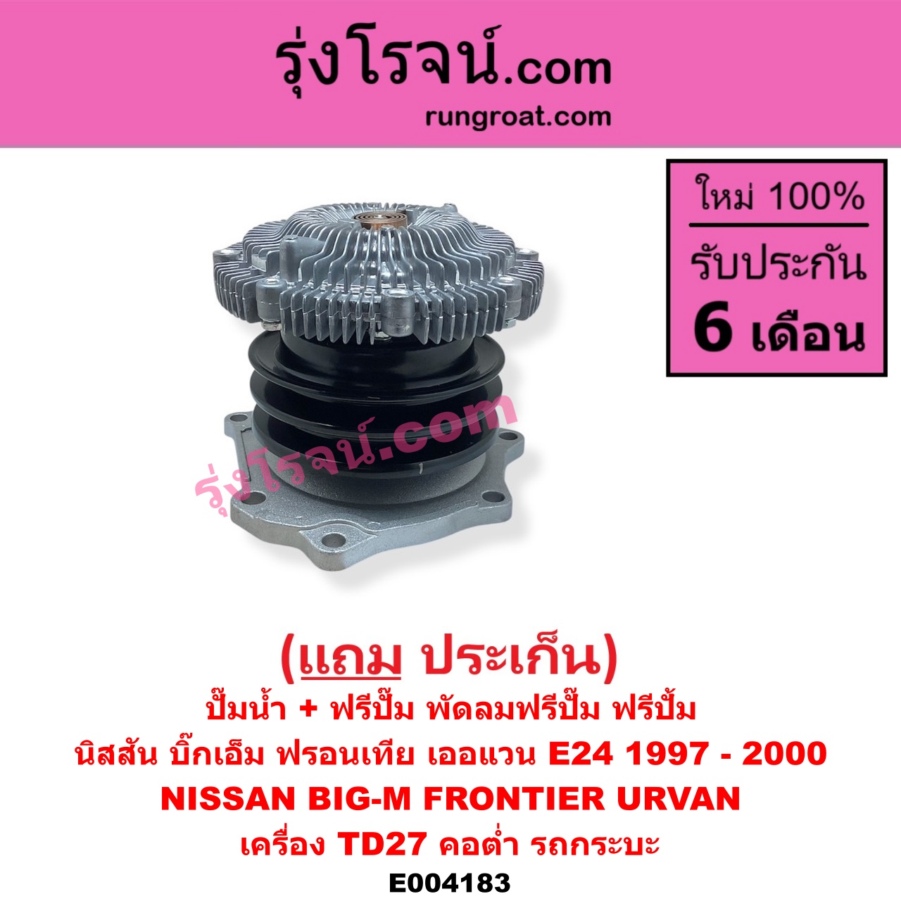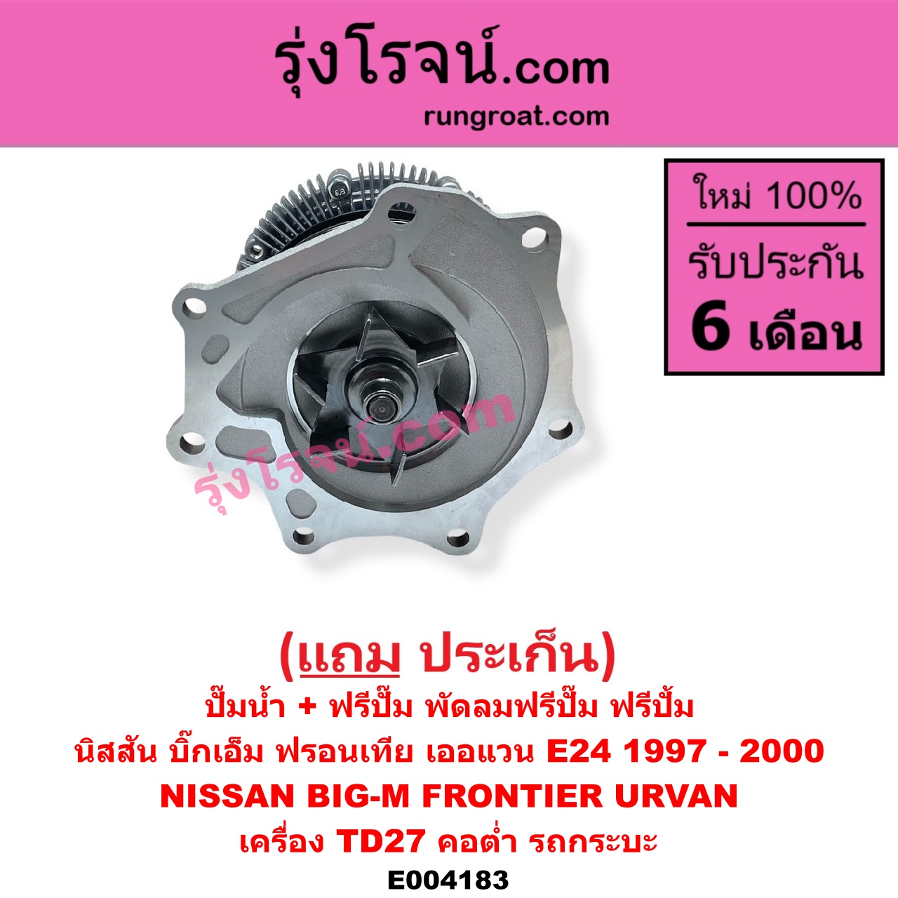 | E004183 | ปั๊มน้ำ + ฟรีปั๊ม (พัดลมฟรีปั๊ม ฟรีปั้ม) | NISSAN (นิสสัน) / BIG-M (บิ๊กเอ็ม TD, BDI/925/993) , NISSAN (นิสสัน) / URVAN (เออแวน E24 97/99) |