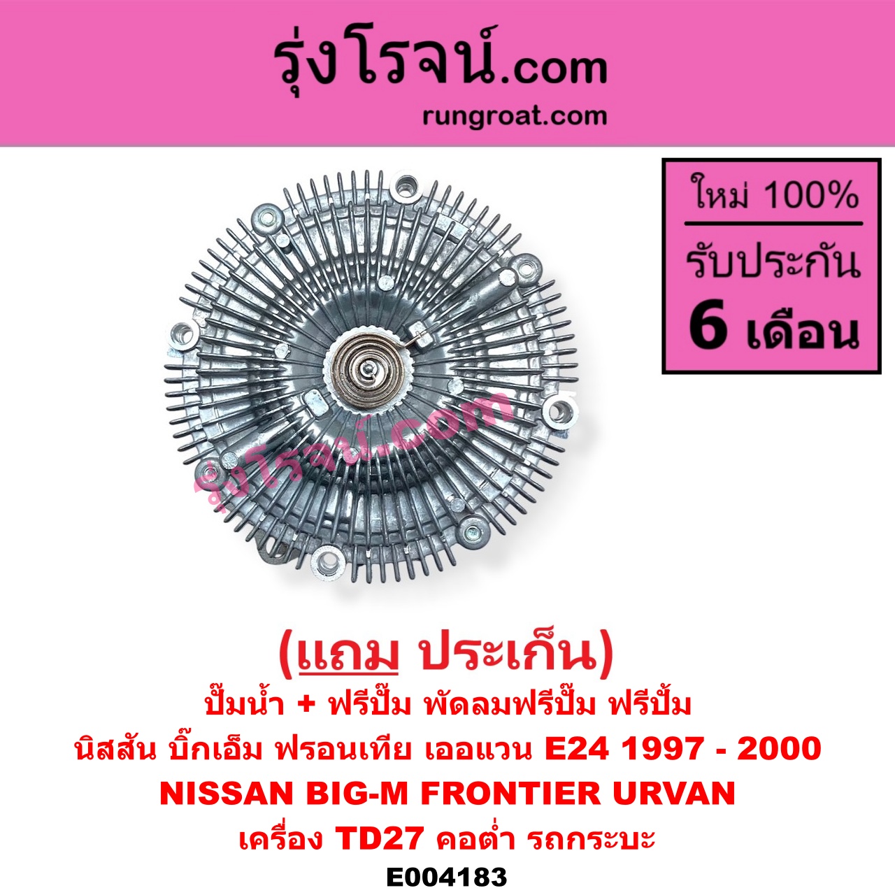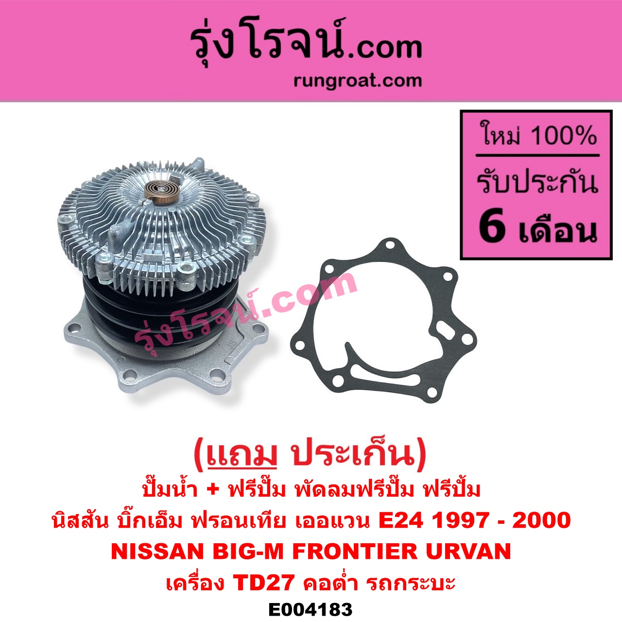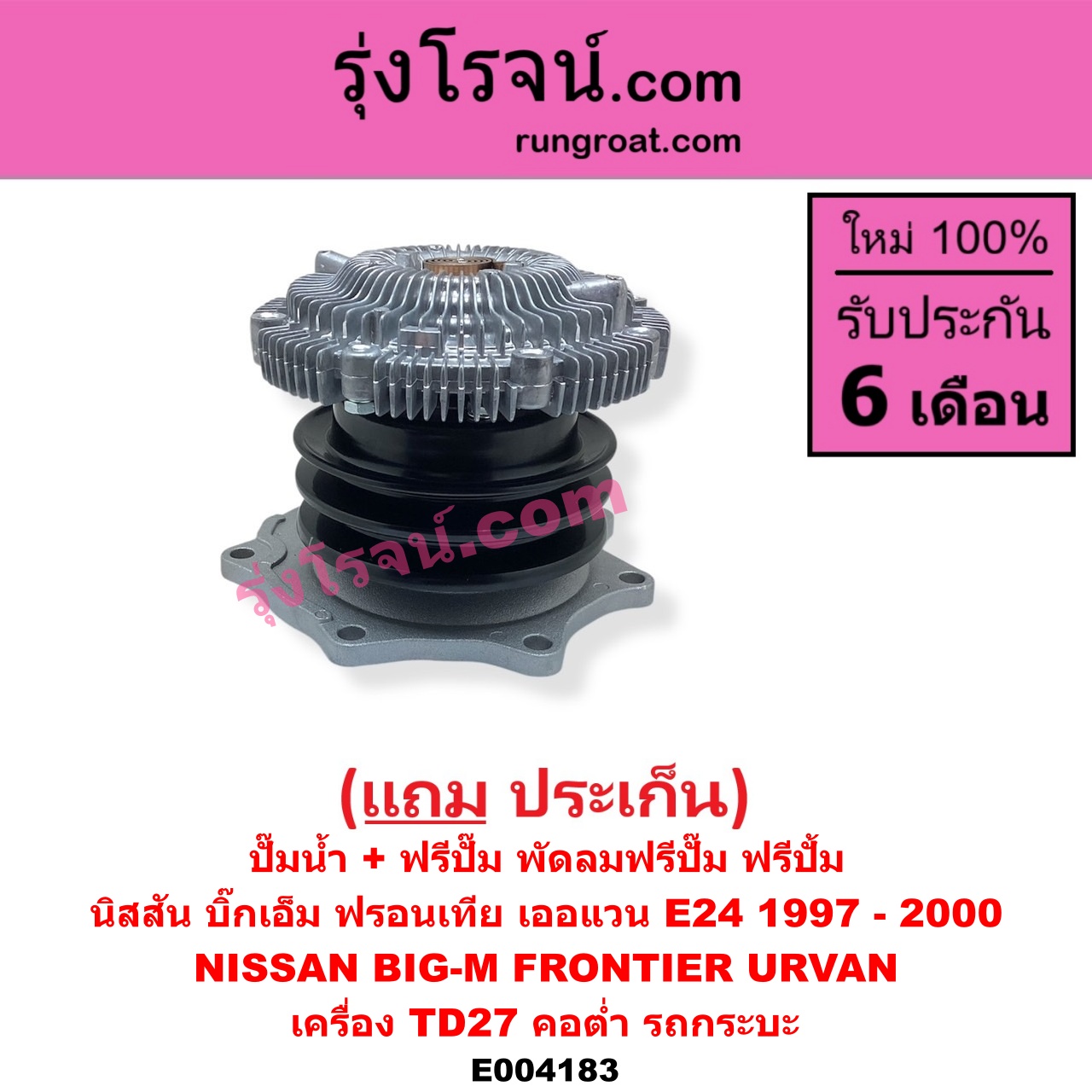 | E004183 | ปั๊มน้ำ + ฟรีปั๊ม (พัดลมฟรีปั๊ม ฟรีปั้ม) | NISSAN (นิสสัน) / BIG-M (บิ๊กเอ็ม TD, BDI/925/993) , NISSAN (นิสสัน) / URVAN (เออแวน E24 97/99) |