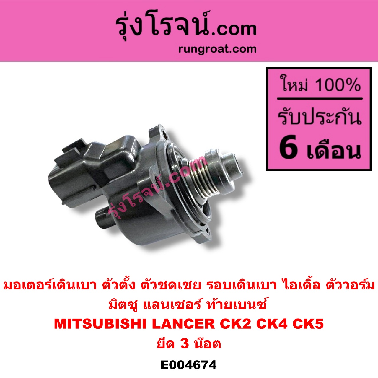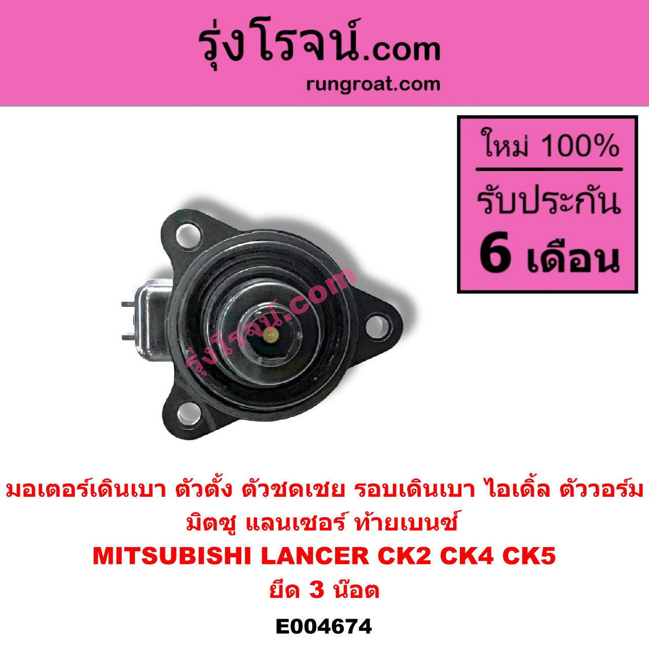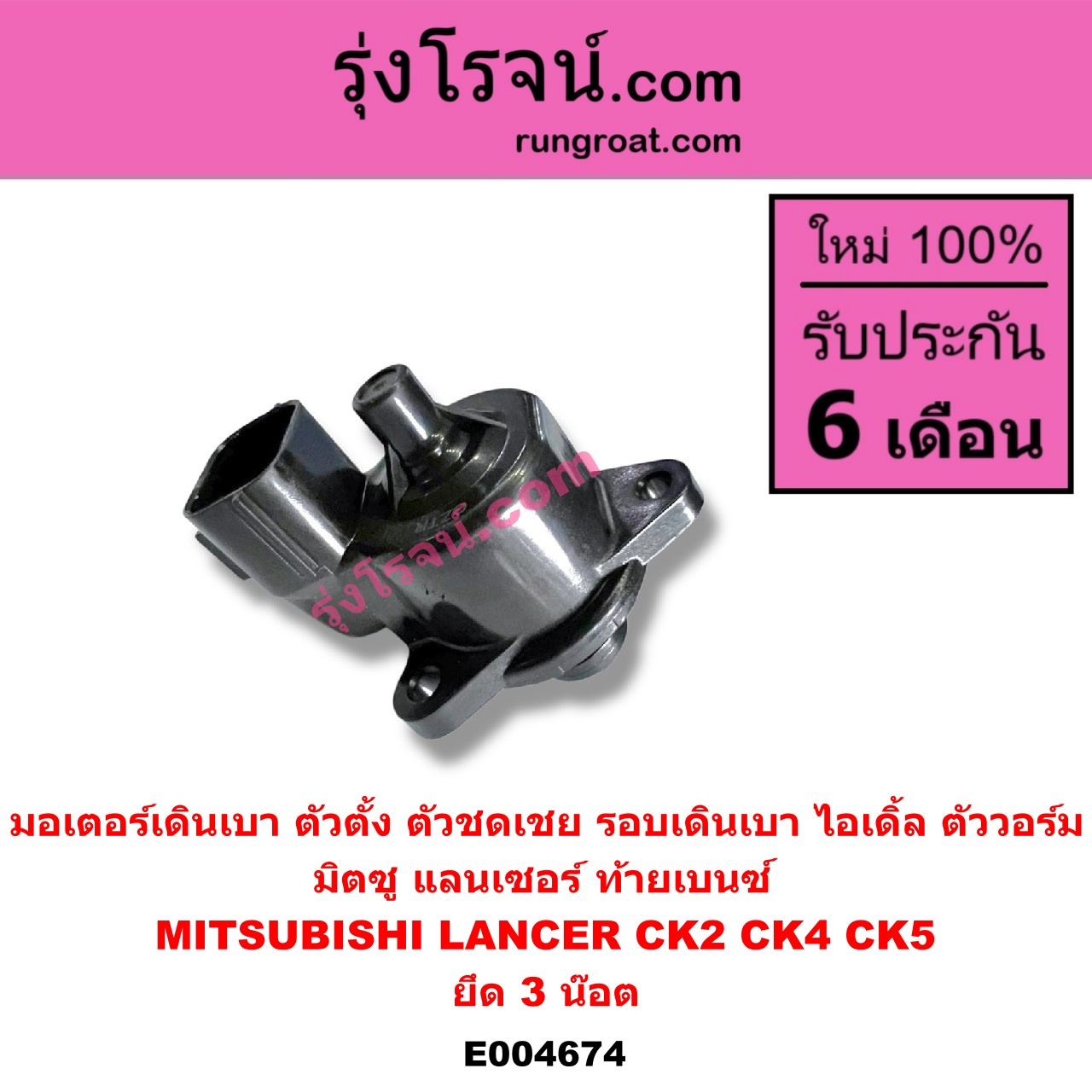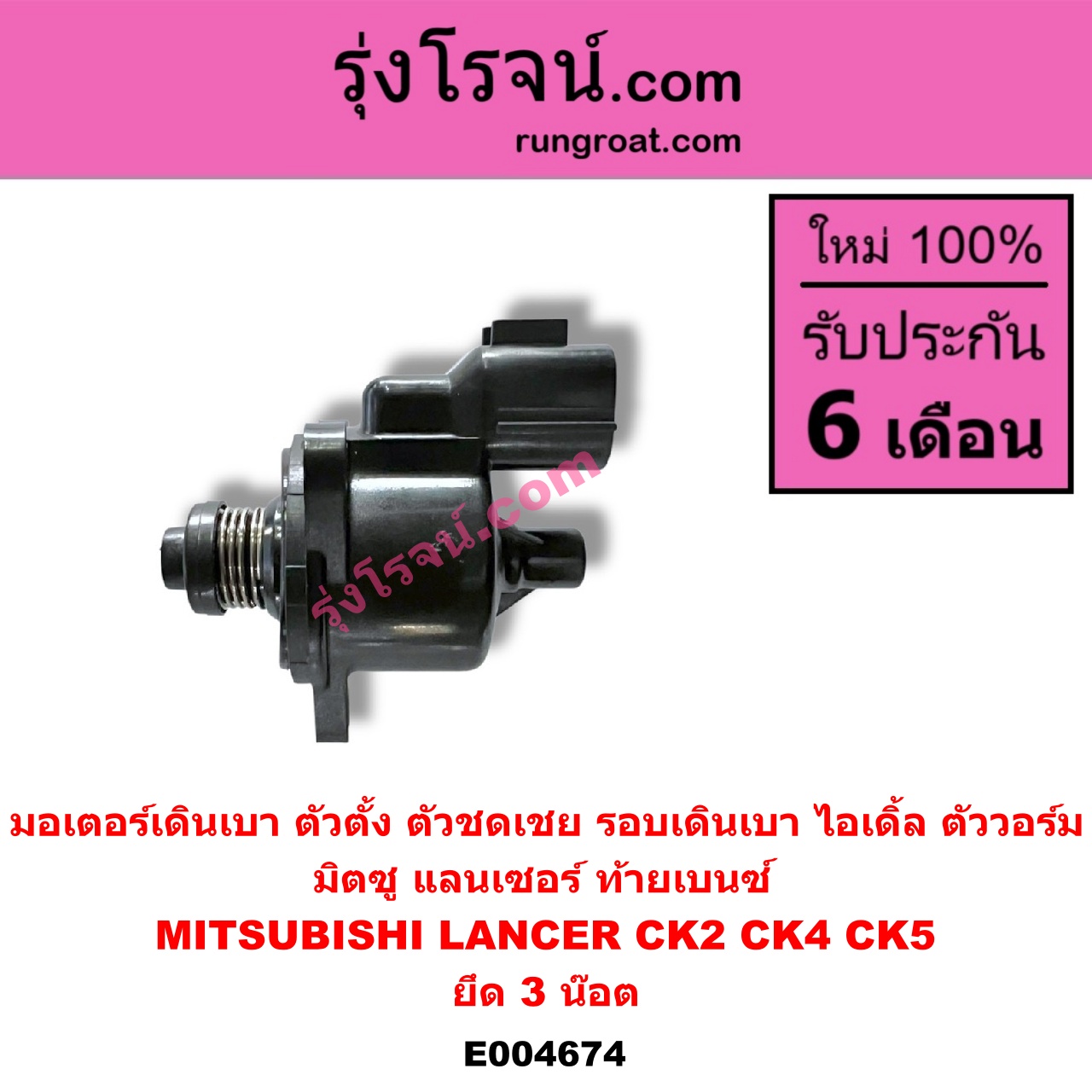 | E004674 | มอเตอร์เดินเบา (ตัวตั้ง ตัวชดเชย รอบเดินเบา, ไอเดิ้ล, ตัววอร์ม) | MITSUBISHI (มิตซู) / LANCER CK2/CK4/CK5 (แลนเซอร์ ท้ายเบนซ์) | ยึด 3 น๊อต | ไต้หวัน (ใหม่) |