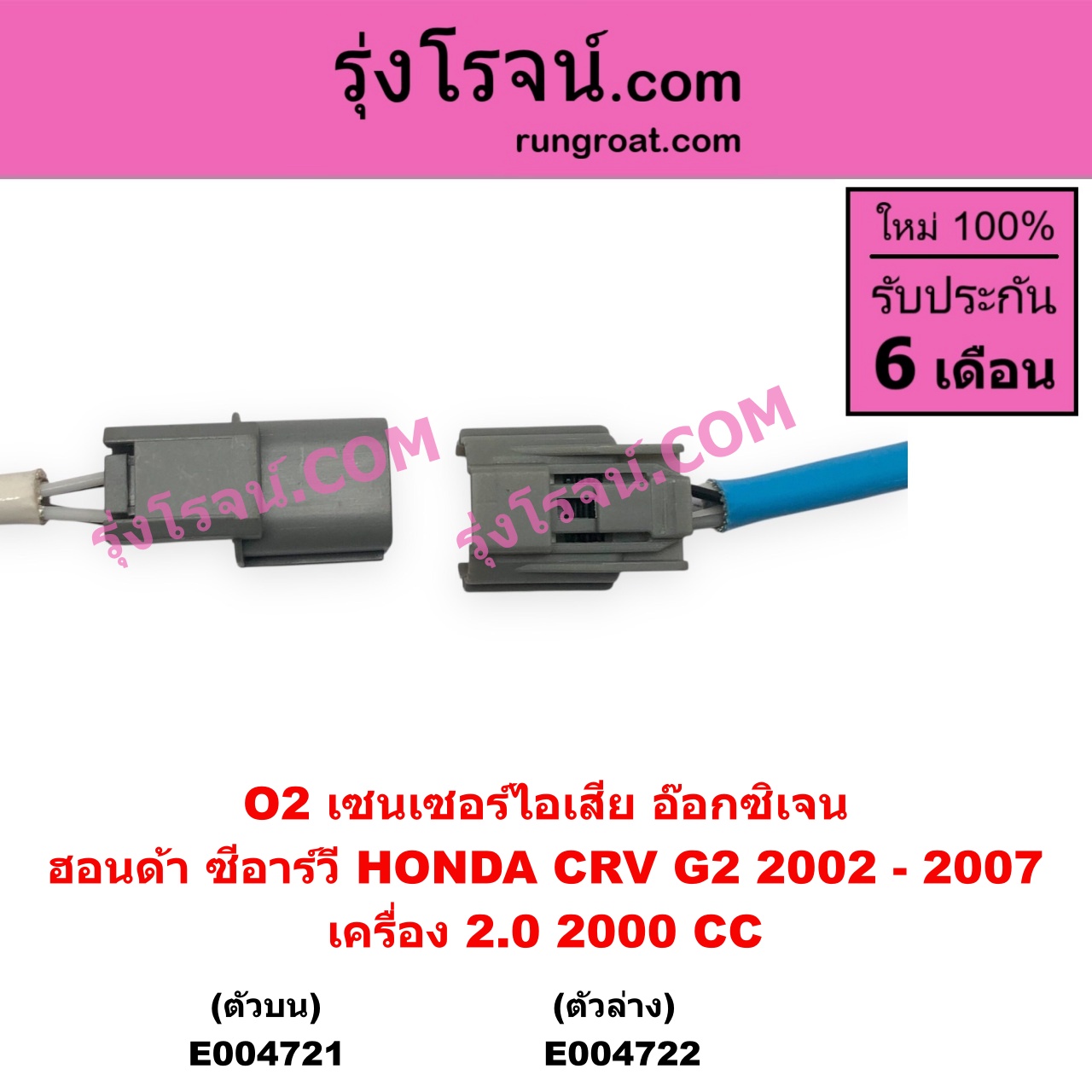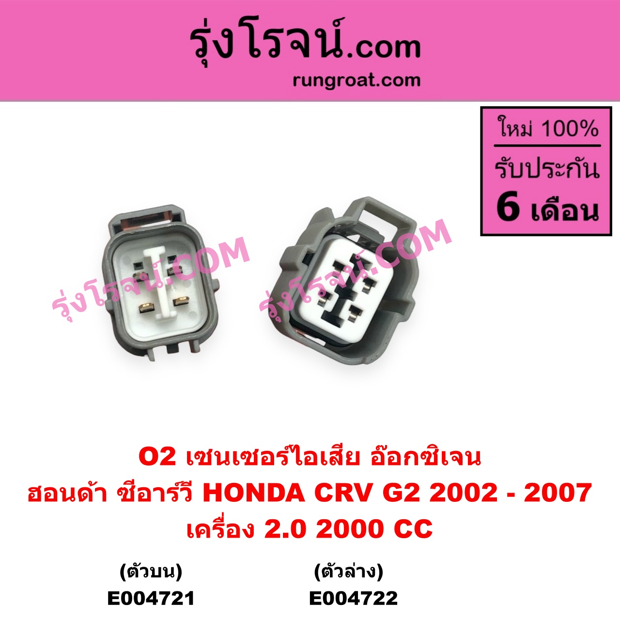 | E004722 | เซนเซอร์ไอเสีย (อ๊อกซิเจน) | HONDA (ฮอนด้า) / CRV (ซีอาร์วี 2002 – 2007) (G2 ไฟท้ายยาว) | เครื่อง 2000 2.0 (ตัวล่าง) | ไต้หวัน (ใหม่) |