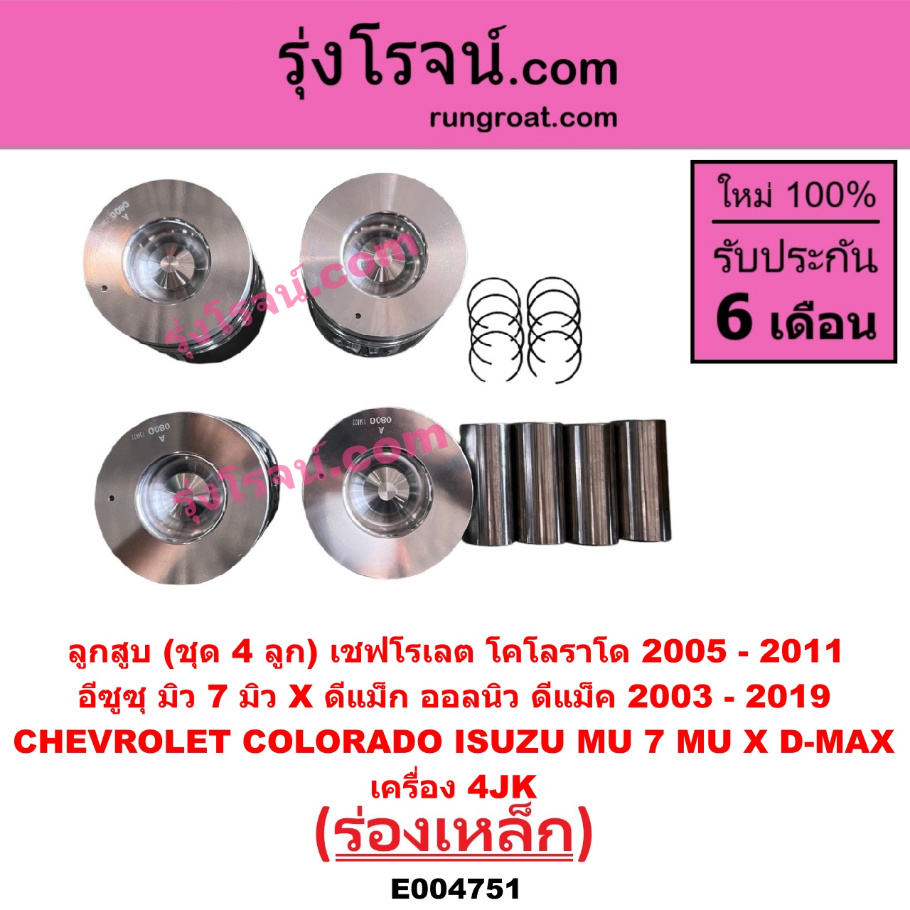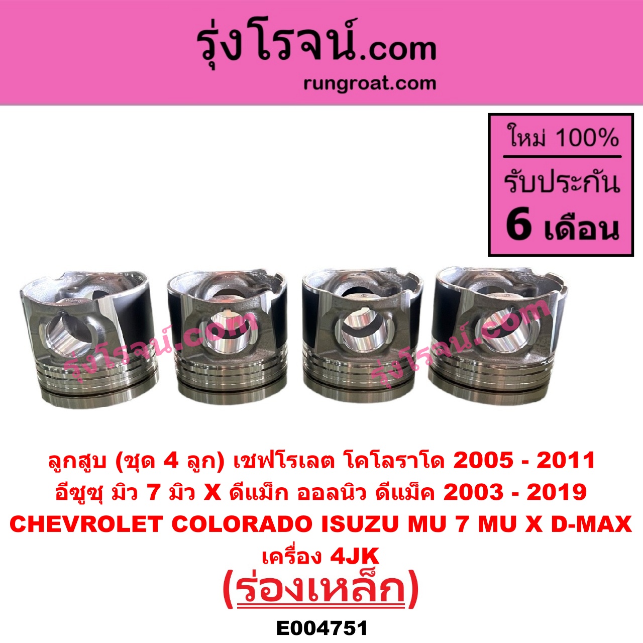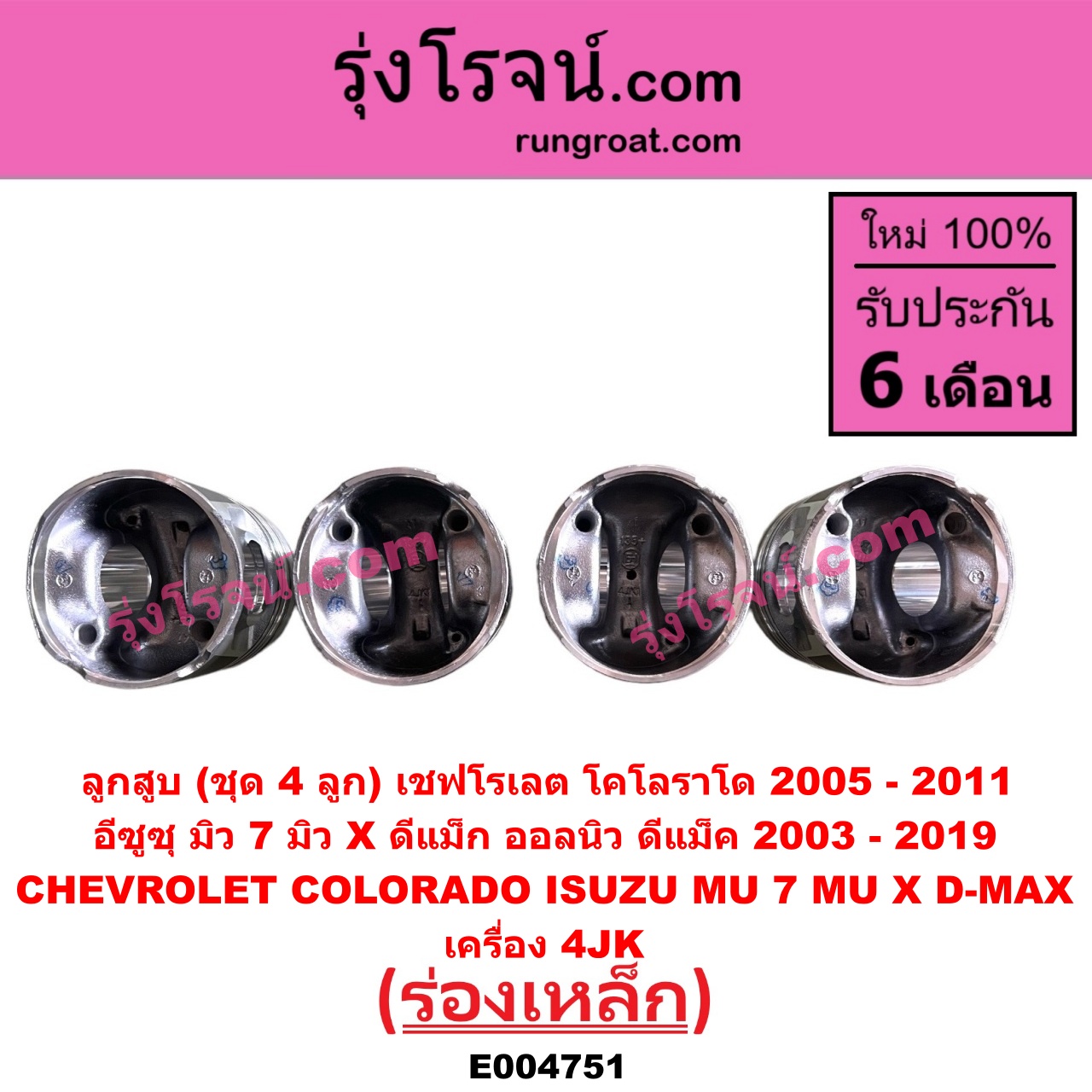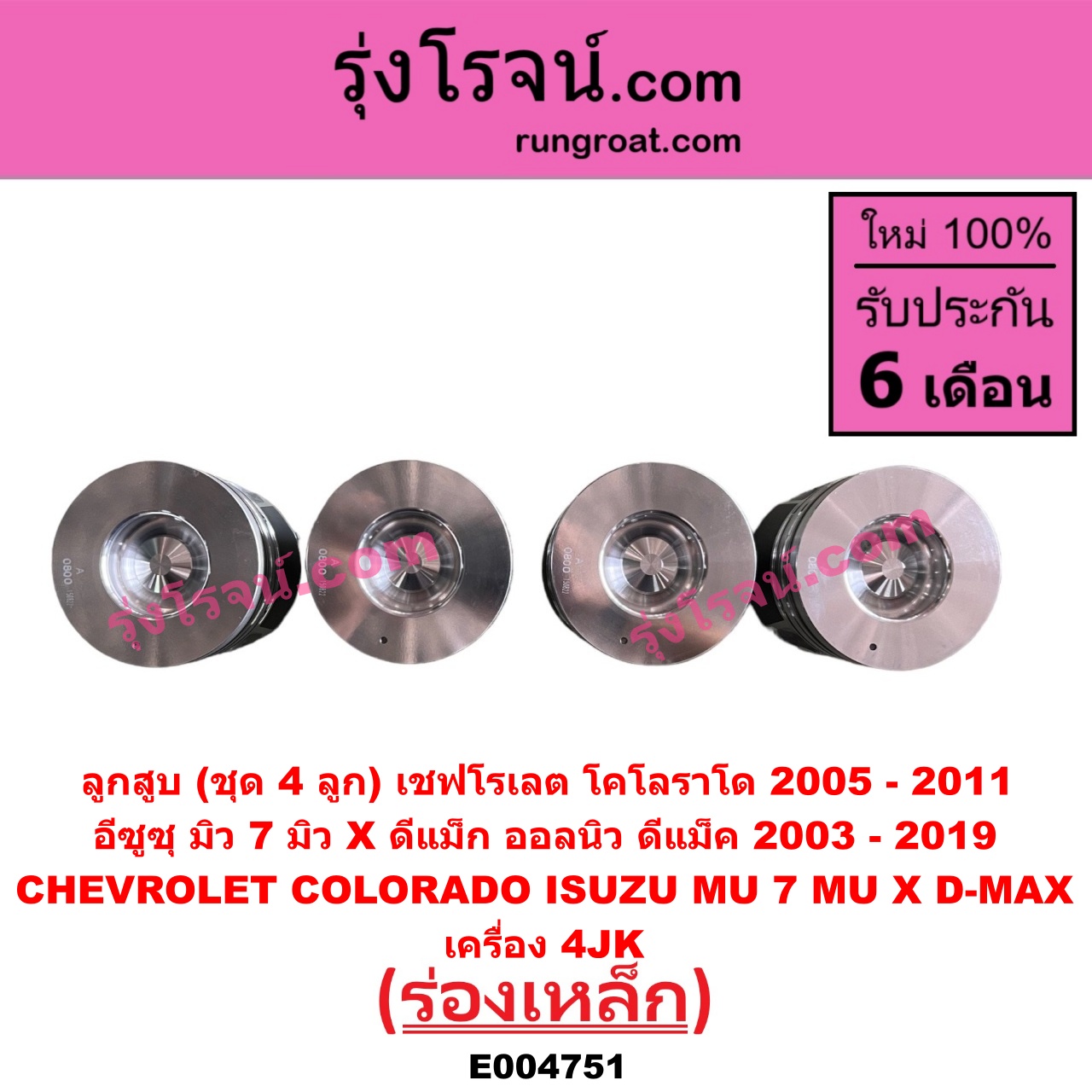E004751 ลูกสูบ CHEVROLET (เชฟโรเลต) / COLORADO (โคโลราโด 2005 – 2011) (ตา 2 ชั้น / ตาชั้นเดียว), ISUZU (อีซูซุ) / D-MAX (ดีแม็ก ดีแม็ค DMAX 2003 – 2011) (รุ่นแรก), D-MAX (ออนิว ออลนิว ดีแม็ก ดีแม็ค DMAX 2012 – 2019) (วีครอส V-CROSS / บลูเพาเวอร์ / 1.9), MU 7 (มิว 7 2005 – 2013), MU X (มิว X 2014 – 2019) ร่องเหล็ก เครื่อง 4JK (ชุด 4 ลูก)