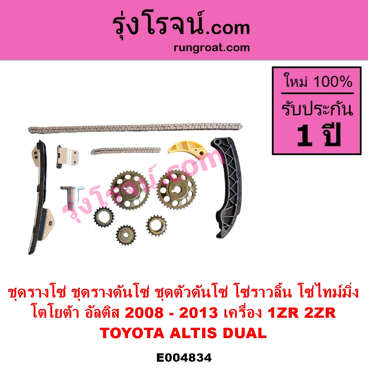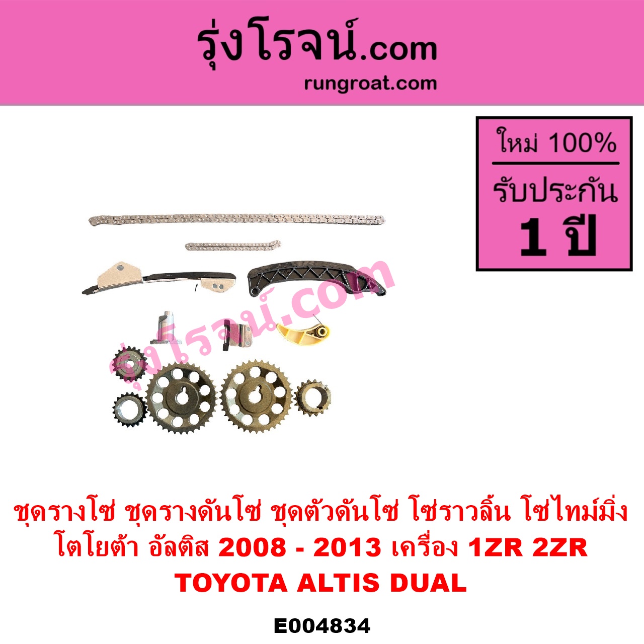 | E004834 | ชุดรางโซ่ (ชุดรางดันโซ่, ชุดตัวดันโซ่, โซ่ราวลิ้น, โซ่ไทม์มิ่ง) | TOYOTA (โตโยต้า) / ALTIS (อัลติส 2008 – 2013) (รุ่น 2, ดูโอ้, DUAL VVTI) | เครื่อง 1ZR, 2ZR | ไต้หวัน (ใหม่) |