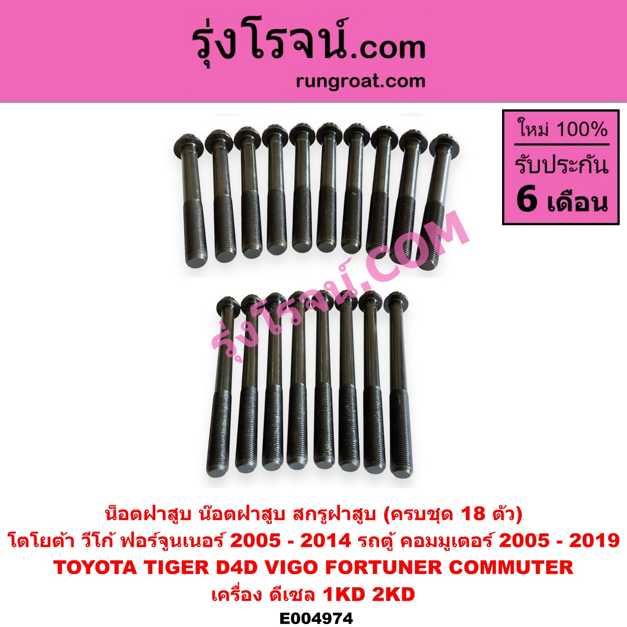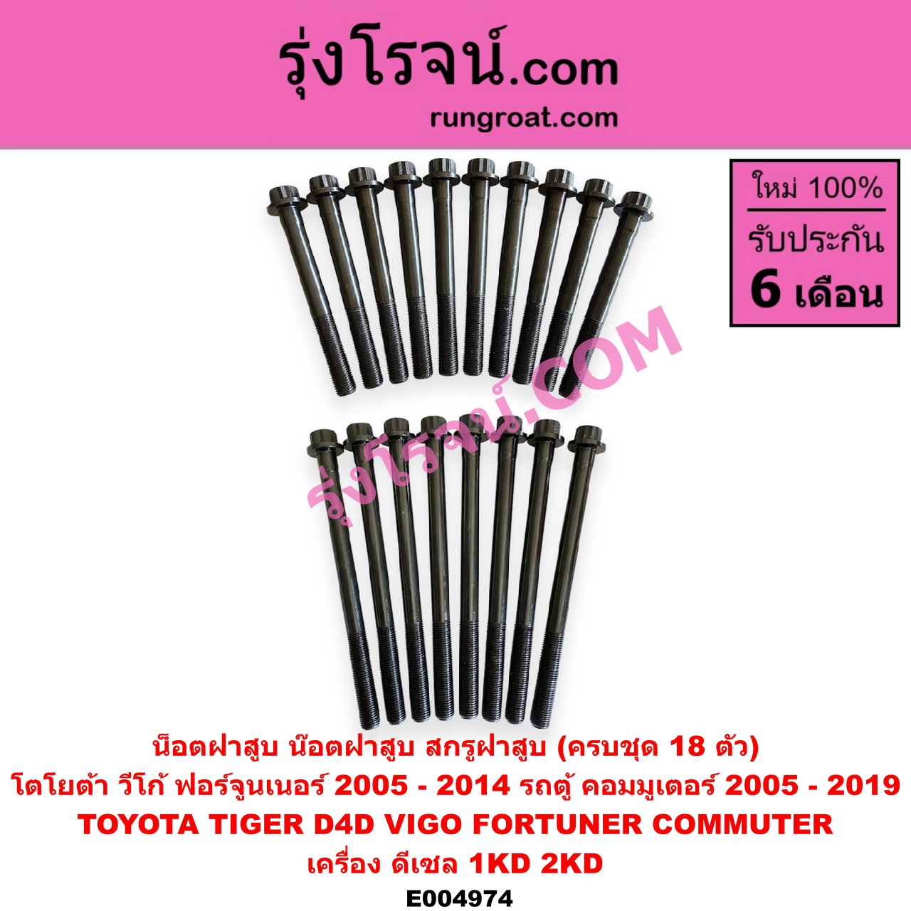 | E004974 | น็อตฝาสูบ (น๊อตฝาสูบ, สกรูฝาสูบ) | TOYOTA (โตโยต้า) / COMMUTER (รถตู้ คอมมิวเตอร์ คอมมูเตอร์ 2005 – 2019) , TOYOTA (โตโยต้า) / FORTUNER (ฟอร์จูนเนอร์ 2005 – 2014) (รุ่นแรก) , TOYOTA (โตโยต้า) / SPORTRIDER (สปอร์ตไรเดอร์) , TOYOTA (โตโยต้า) / TIGER/TIGER D4D (ไทเกอร์ / ไทเกอร์ ดีโฟร์ดี) , TOYOTA (โตโยต้า) / VIGO (วีโก้ 2004 – 2015) |