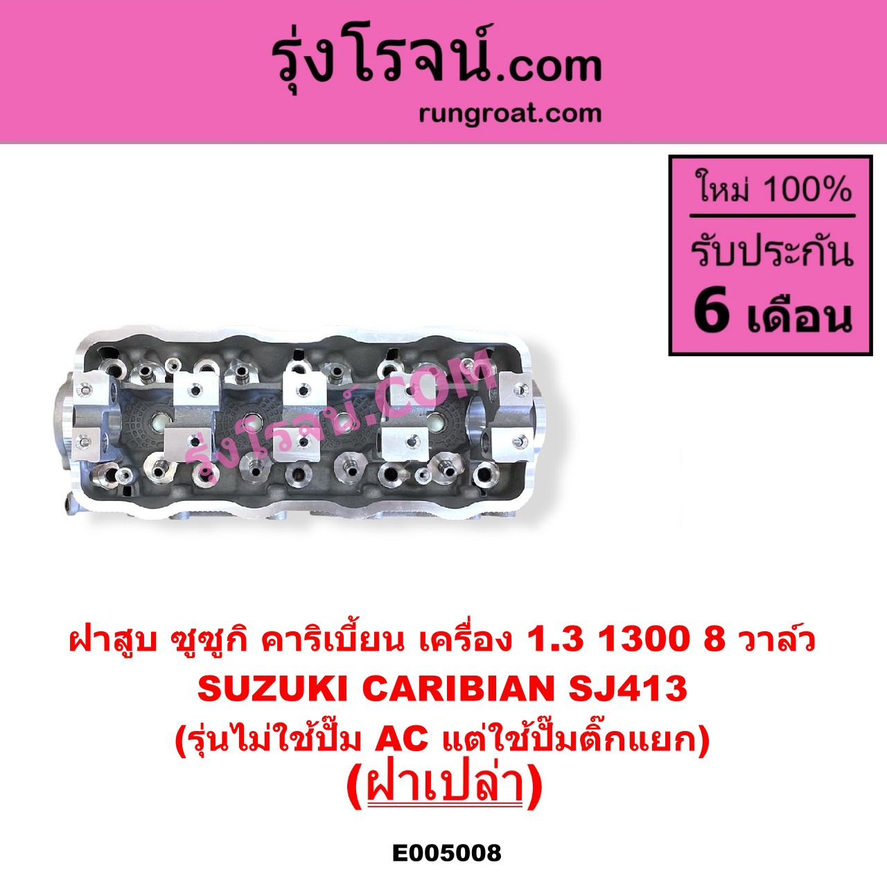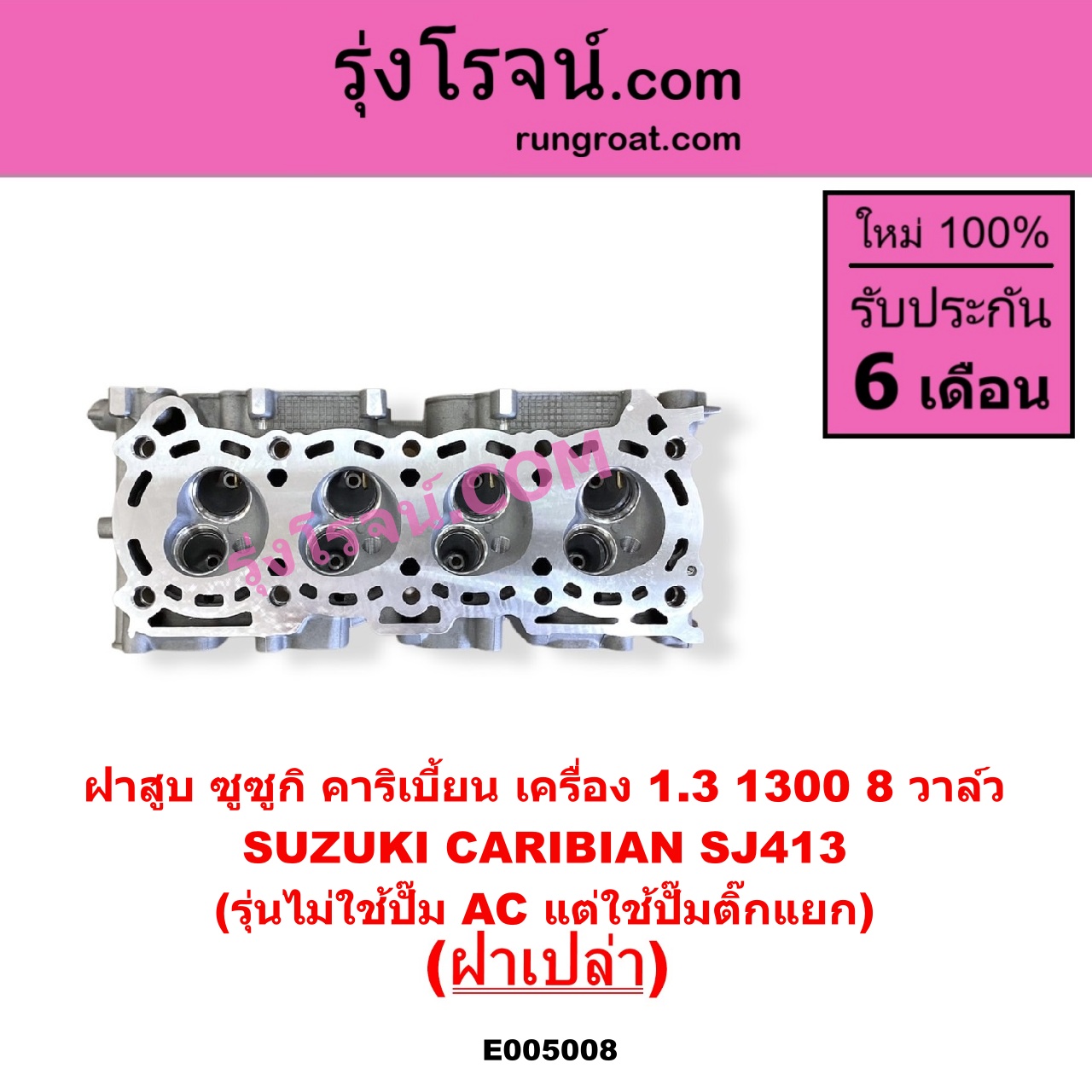 | E005008 | ฝาสูบ | SUZUKI (ซูซูกิ) / CARIBIAN (คาริเบี้ยน 86/93/96/99) (SJ413) | เครื่อง 1300 (8 วาล์ว) (รุ่นไม่ใช้ปั๊ม AC แต่ใช้ปั๊มติ๊กแยก) (ฝาเปล่า) | ไต้หวัน (ใหม่) |