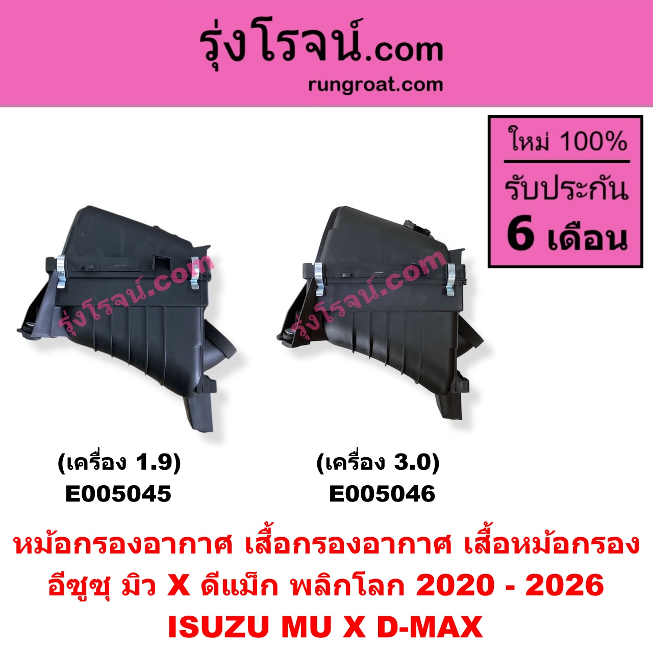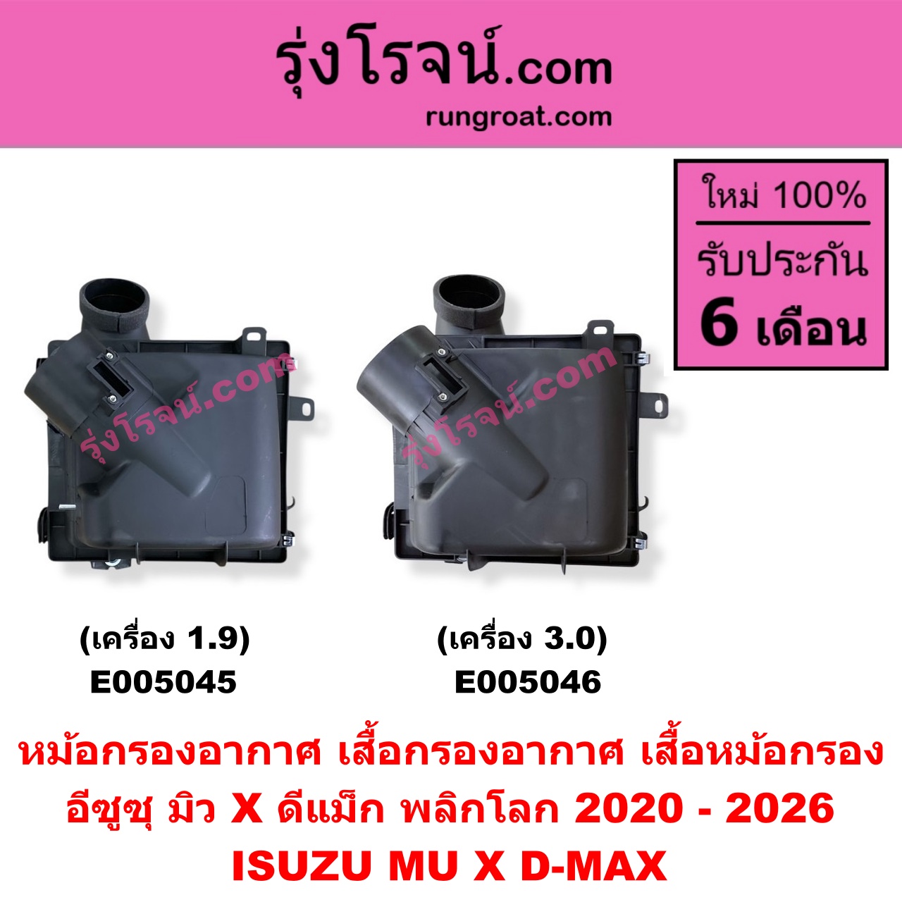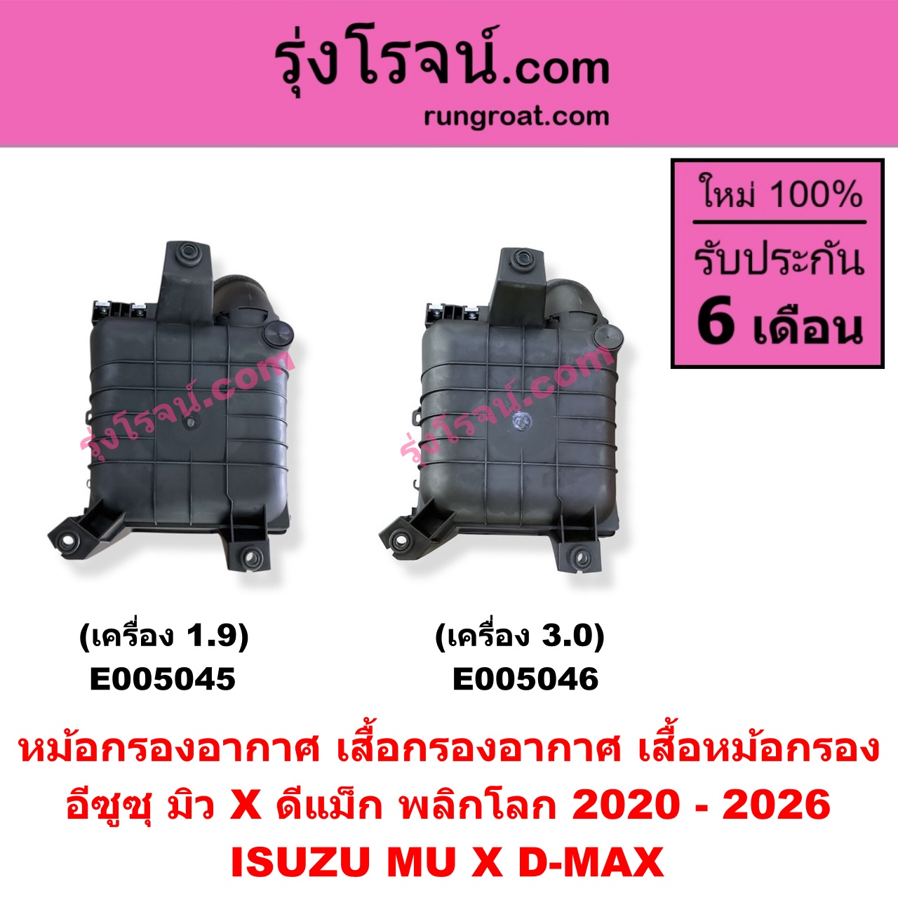 | E005045 | หม้อกรองอากาศ (เสื้อกรองอากาศ, เสื้อหม้อกรอง) | ISUZU (อีซูซุ) / D-MAX (ดีแม็ก ดีแม็ค DMAX 2020 – 2026) (RG01 พลิกโลก) , ISUZU (อีซูซุ) / MU X (มิว X 2020 – 2026) (RG01 1.9) |