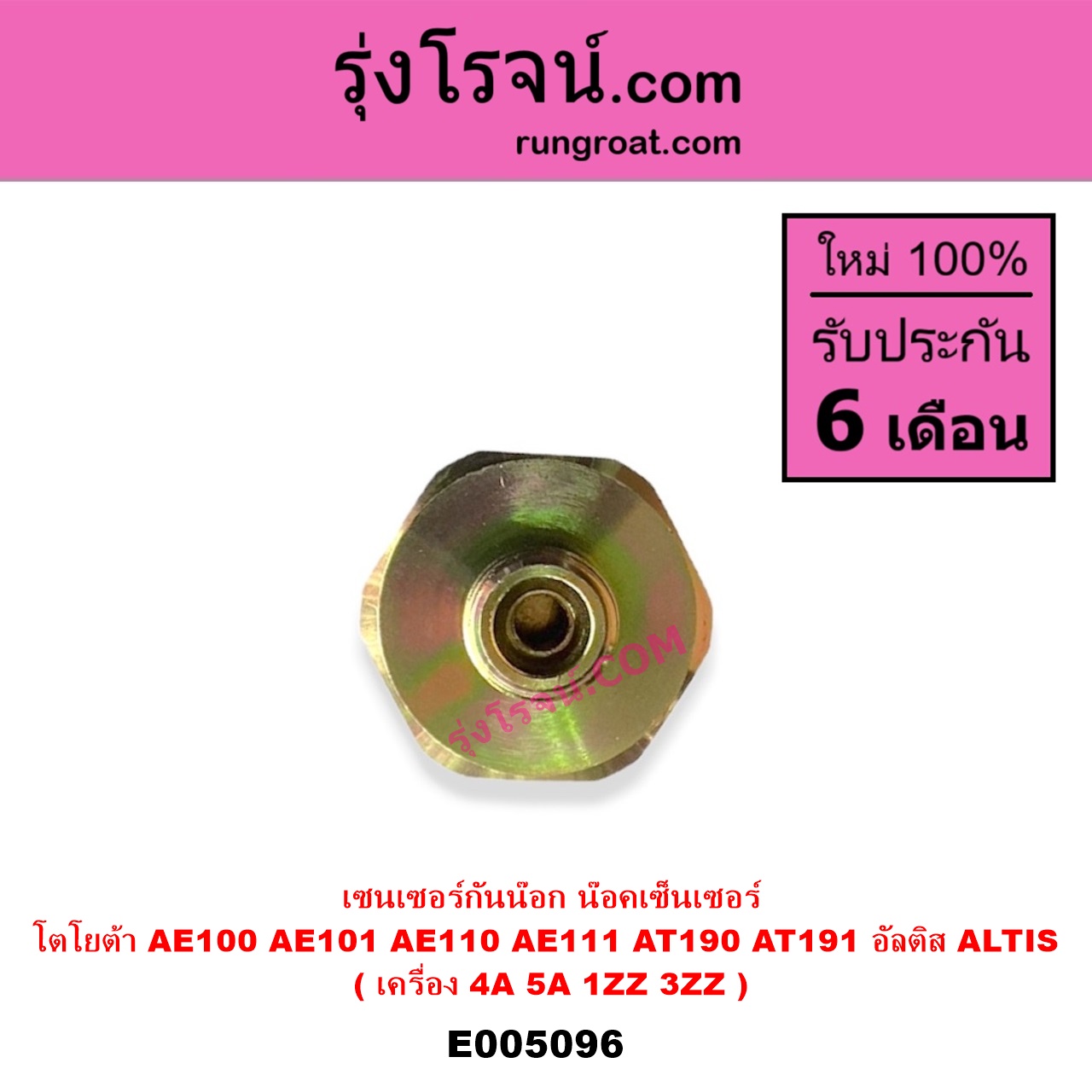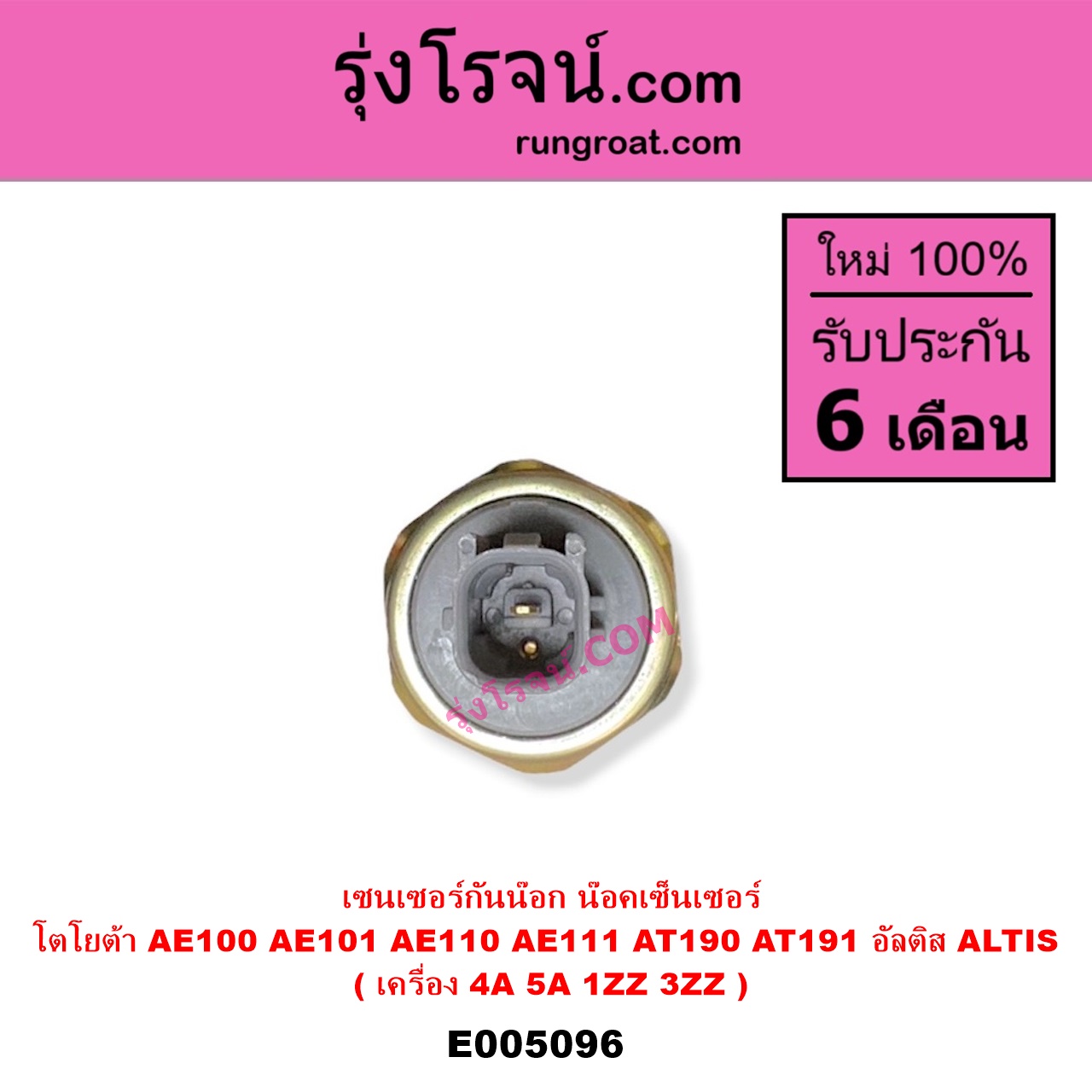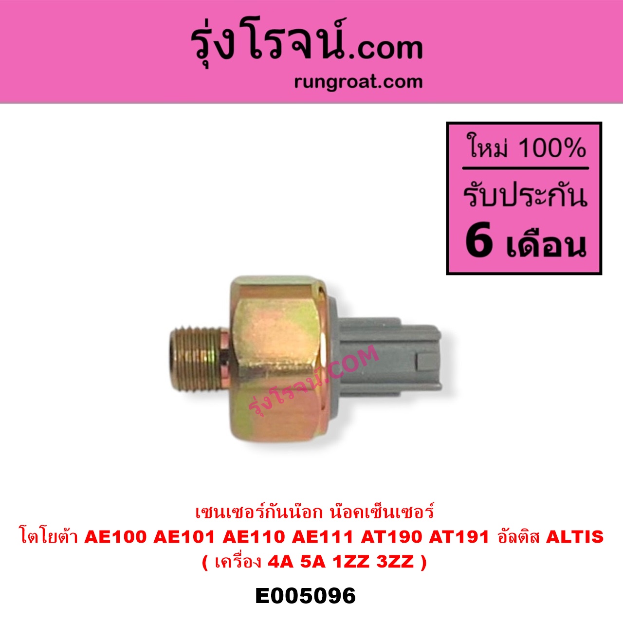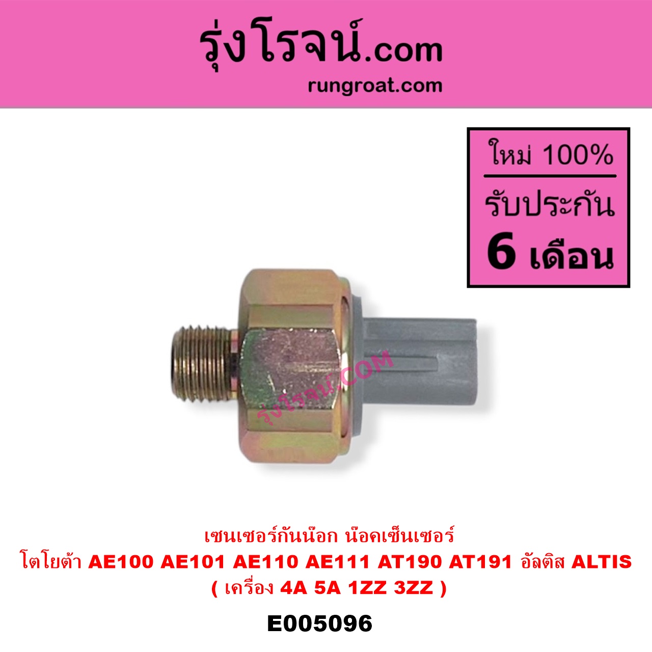 | E005096 | เซ็นเซอร์กันน็อก (น็อคเซ็นเซอร์) | TOYOTA (โตโยต้า) / ALTIS (อัลติส 2001 – 2007) (หน้าหมู รุ่นแรก) , TOYOTA (โตโยต้า) / ALTIS (อัลติส 2008 – 2013) (รุ่น 2, ดูโอ้, DUAL VVTI) , TOYOTA (โตโยต้า) / COROLLA (โคโรล่า AE100 AE101 / EE100 EE101) (สามห่วง) , TOYOTA (โตโยต้า) / COROLLA (โคโรล่า AE110 AE111 / EE110 EE111) (ตูดเป็ด / ไฮทอร์ค) , TOYOTA (โตโยต้า) / CORONA (โคโรน่า ST190 / ST191 / EXSIOR) (ท้ายโด่ง) |