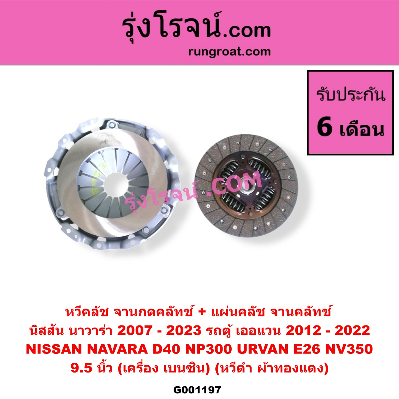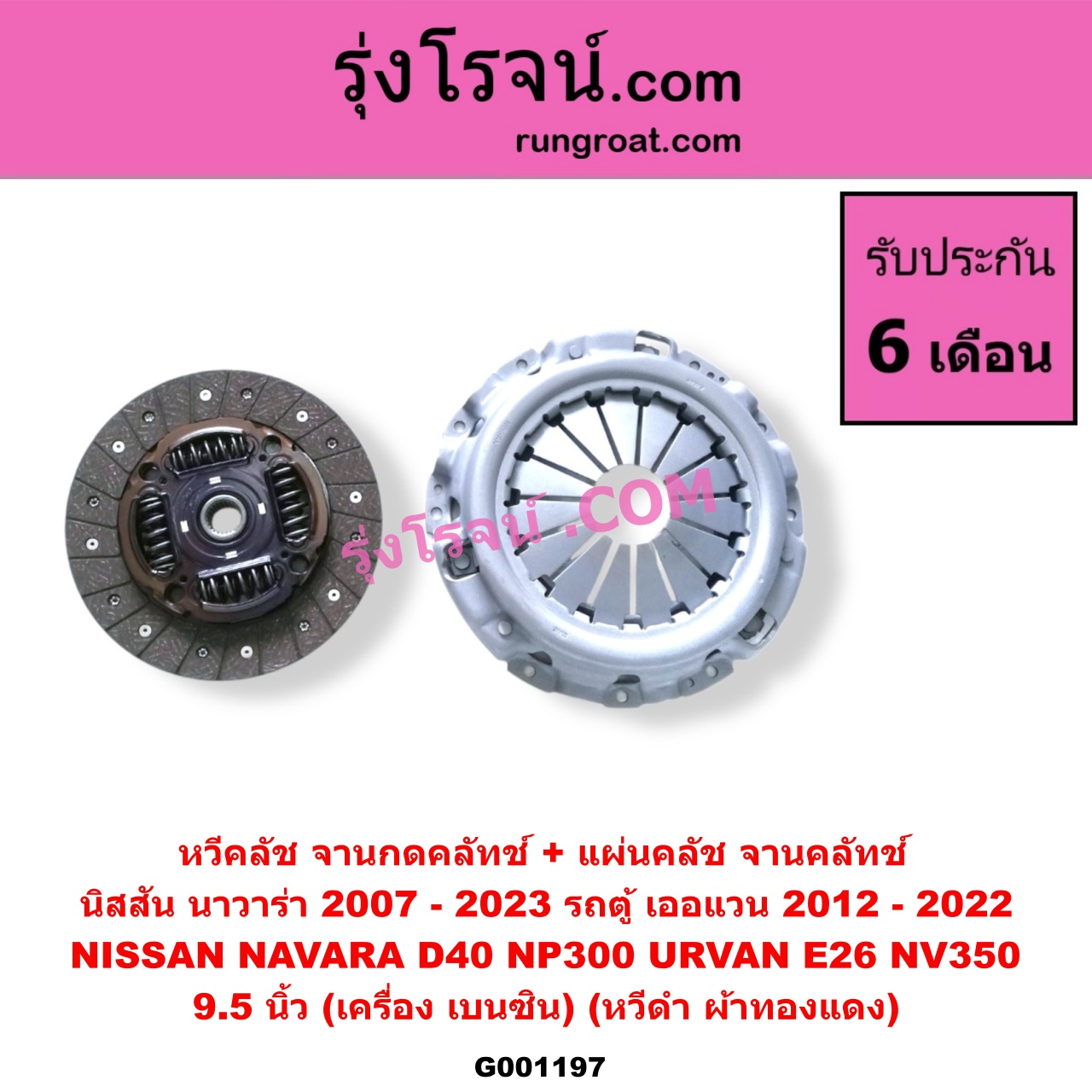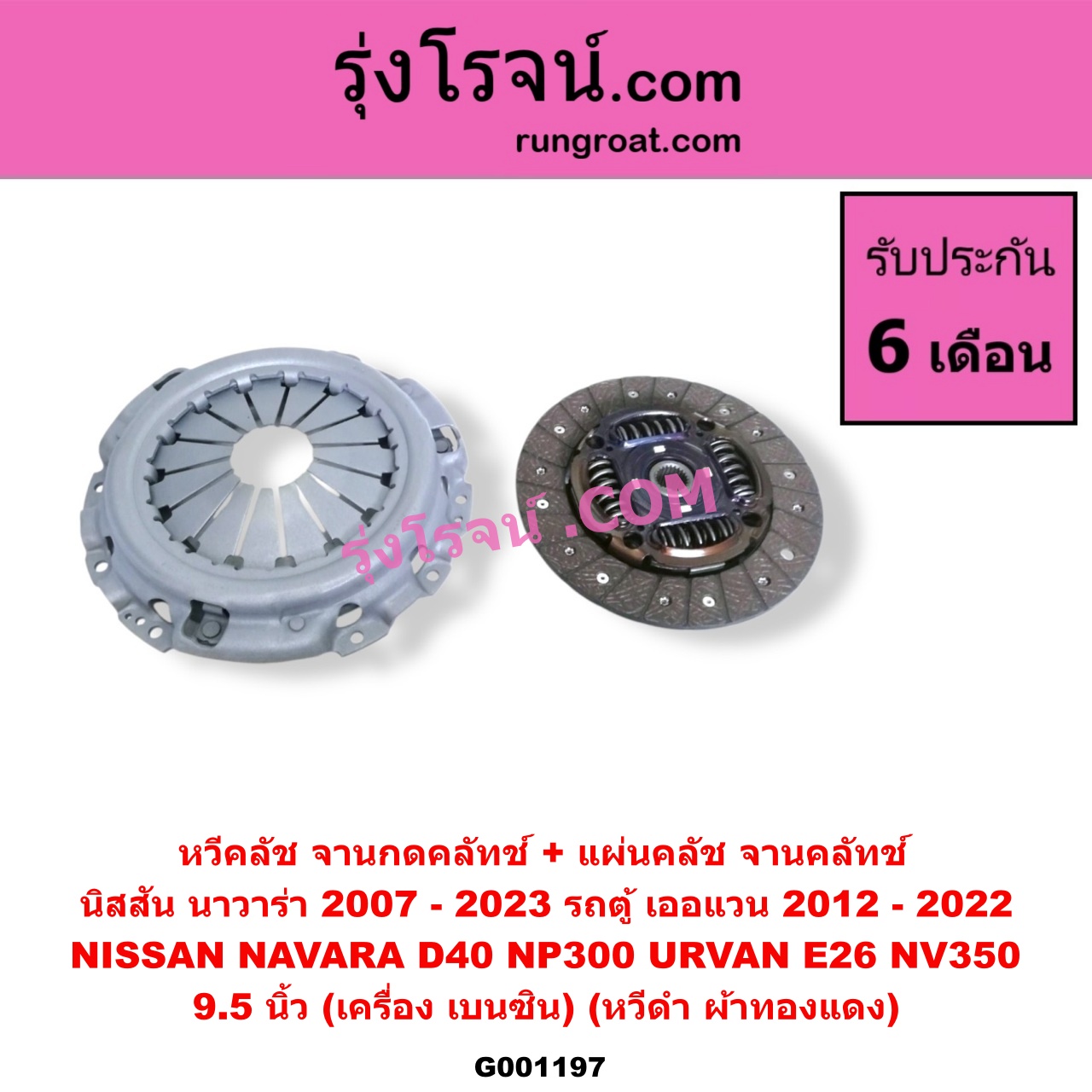 | G001197 | หวีครัช (จานกดคลัทช์) + แผ่นคลัช (จานคลัทช์) | NISSAN (นิสสัน) / NAVARA (นาวาร่า D40 07/10/12) (รุ่นแรก D40) , NISSAN (นิสสัน) / NAVARA (นาวาร่า NP300 D23 14) (รุ่น 2 D23) , NISSAN (นิสสัน) / URVAN (เออแวน E26 12) |