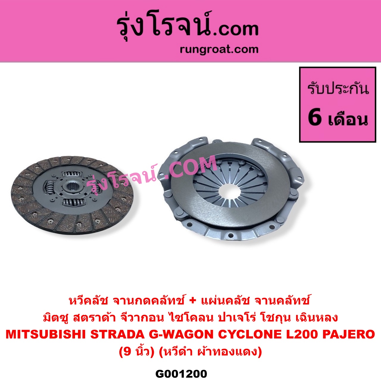 | G001200 | หวีครัช (จานกดคลัทช์) + แผ่นคลัช (จานคลัทช์) | MITSUBISHI (มิตซู) / CYCLONE (L200 ไซโคลน 92/94) , MITSUBISHI (มิตซู) / G-WAGON (จีวากอน / แกรนด์ดิส) , MITSUBISHI (มิตซู) / L200 (เฉินหลง) , MITSUBISHI (มิตซู) / PAJERO (ปาเจโร่ โชกุน/ตากลม/ตาเหลี่ยม) , MITSUBISHI (มิตซู) / STRADA (สตราด้า สตาด้า 1997 – 2005) |
