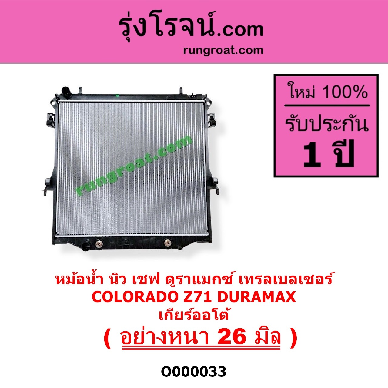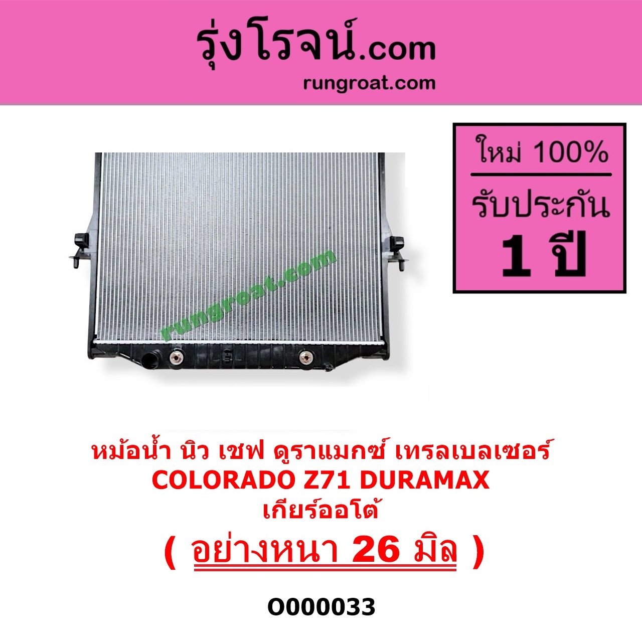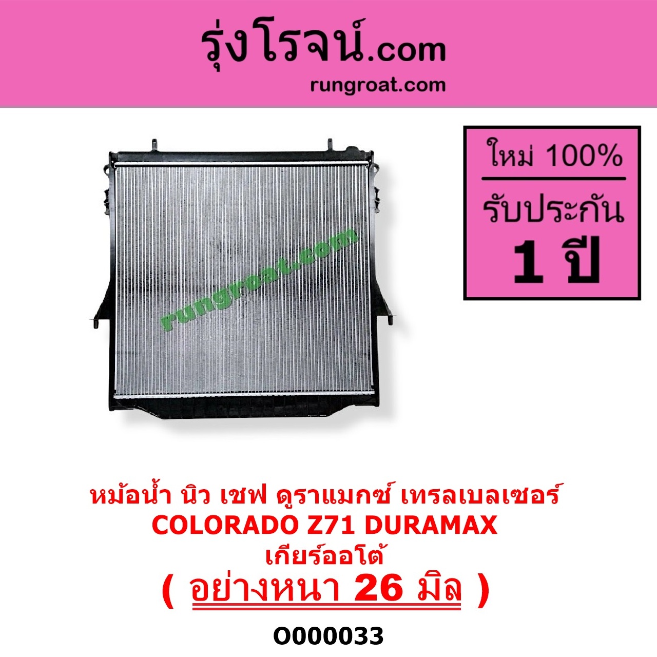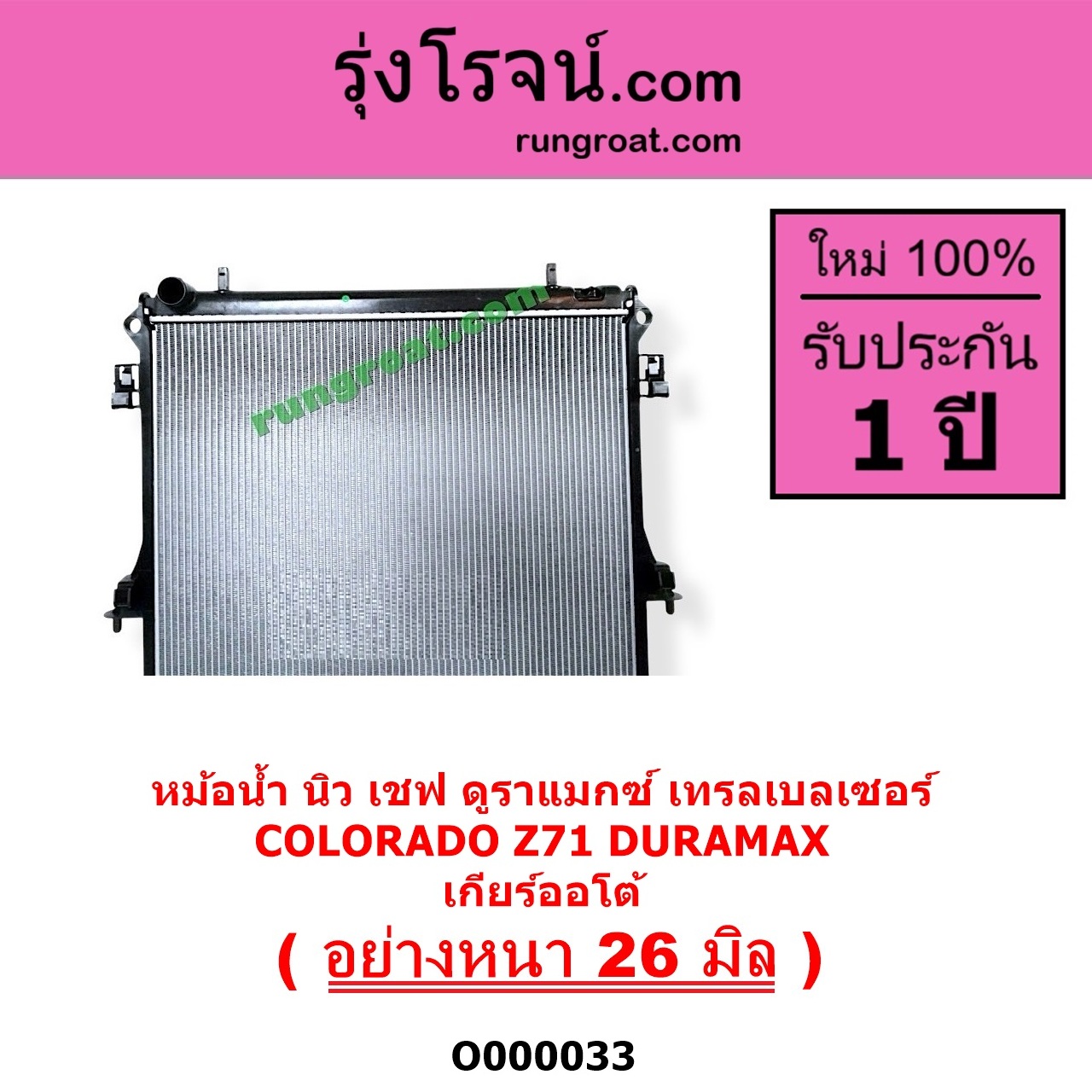 | O000033 | หม้อน้ำ (รังผึ้งหม้อน้ำ, แผงหม้อน้ำ) | CHEVROLET (เชฟโรเลต) / COLORADO (โคโลราโด 2012 – 2020) (นิว เชฟ ดูราแมกซ์, Z71, DURAMAX) , CHEVROLET (เชฟโรเลต) / TRAILBLAZER (เทรลเบลเซอร์ 2013 – 2020) |