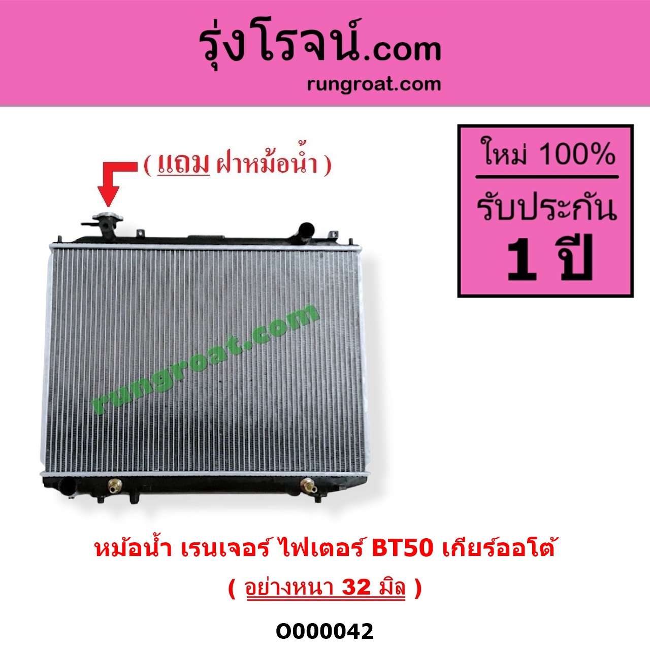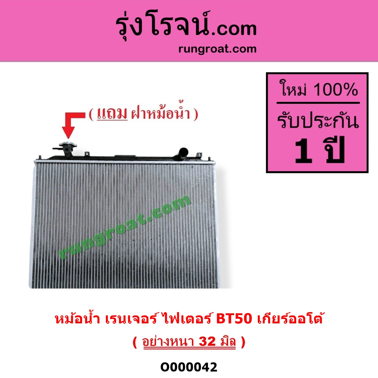 | O000042 | หม้อน้ำ (รังผึ้งหม้อน้ำ, แผงหม้อน้ำ) | FORD (ฟอร์ด) / EVEREST (เอเวอเรสต์ 2003 – 2005) (รุ่นแรก) , FORD (ฟอร์ด) / RANGER (เรนเจอร์ 1999 – 2005) (รุ่นแรก WL 12 วาล์ว) , FORD (ฟอร์ด) / RANGER (เรนเจอร์ ดูราทอร์ค 2006 – 2011) (รุ่น 2) , MAZDA (มาสด้า) / BT-50 (บีที 50 06/09) , MAZDA (มาสด้า) / FIGHTER (ไฟเตอร์ 1997 – 2005) |