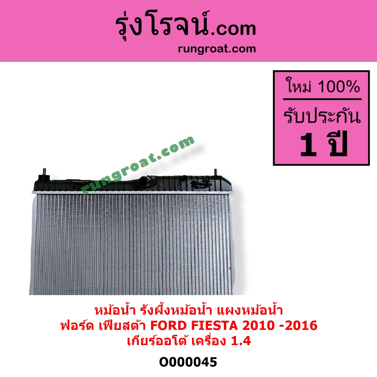 | O000045 | หม้อน้ำ (รังผึ้งหม้อน้ำ, แผงหม้อน้ำ) | FORD (ฟอร์ด) / FIESTA (เฟียสต้า 2010 – 2016) (4ประตู/5ประตู) | เกียร์ออโต้ (ใส่เกียร์กระปุกได้) เครื่อง 1400 | ไต้หวัน (ใหม่) |