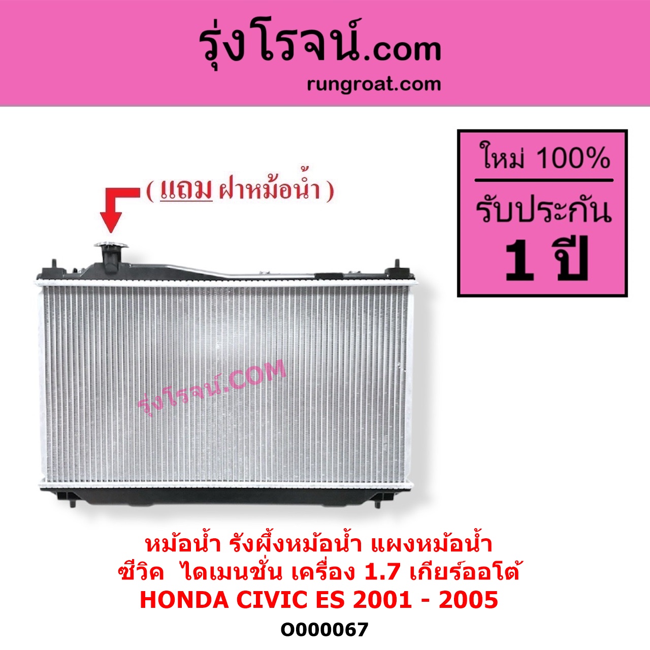 | O000067 | หม้อน้ำ (รังผึ้งหม้อน้ำ, แผงหม้อน้ำ) | HONDA (ฮอนด้า) / CIVIC (ซีวิค 2001 – 2005) (ไดเมนชั่น) (ES) | เกียร์ออโต้ (เครื่อง 1700) | ไต้หวัน (ใหม่) |