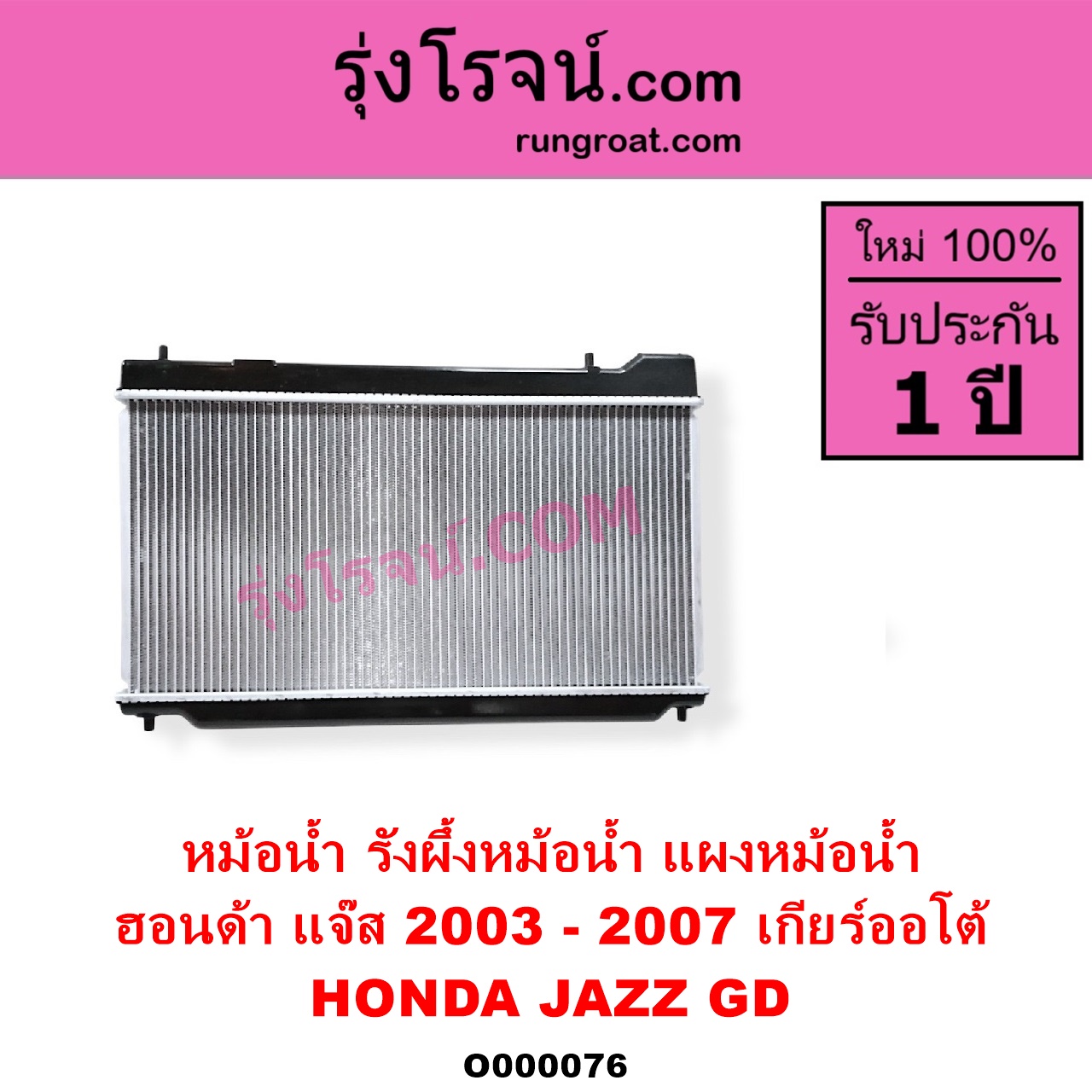 | O000076 | หม้อน้ำ (รังผึ้งหม้อน้ำ, แผงหม้อน้ำ) | HONDA (ฮอนด้า) / JAZZ (แจ๊ส 2003 – 2008) (GD) | เกียร์ออโต้ (ใส่เกียร์กระปุกได้) | ไต้หวัน (ใหม่) |
