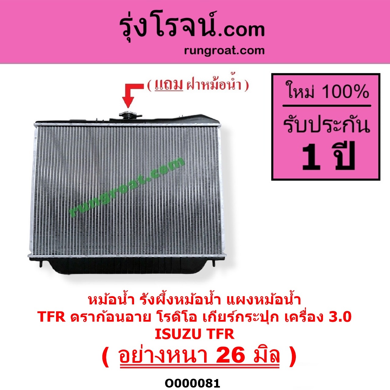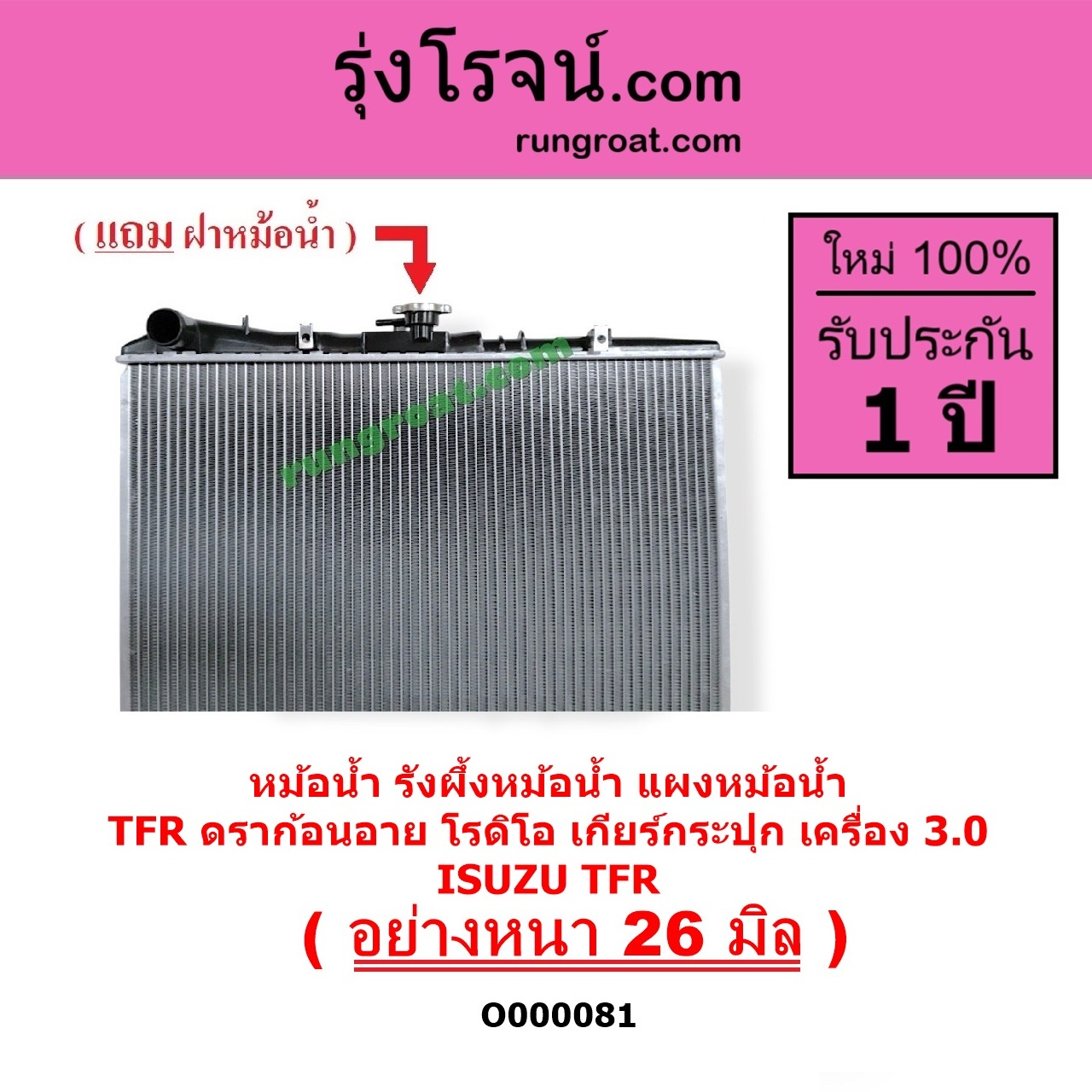 | O000081 | หม้อน้ำ (รังผึ้งหม้อน้ำ, แผงหม้อน้ำ) | ISUZU (อีซูซุ) / DRAGON EYE (ดราก้อน อาย) (TFR 1997 – 2002) , ISUZU (อีซูซุ) / RODEO (โรดิโอ) , ISUZU (อีซูซุ) / TFR (มังกรทอง 1988 – 1996) |