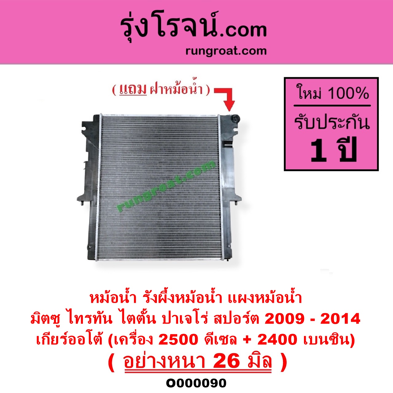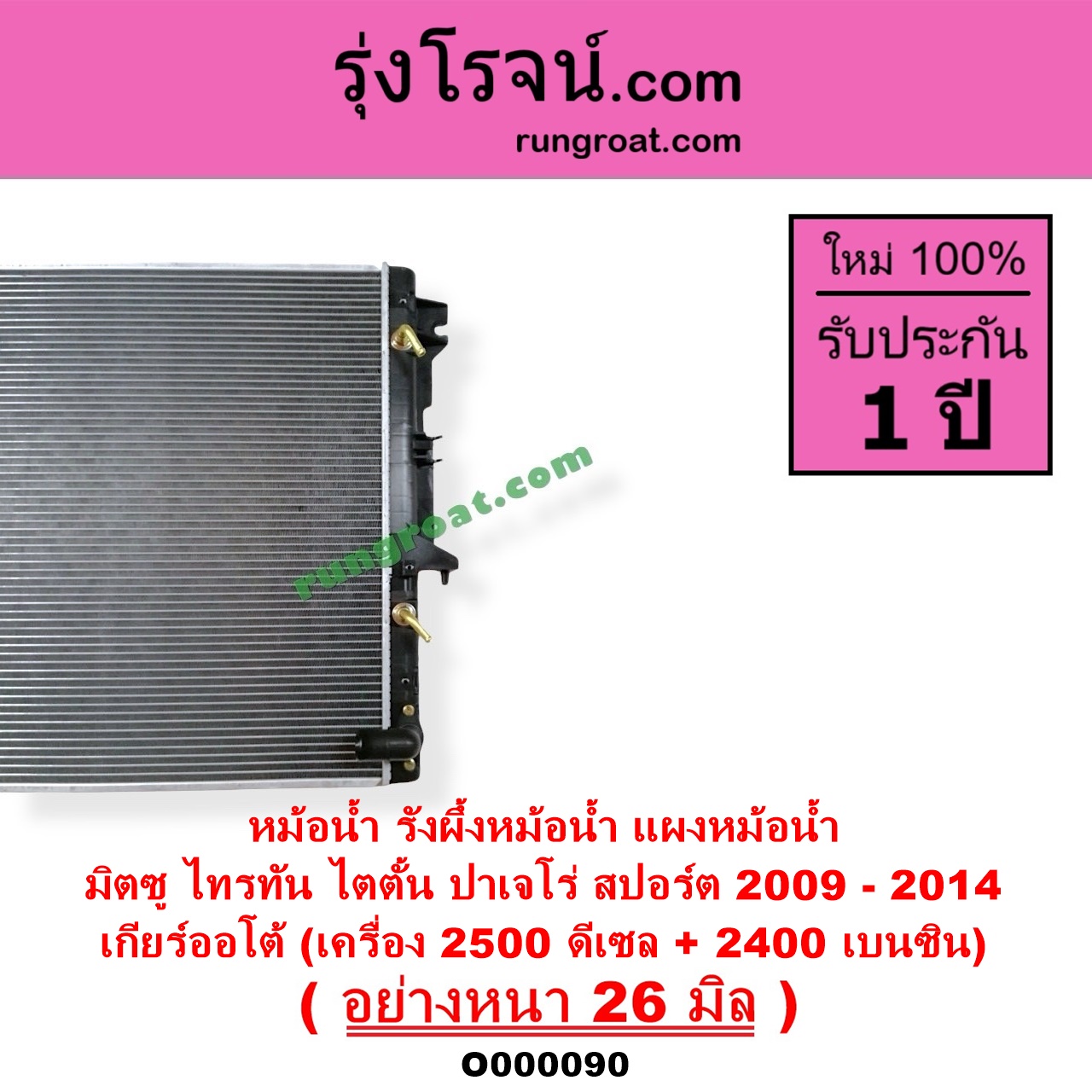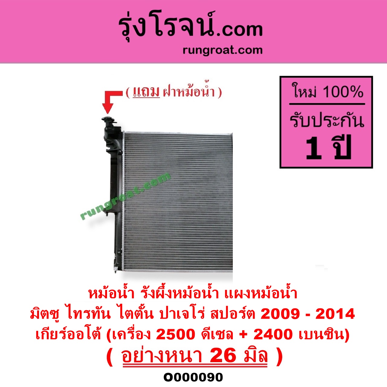 | O000090 | หม้อน้ำ (รังผึ้งหม้อน้ำ, แผงหม้อน้ำ) | MITSUBISHI (มิตซู) / PAJERO SPORT (ปาเจโร่ สปอร์ต 09/12) (รุ่นแรก) , MITSUBISHI (มิตซู) / TRITON (ไทรทัน 07/09 PLUS) (รุ่นแรก) |