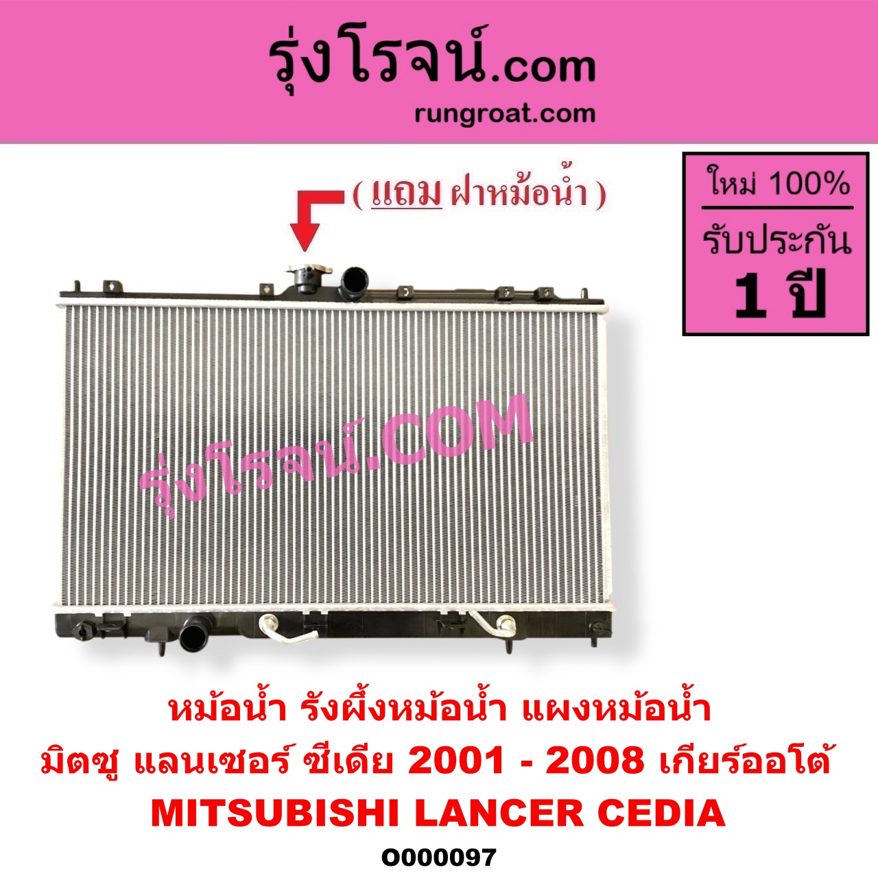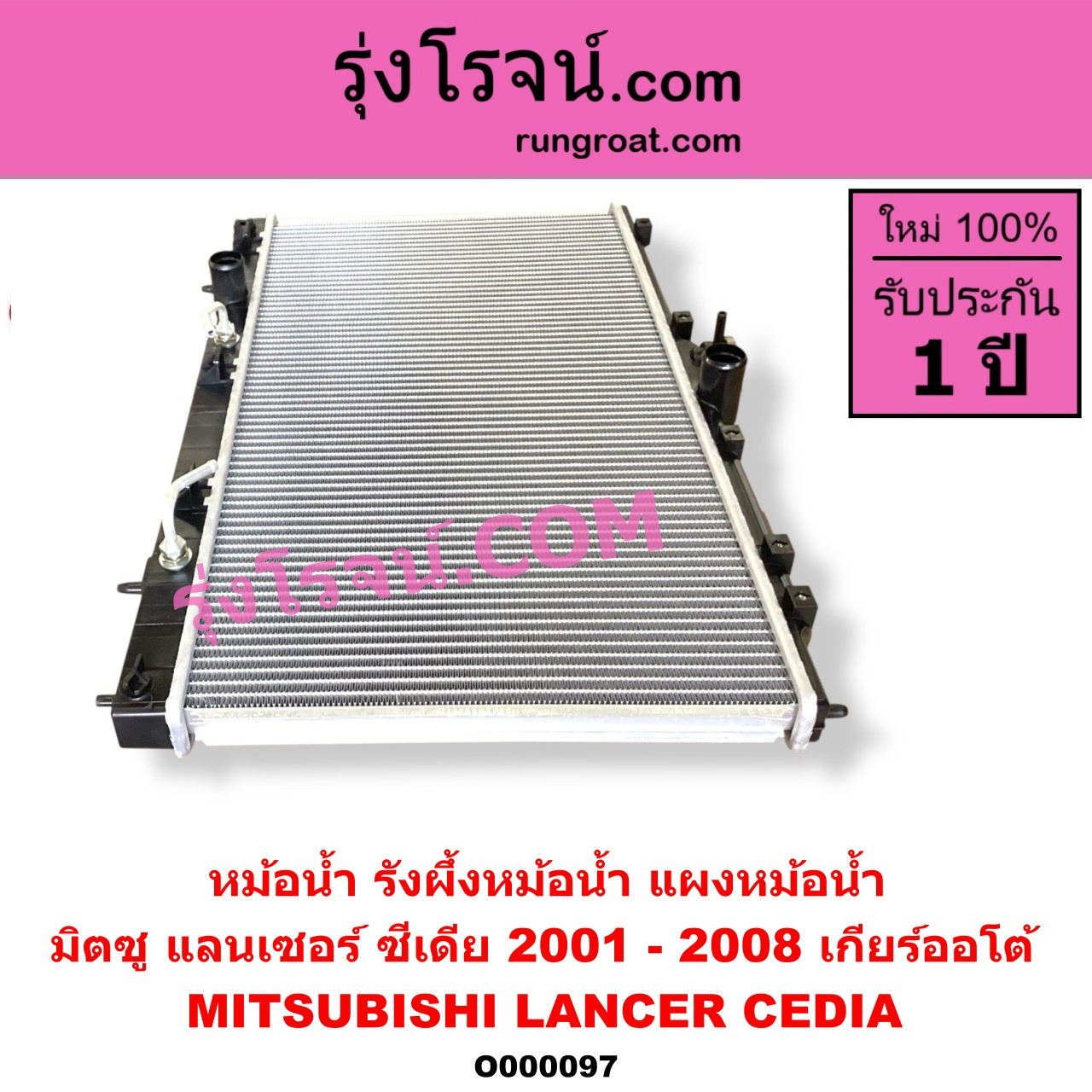 | O000097 | หม้อน้ำ (รังผึ้งหม้อน้ำ, แผงหม้อน้ำ) | MITSUBISHI (มิตซู) / LANCER CEDIA (แลนเซอร์ ซีเดีย 2001 – 2008) | เกียร์ออโต้ (ใส่เกียร์กระปุกได้) | ไต้หวัน (ใหม่) |