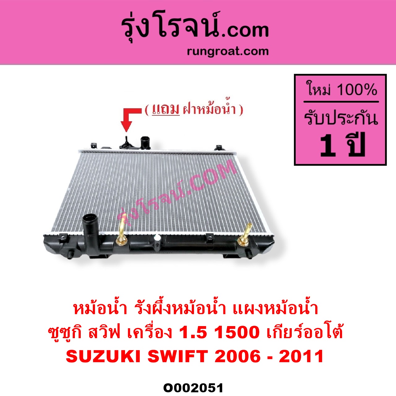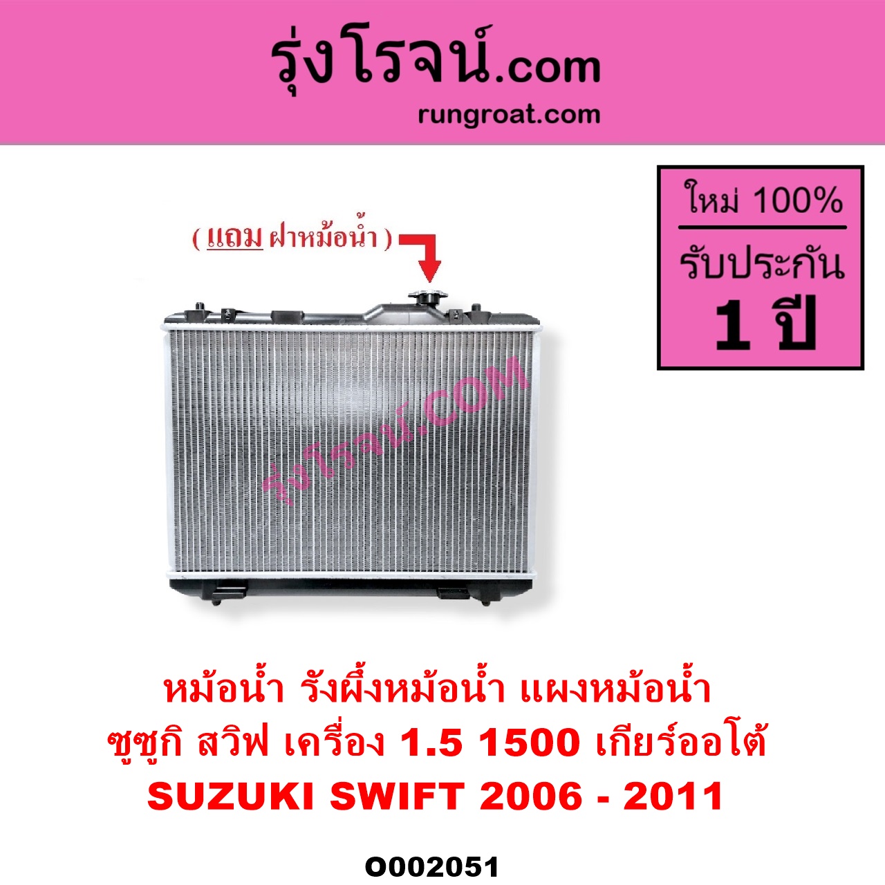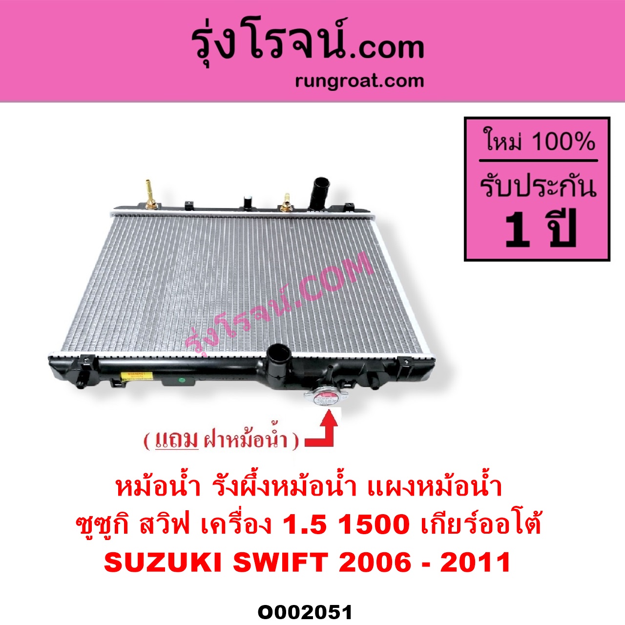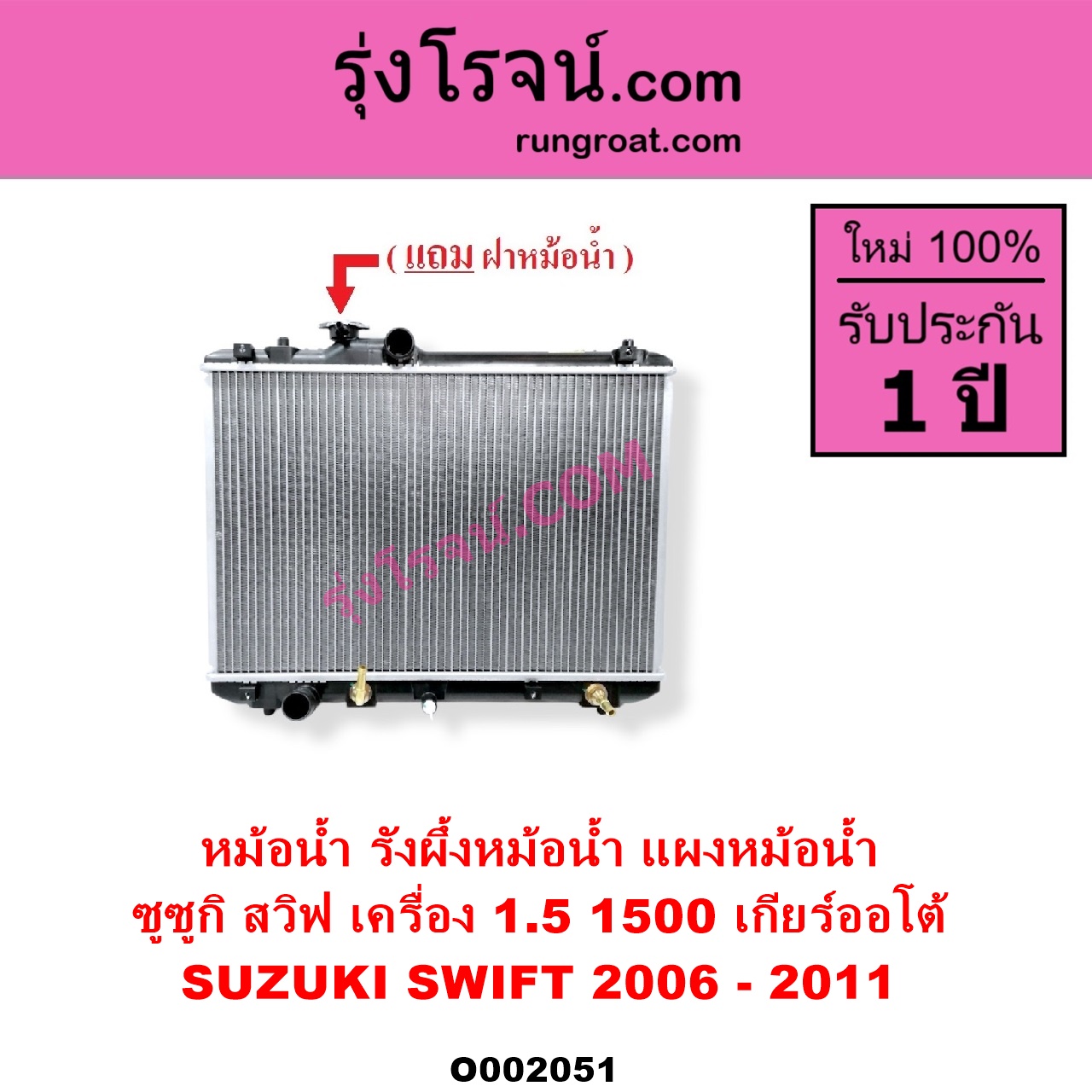 | O002051 | หม้อน้ำ (รังผึ้งหม้อน้ำ, แผงหม้อน้ำ) | SUZUKI (ซูซูกิ) / SWIFT (สวิฟ 2006 – 2011) (รุ่นแรก เครื่อง 1.5) | เกียร์ออโต้ (ใส่เกียร์ธรรมดาได้) เครื่อง 1500 | ไต้หวัน (ใหม่) |