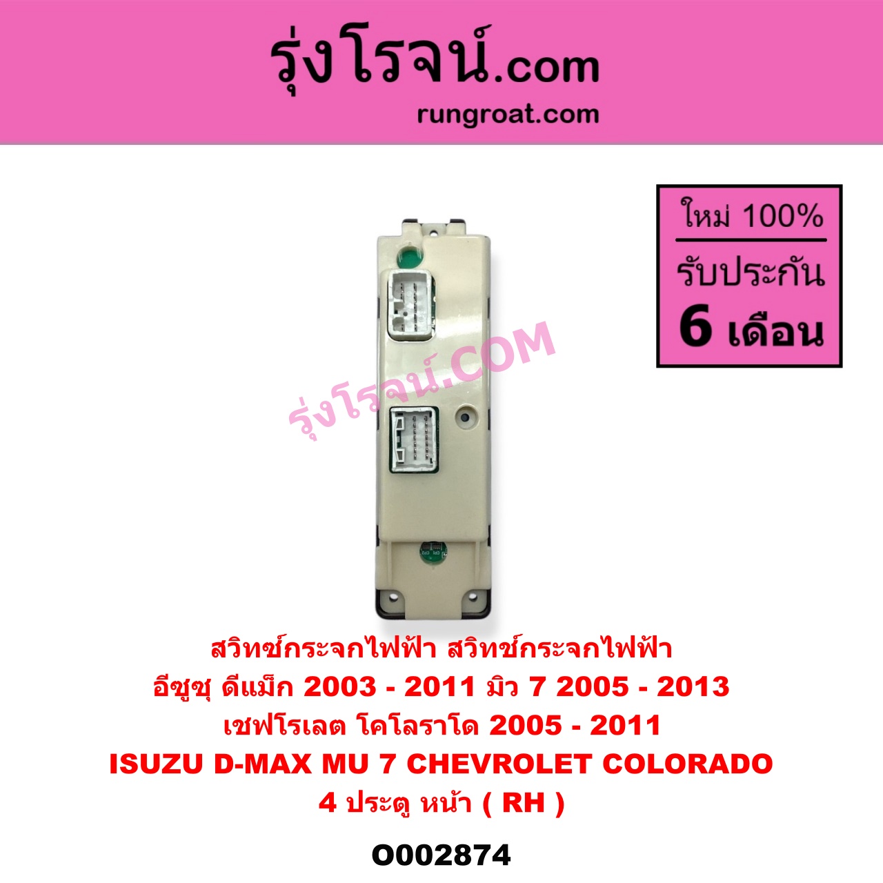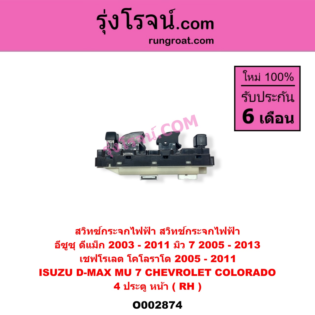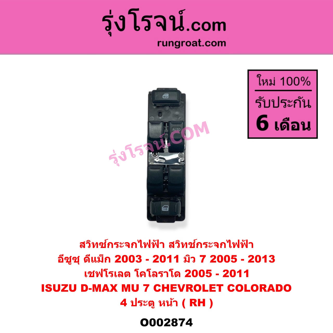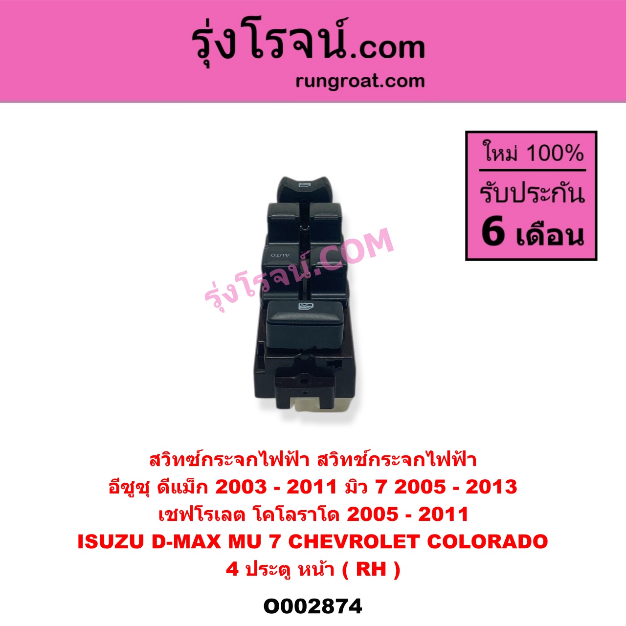 | O002874 | สวิทซ์กระจกไฟฟ้า (สวิทช์กระจกไฟฟ้า) | CHEVROLET (เชฟโรเลต) / COLORADO (โคโลราโด 2005 – 2011) (ตา 2 ชั้น / ตาชั้นเดียว) , ISUZU (อีซูซุ) / D-MAX (ดีแม็ก ดีแม็ค DMAX 2003 – 2011) (รุ่นแรก) , ISUZU (อีซูซุ) / MU 7 (มิว 7 2005 – 2013) |