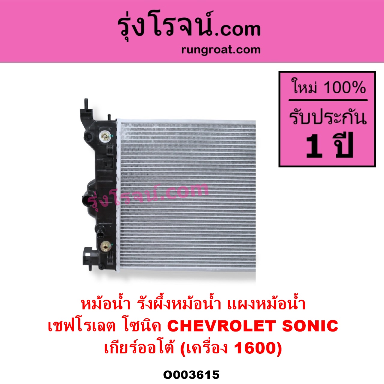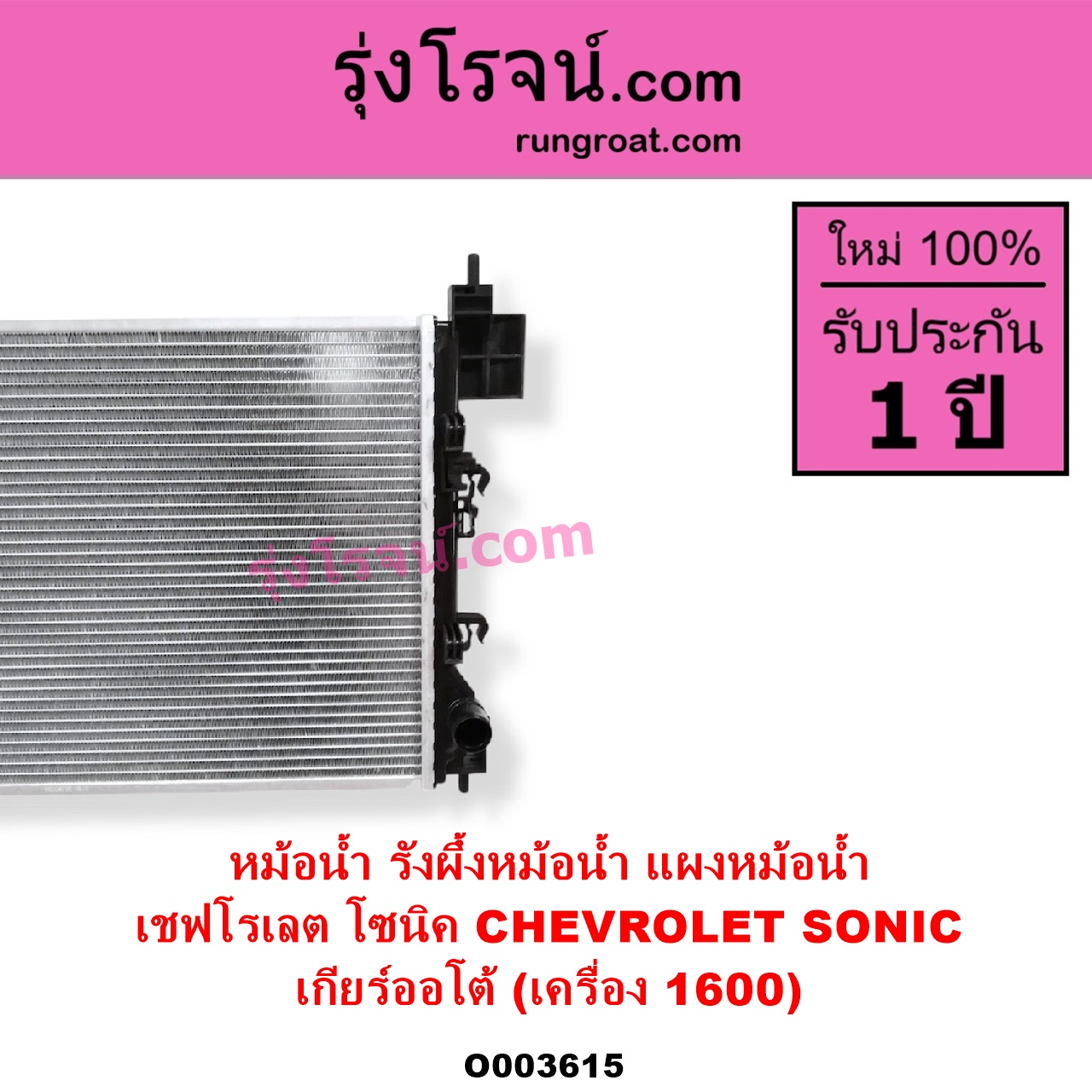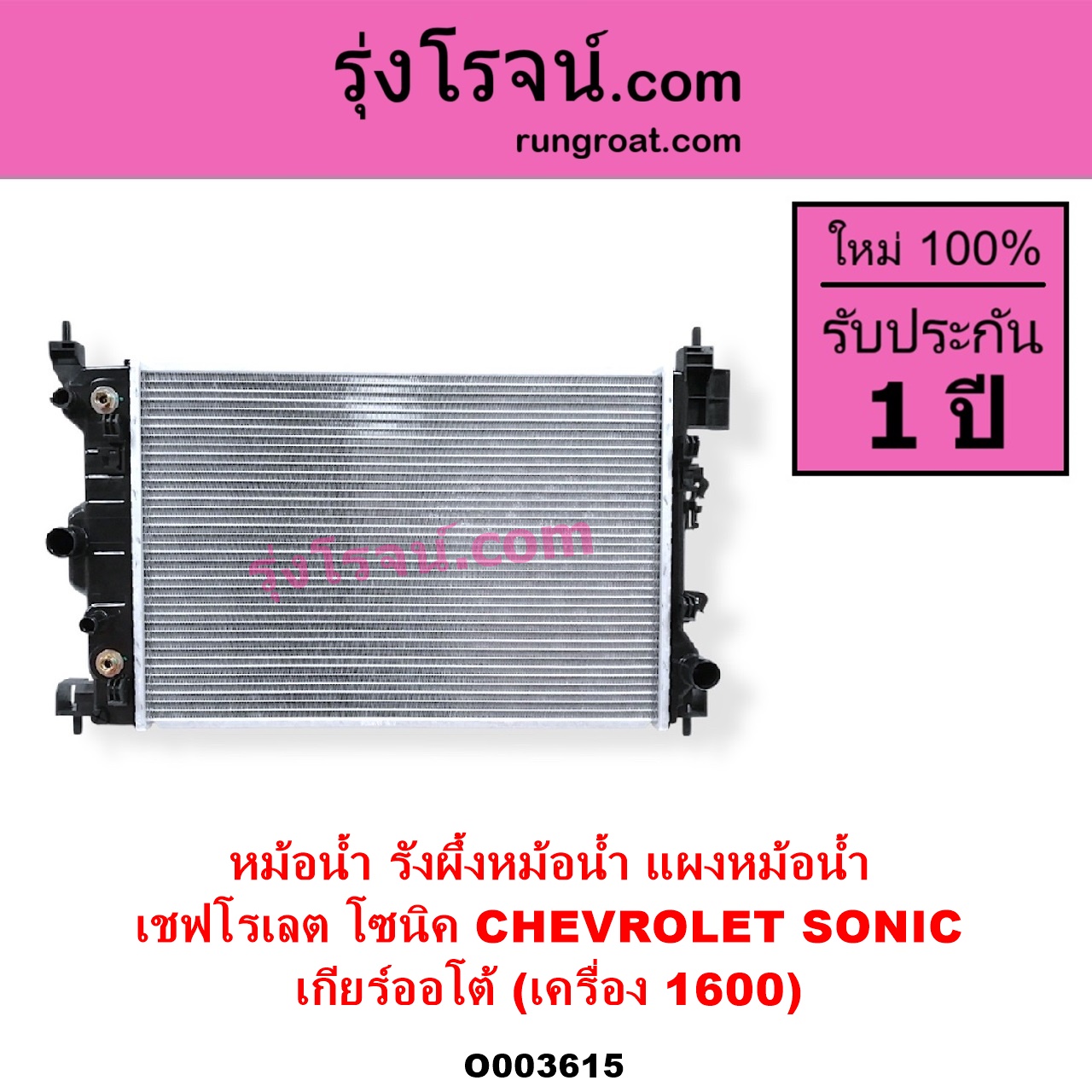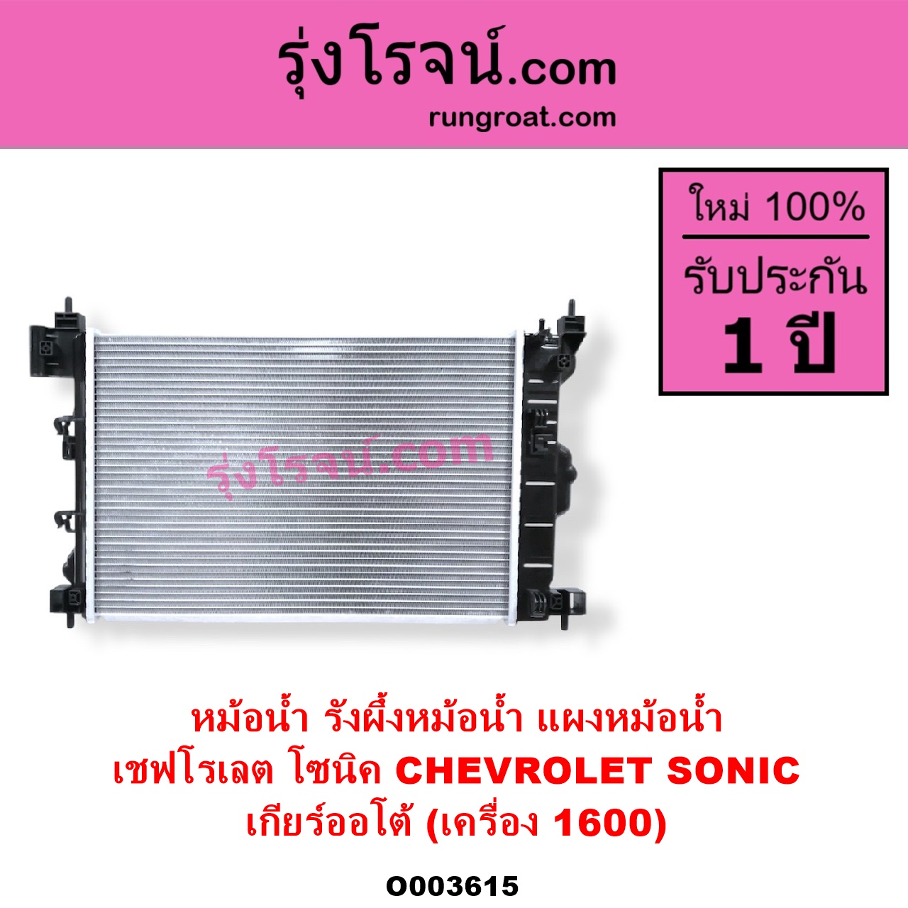 | O003615 | หม้อน้ำ (รังผึ้งหม้อน้ำ, แผงหม้อน้ำ) | CHEVROLET (เชฟโรเลต) / SONIC (โซนิค 1.4 1.6) | เกียร์ออโต้ (เครื่อง 1600) | ไต้หวัน (ใหม่) |