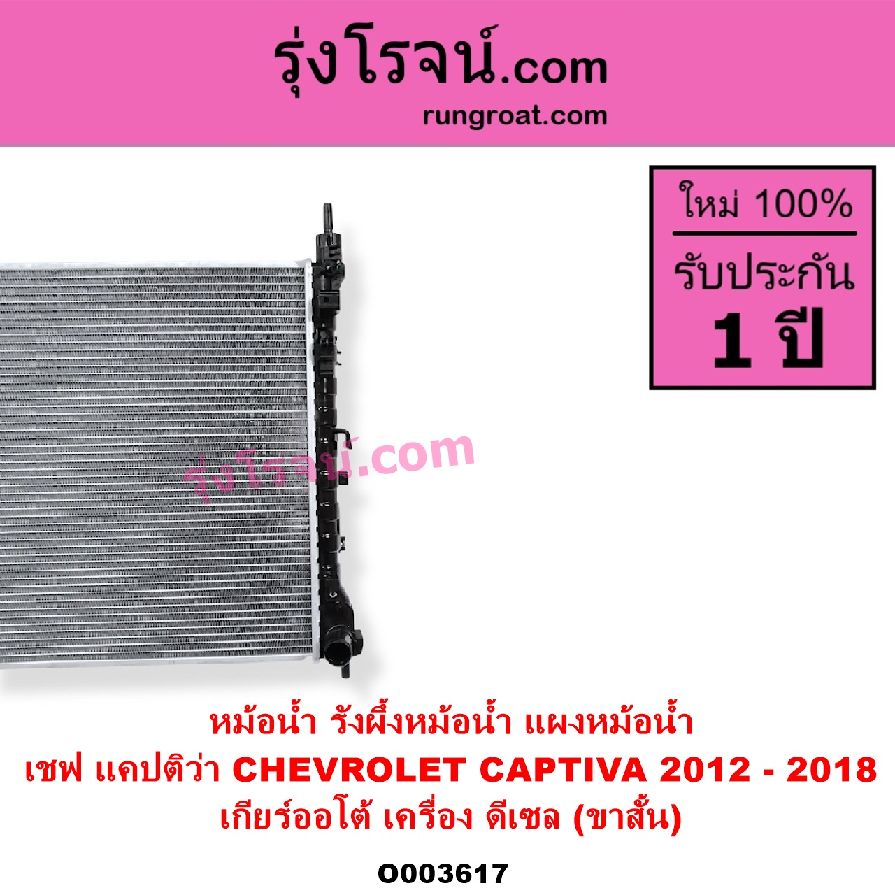 | O003617 | หม้อน้ำ (รังผึ้งหม้อน้ำ, แผงหม้อน้ำ) | CHEVROLET (เชฟโรเลต) / CAPTIVA (แคปติว่า แคปติวา 2008 – 2018) (C100 / C140) | เกียร์ออโต้ (เครื่อง ดีเซล) (โฉมปี 2012-2018) (ขาสั้น) | ไต้หวัน (ใหม่) |