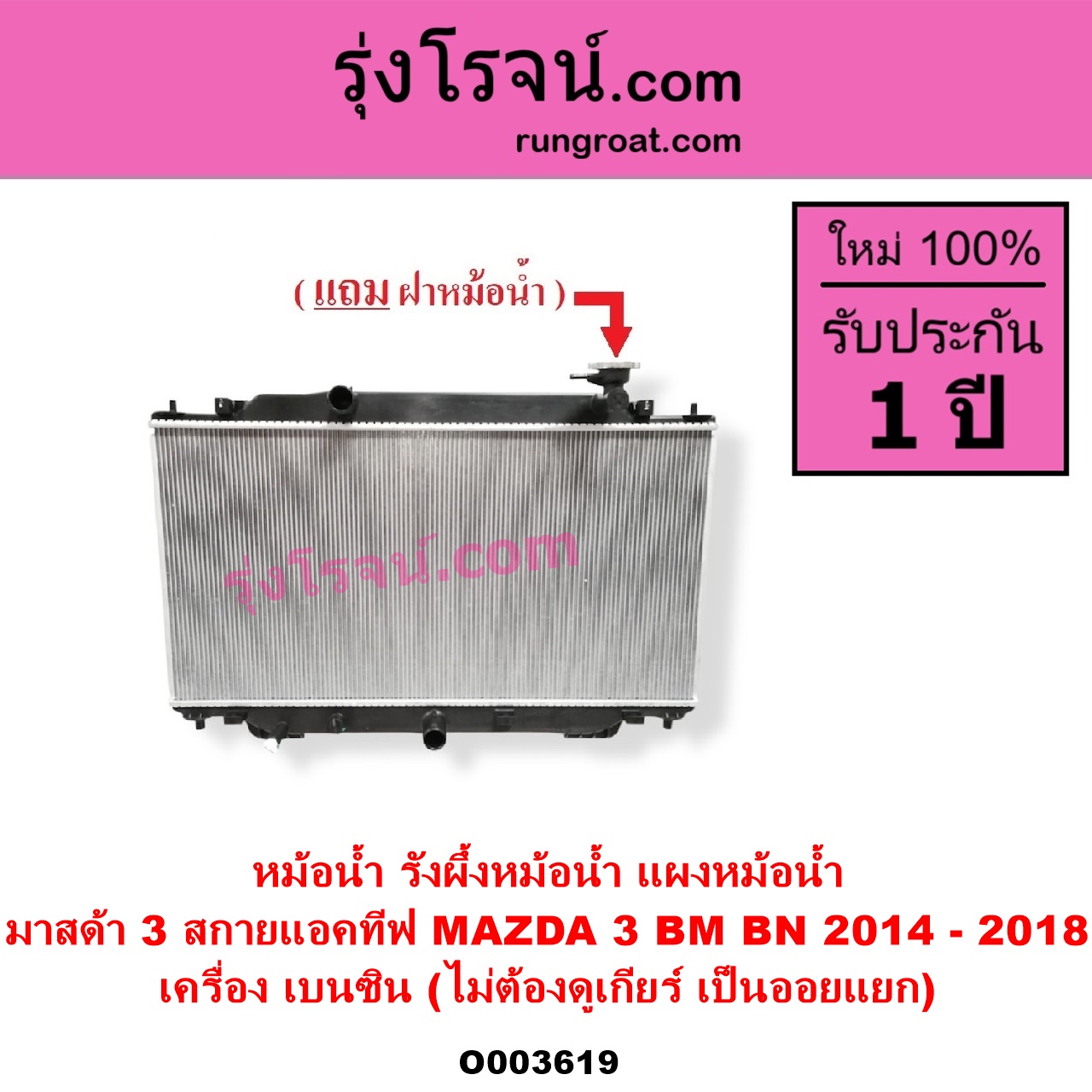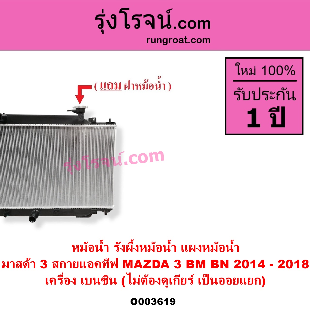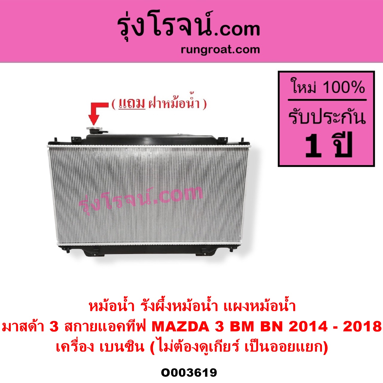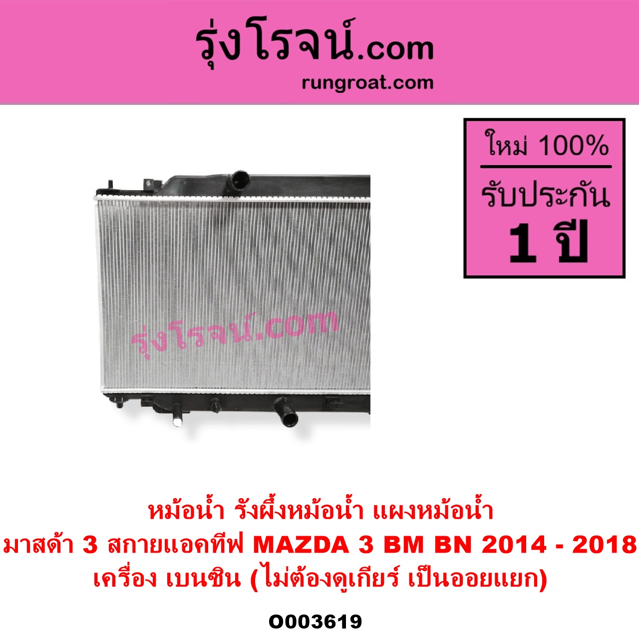 | O003619 | หม้อน้ำ (รังผึ้งหม้อน้ำ, แผงหม้อน้ำ) | MAZDA (มาสด้า) / MAZDA 3 (มาสด้า 3 2014 – 2018) (BM BN รุ่น 3, สกายแอคทีฟ SKYACTIV) | เครื่อง เบนซิน (ไม่ต้องดูเกียร์ เป็นออยแยก) | ไต้หวัน (ใหม่) |