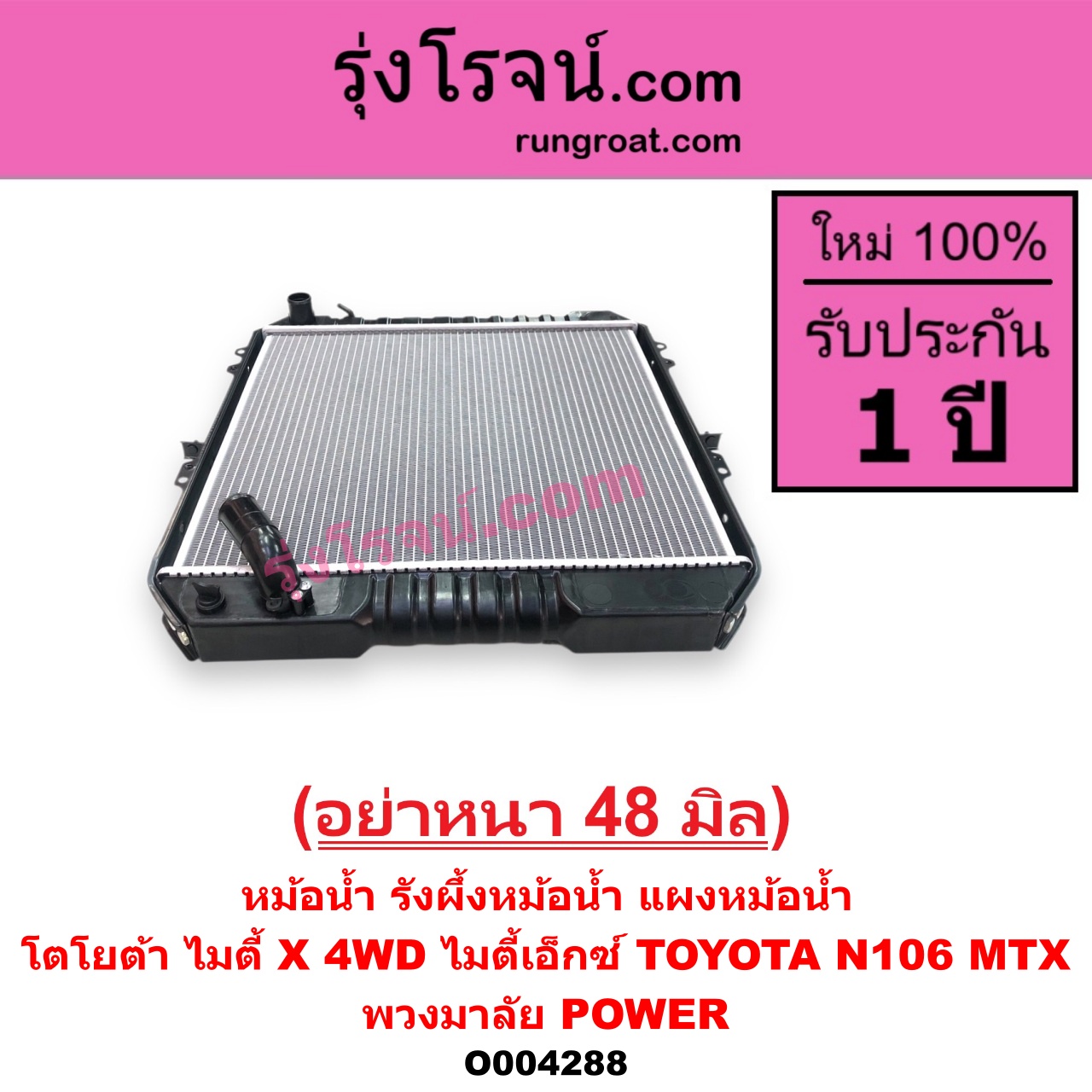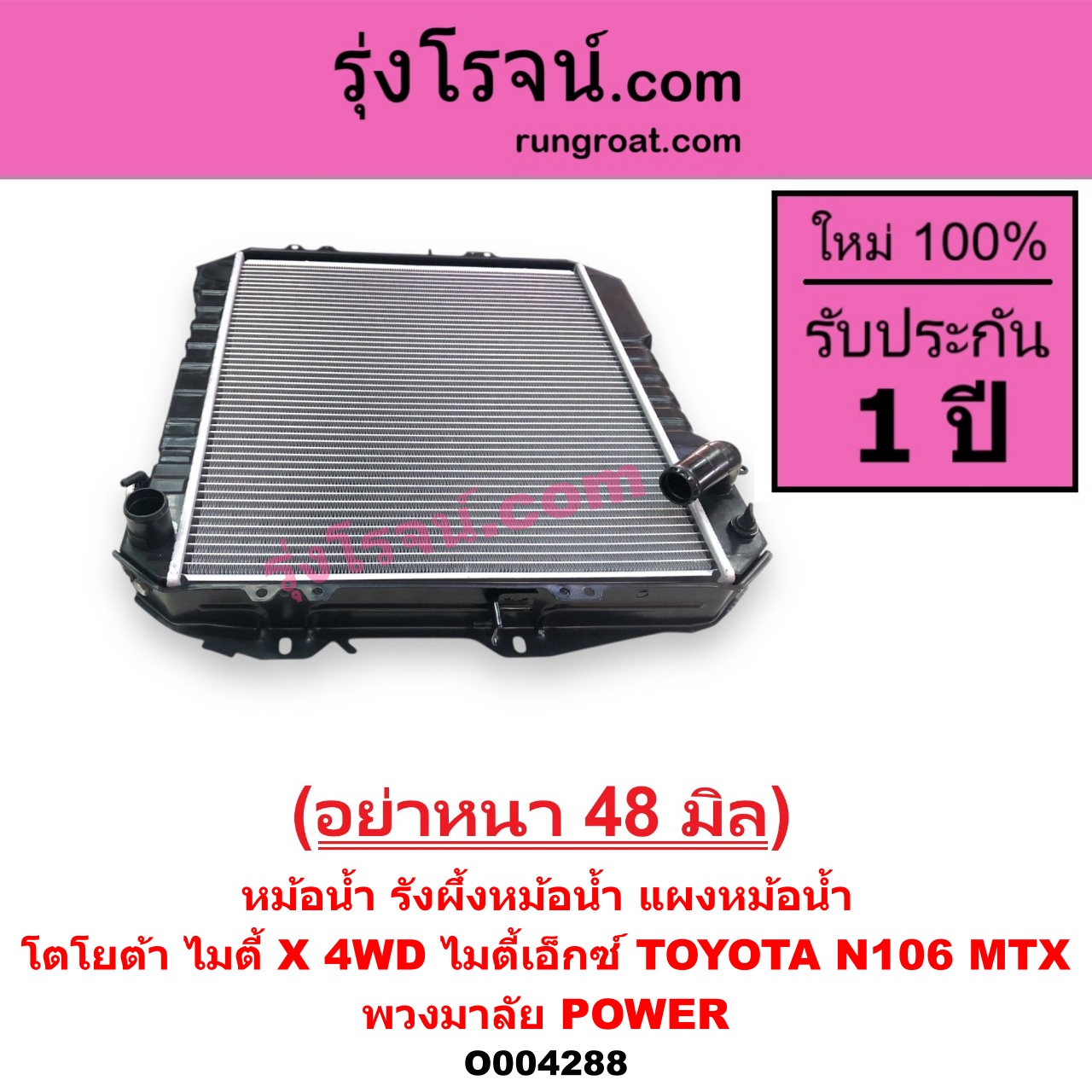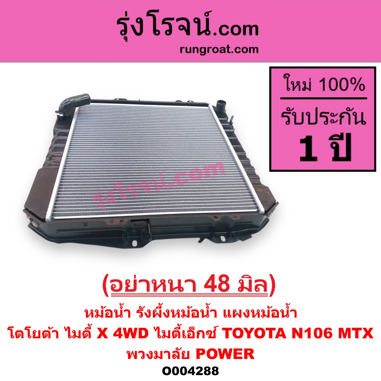 | O004288 | หม้อน้ำ (รังผึ้งหม้อน้ำ, แผงหม้อน้ำ) | TOYOTA (โตโยต้า) / LN106 (ไมตี้ X 4WD) , TOYOTA (โตโยต้า) / MTX (ไมตี้ X 1988 – 1996) |