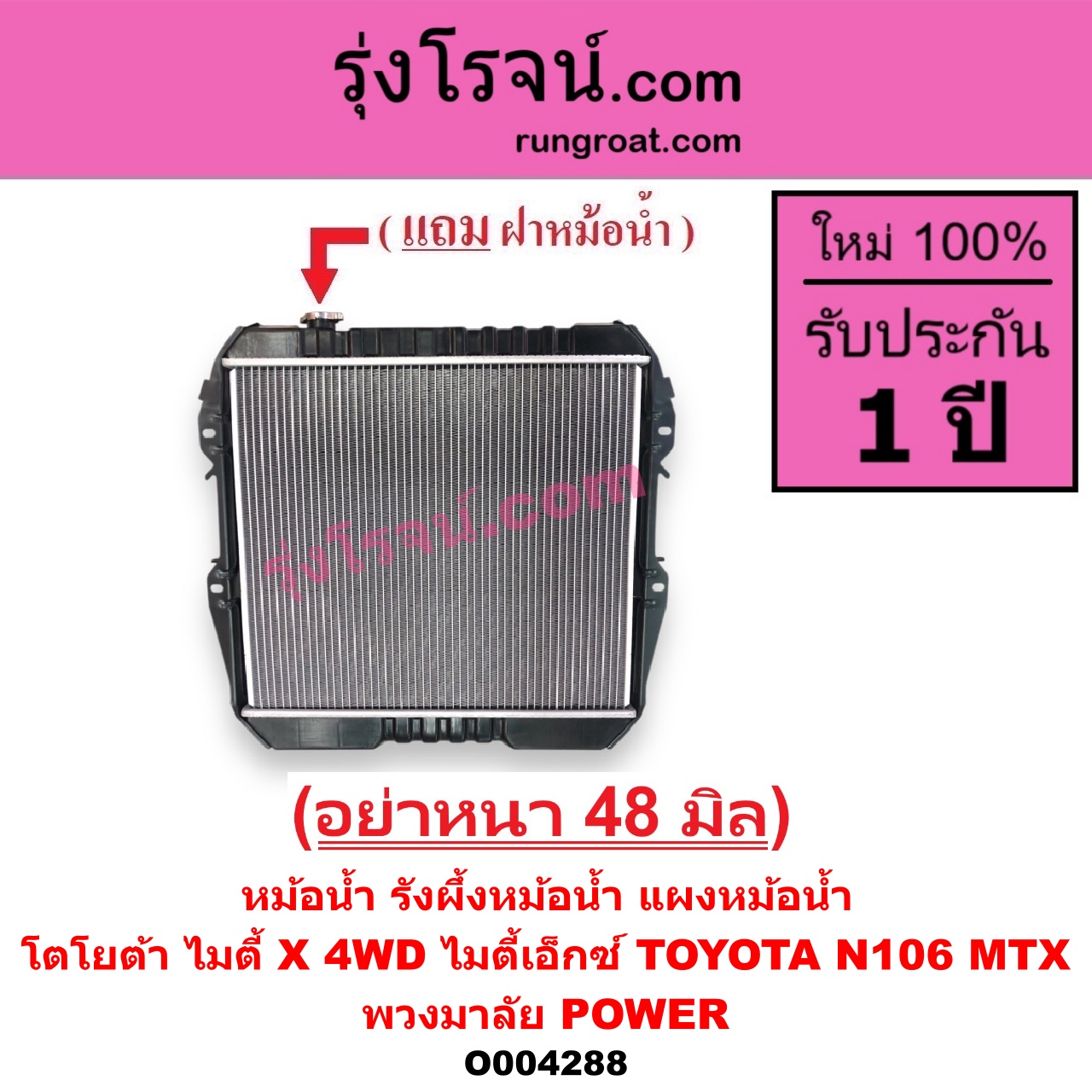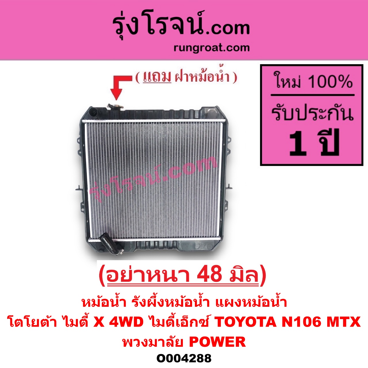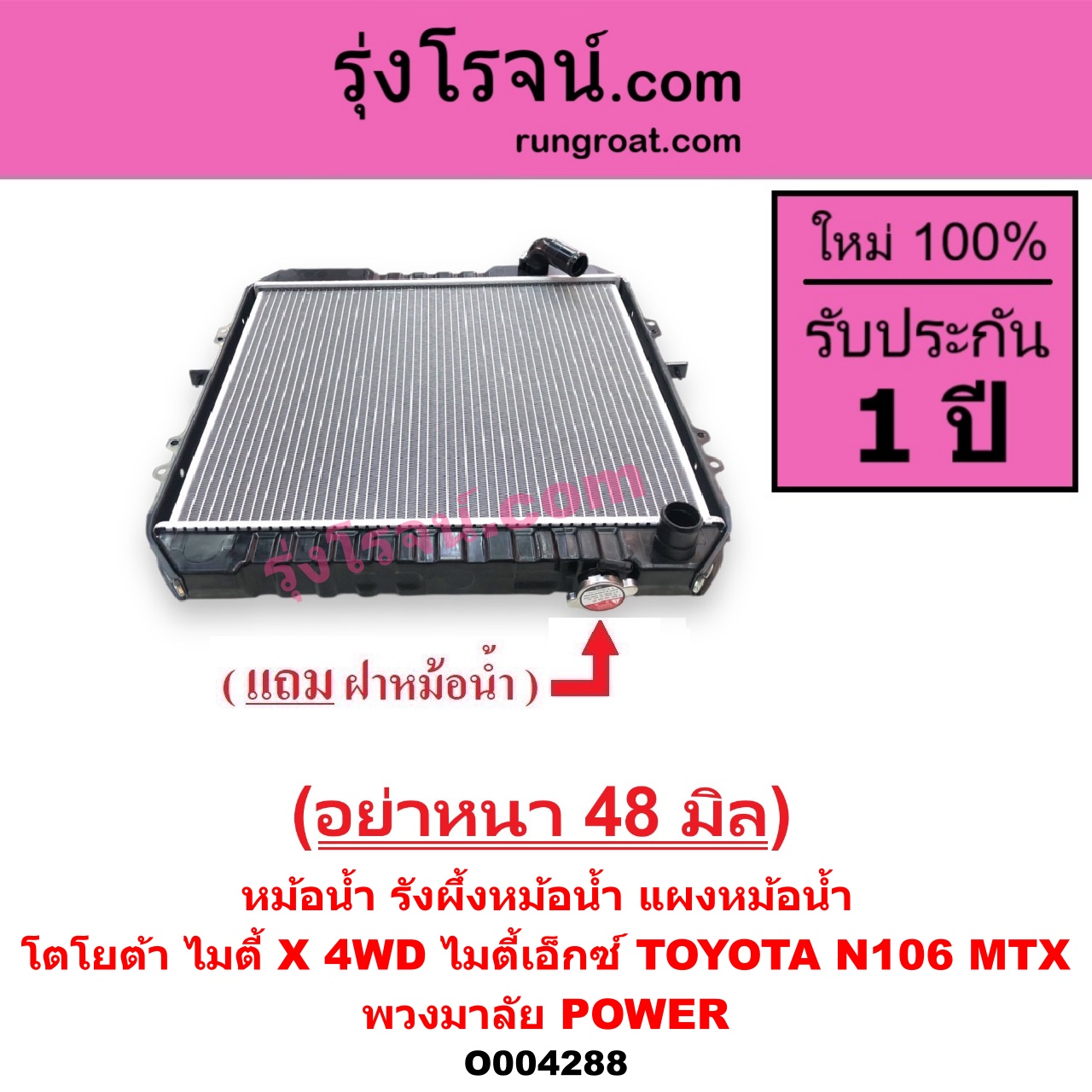| O004288 | หม้อน้ำ (รังผึ้งหม้อน้ำ, แผงหม้อน้ำ) | TOYOTA (โตโยต้า) / LN106 (ไมตี้ X 4WD) , TOYOTA (โตโยต้า) / MTX (ไมตี้ X 1988 – 1996) |
