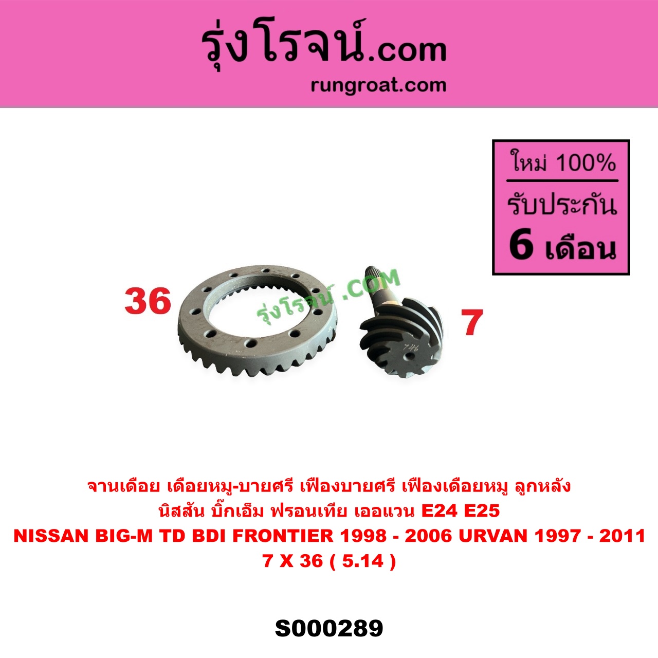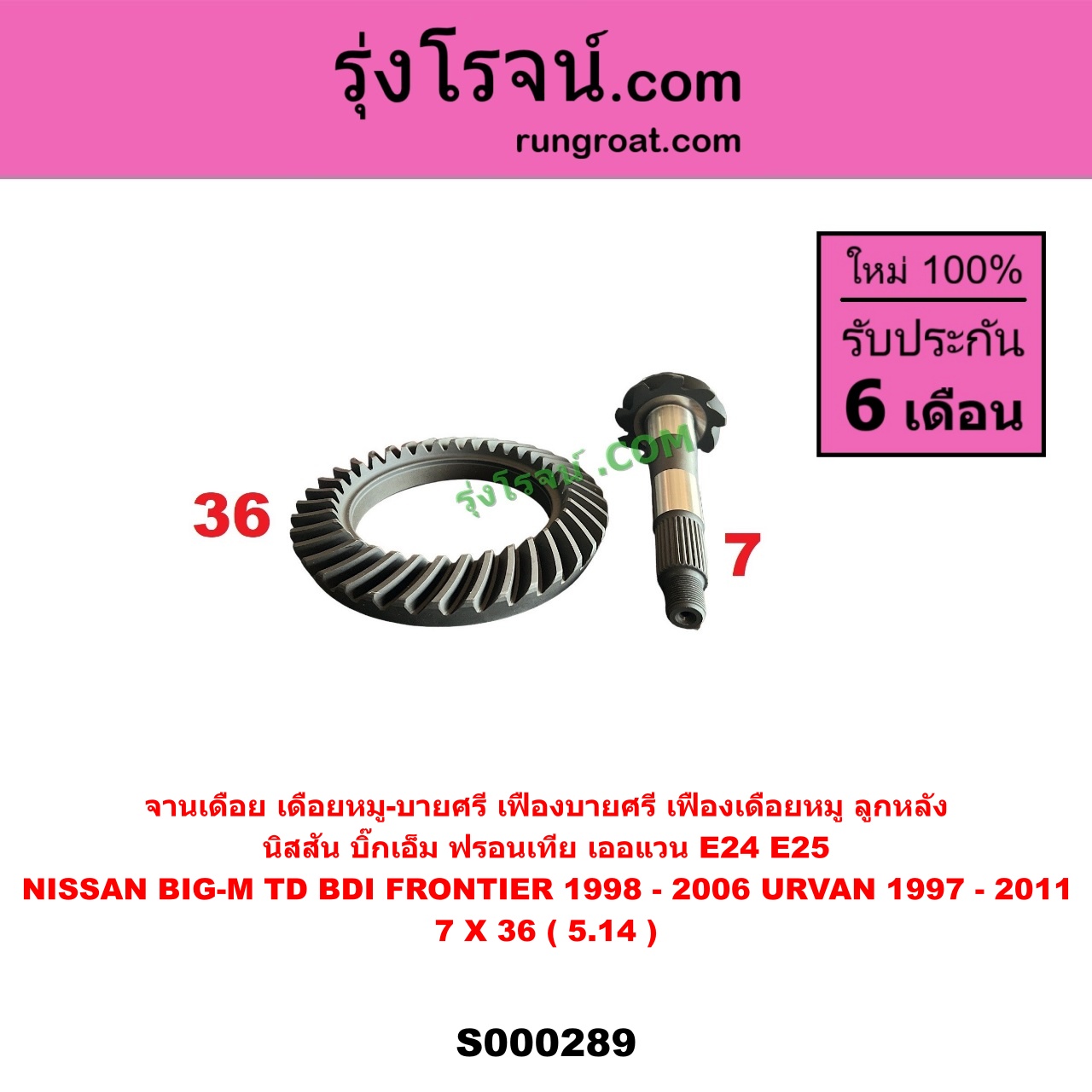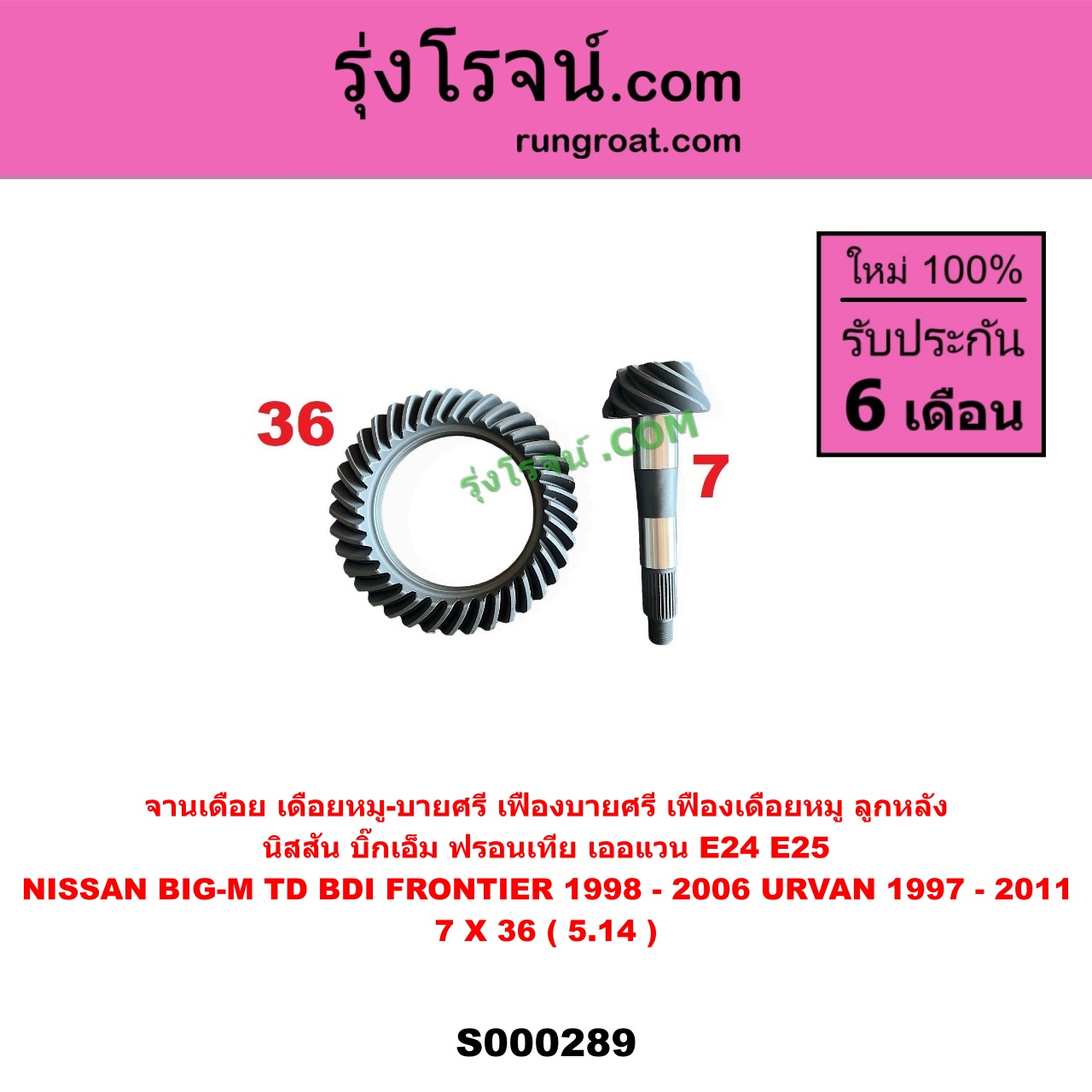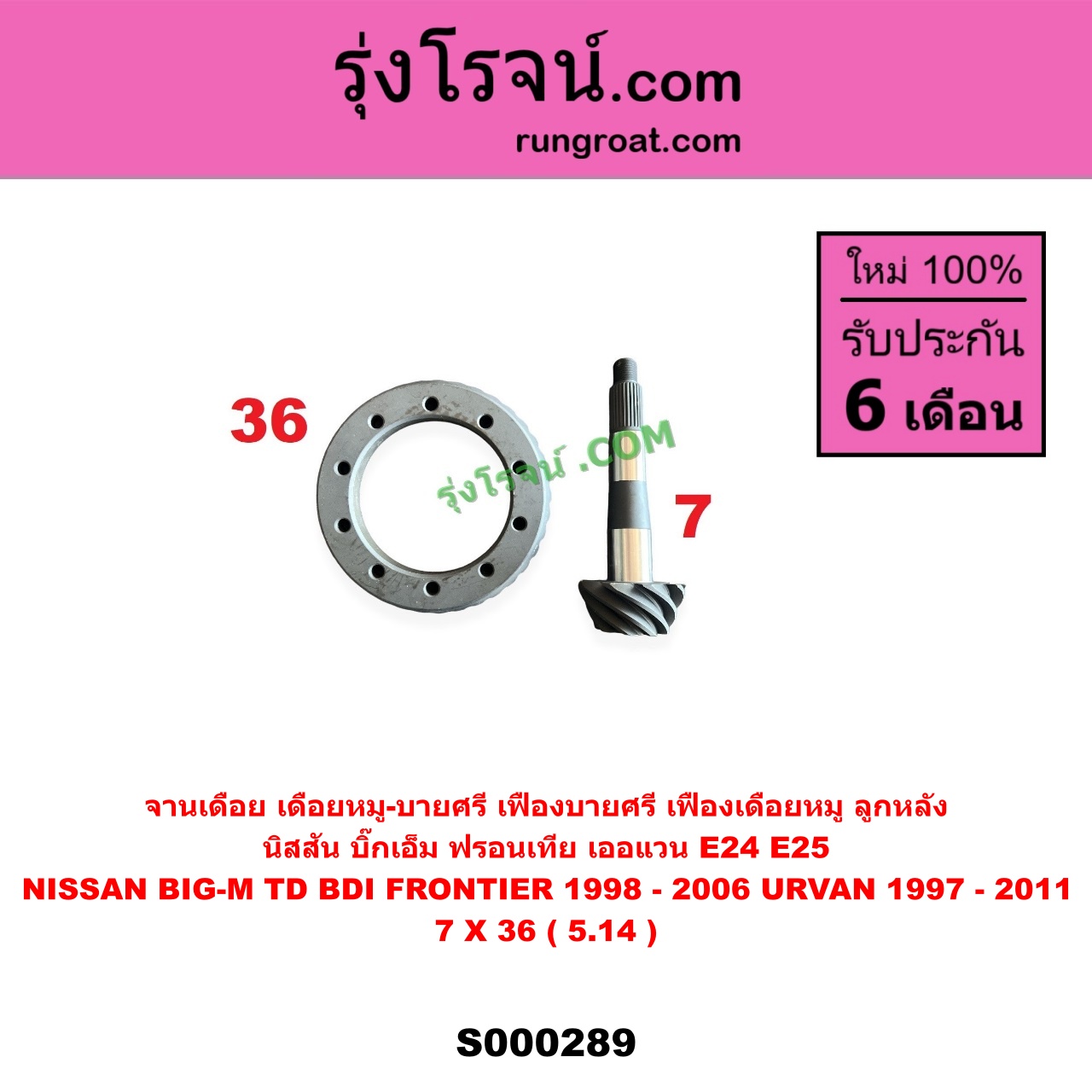 | S000289 | จานเดือย (เดือยหมู-บายศรี, เฟืองบายศรี เฟืองเดือยหมู) | NISSAN (นิสสัน) / BIG-M (บิ๊กเอ็ม TD, BDI / 925 / 993) , NISSAN (นิสสัน) / FRONTIER (ฟรอนเทีย 1998 – 2006) , NISSAN (นิสสัน) / URVAN (เออแวน E24 1997 – 2000) , NISSAN (นิสสัน) / URVAN (เออแวน E25 2001 – 2011) |