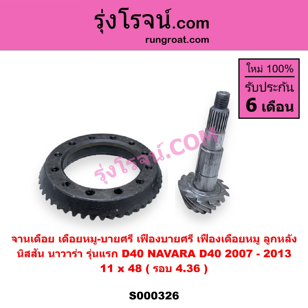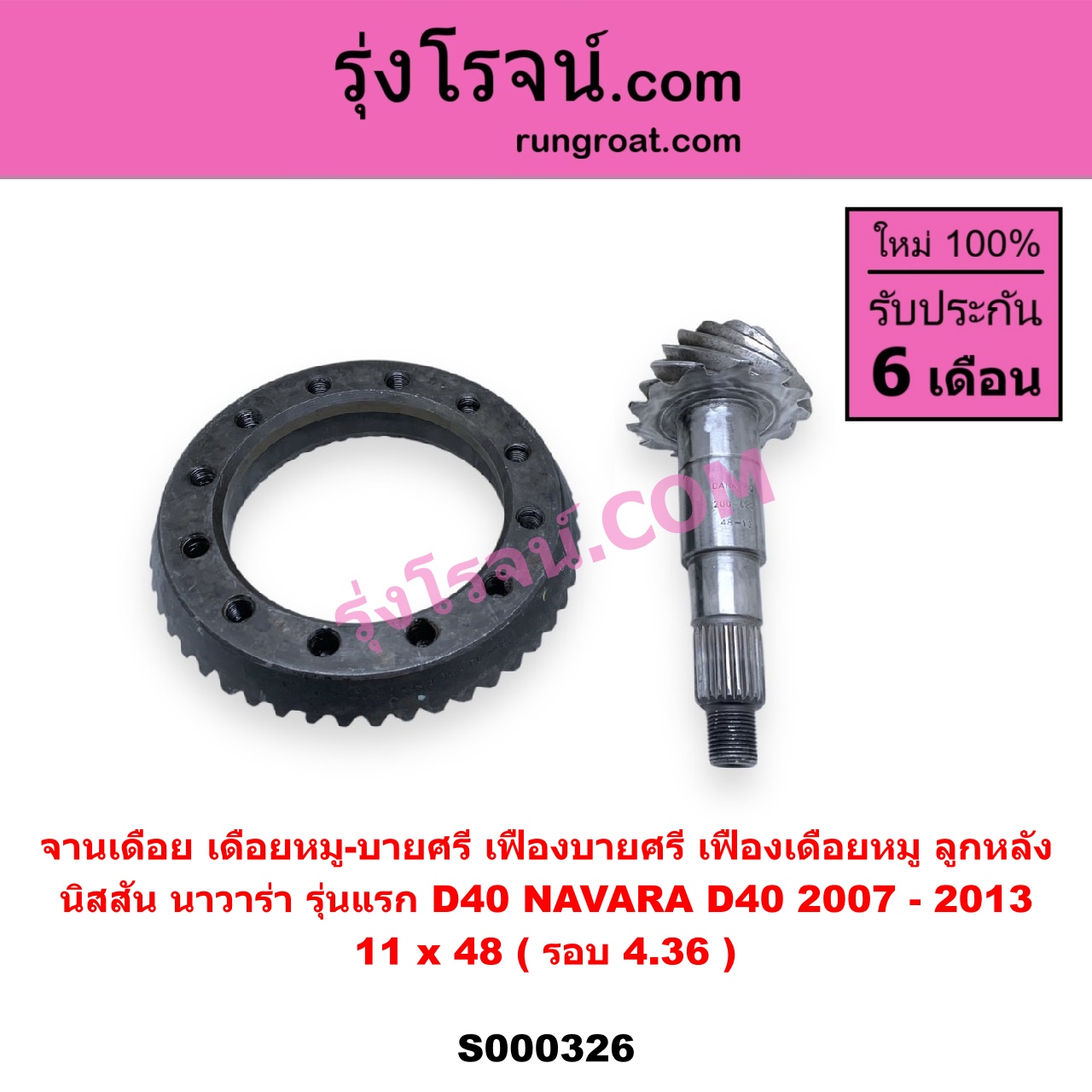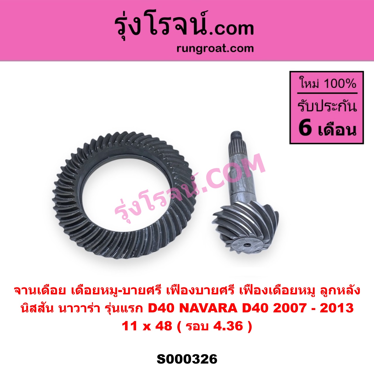 | S000326 | จานเดือย (เดือยหมู-บายศรี, เฟืองบายศรี เฟืองเดือยหมู) | NISSAN (นิสสัน) / NAVARA (นาวาร่า D40 2007 – 2013) (รุ่นแรก D40) | 11 x 48 (รอบ 4.36) | ไต้หวัน (ใหม่) |