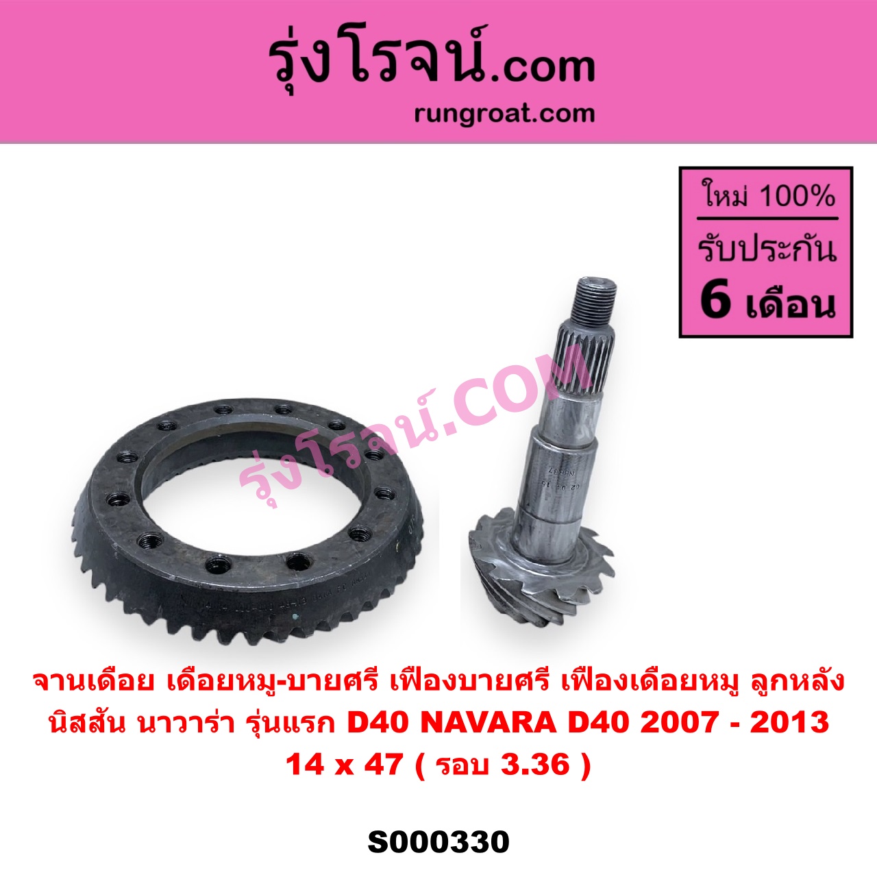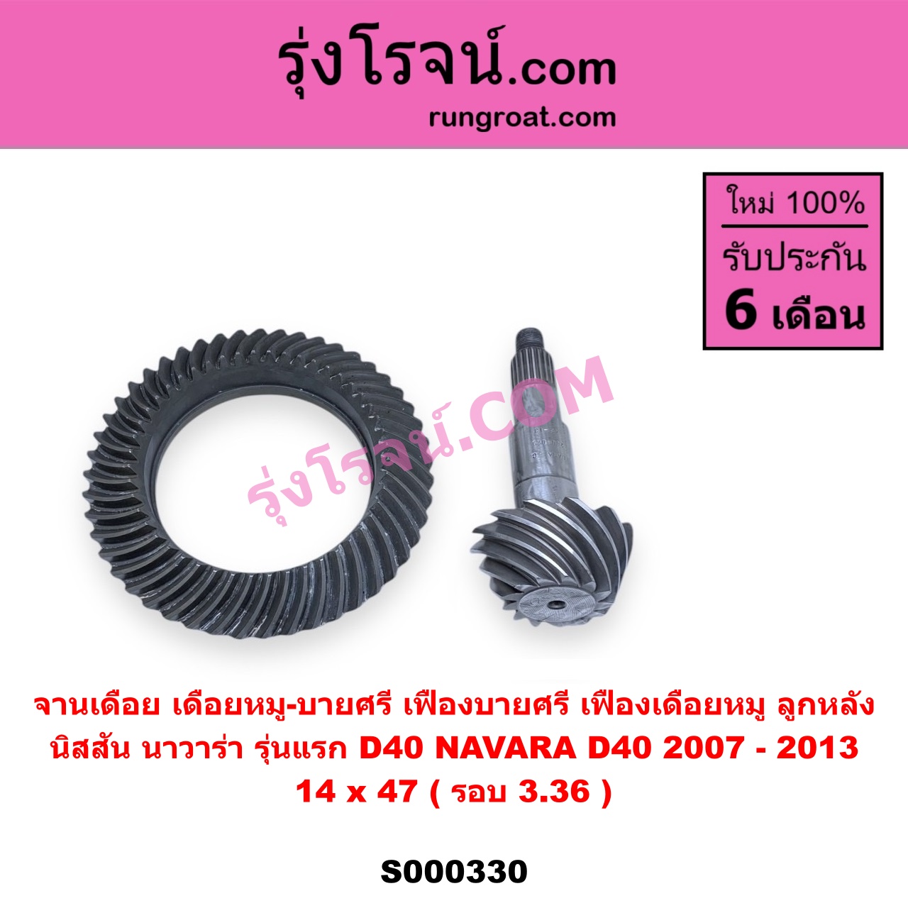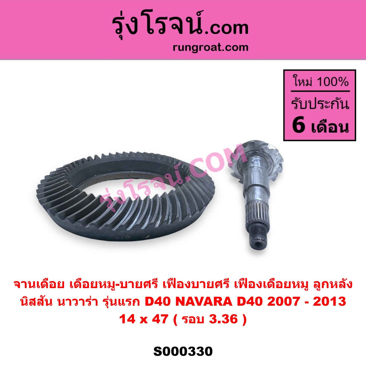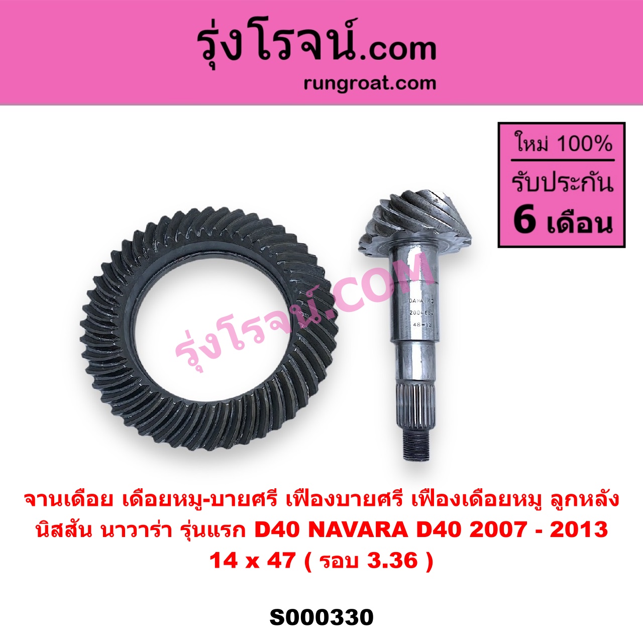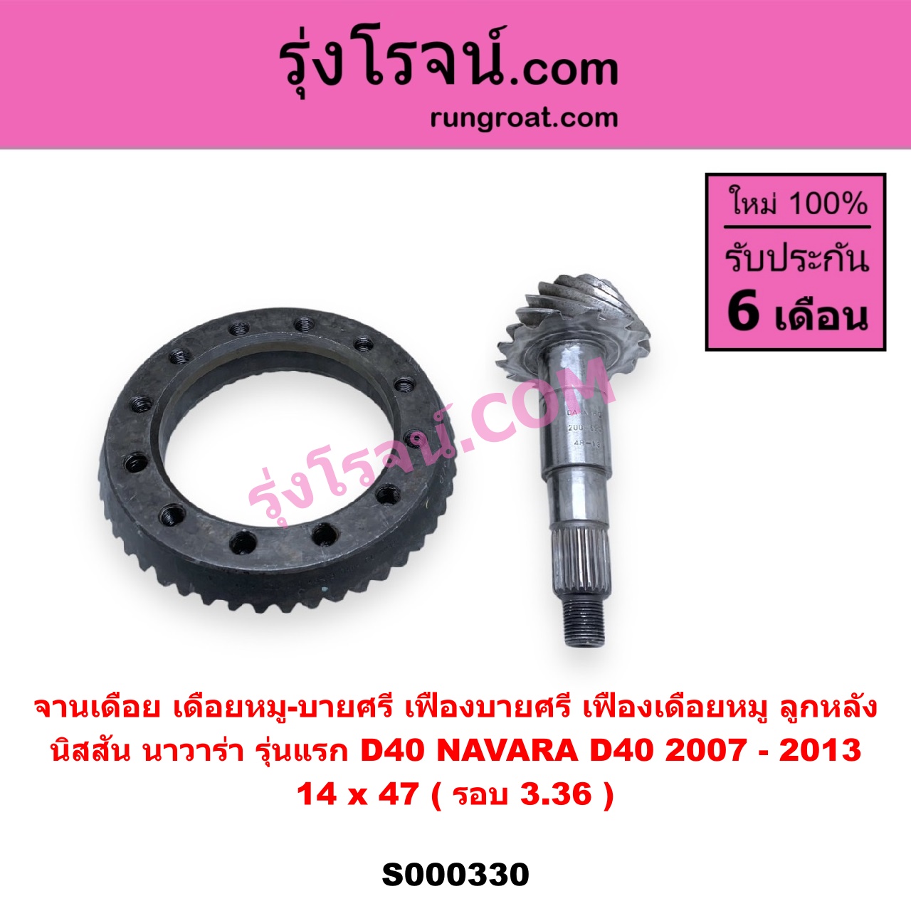 | S000330 | จานเดือย (เดือยหมู-บายศรี, เฟืองบายศรี เฟืองเดือยหมู) | NISSAN (นิสสัน) / NAVARA (นาวาร่า D40 2007 – 2013) (รุ่นแรก D40) | 14 x 47 (รอบ 3.36) | ไต้หวัน (ใหม่) |