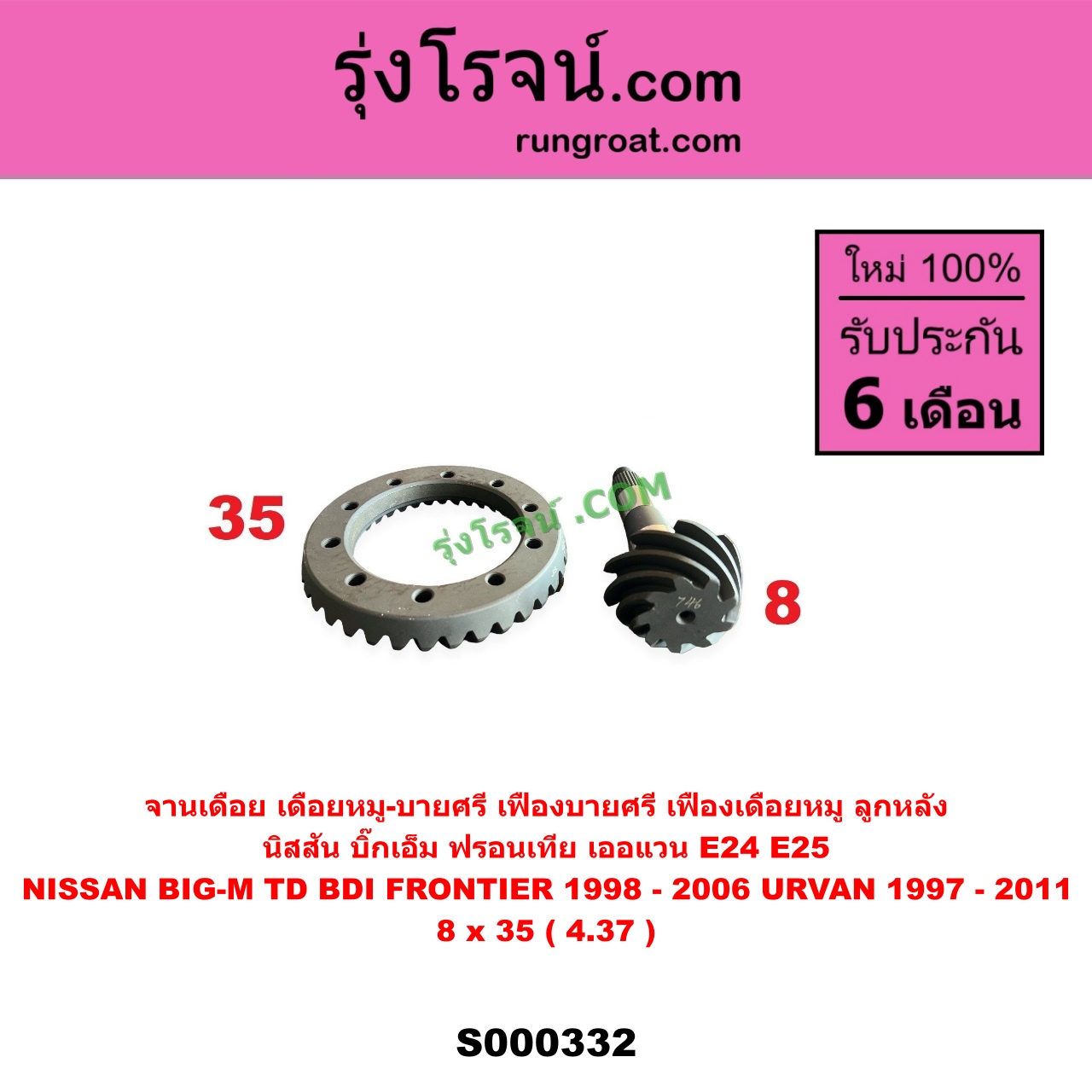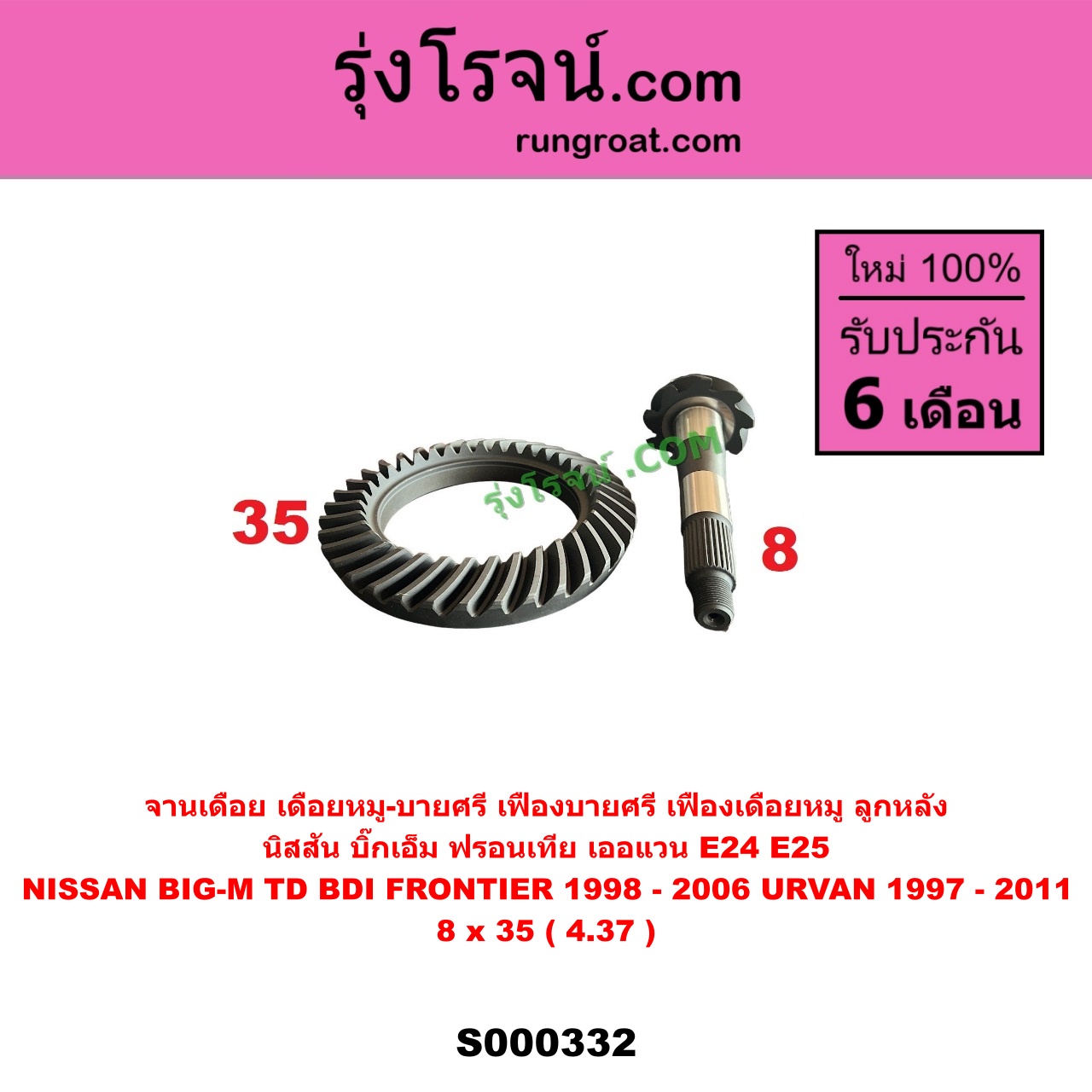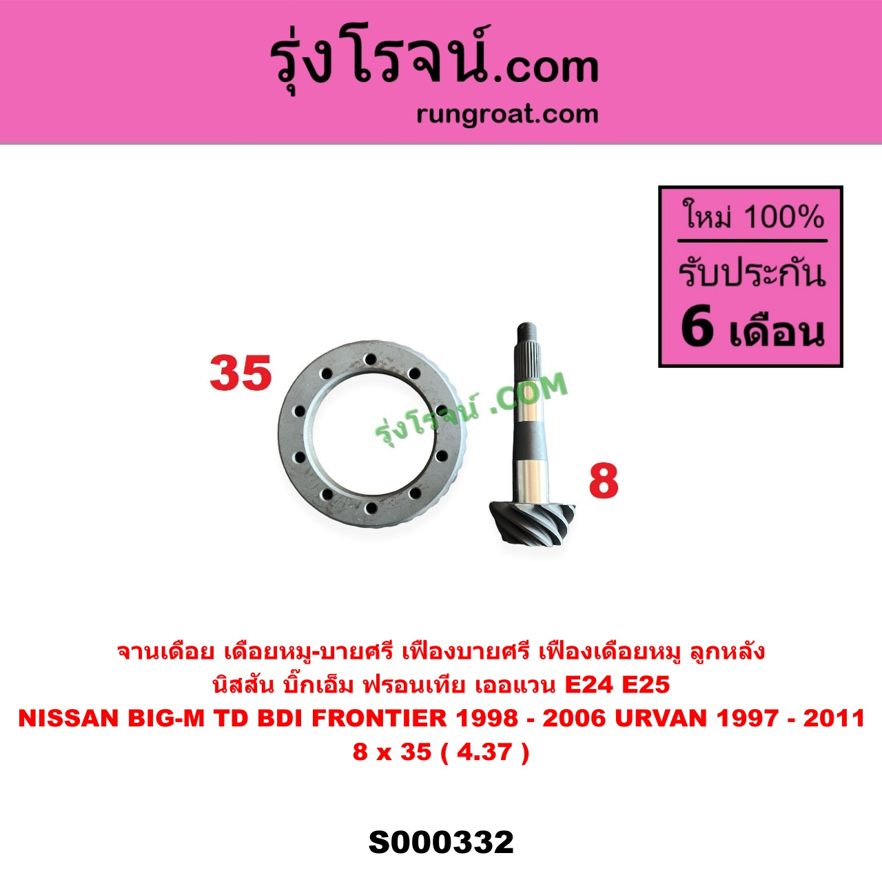| S000332 | จานเดือย (เดือยหมู-บายศรี, เฟืองบายศรี เฟืองเดือยหมู) | NISSAN (นิสสัน) / BIG-M (บิ๊กเอ็ม TD, BDI / 925 / 993) , NISSAN (นิสสัน) / FRONTIER (ฟรอนเทีย 1998 – 2006) , NISSAN (นิสสัน) / URVAN (เออแวน E24 1997 – 2000) , NISSAN (นิสสัน) / URVAN (เออแวน E25 2001 – 2011) |