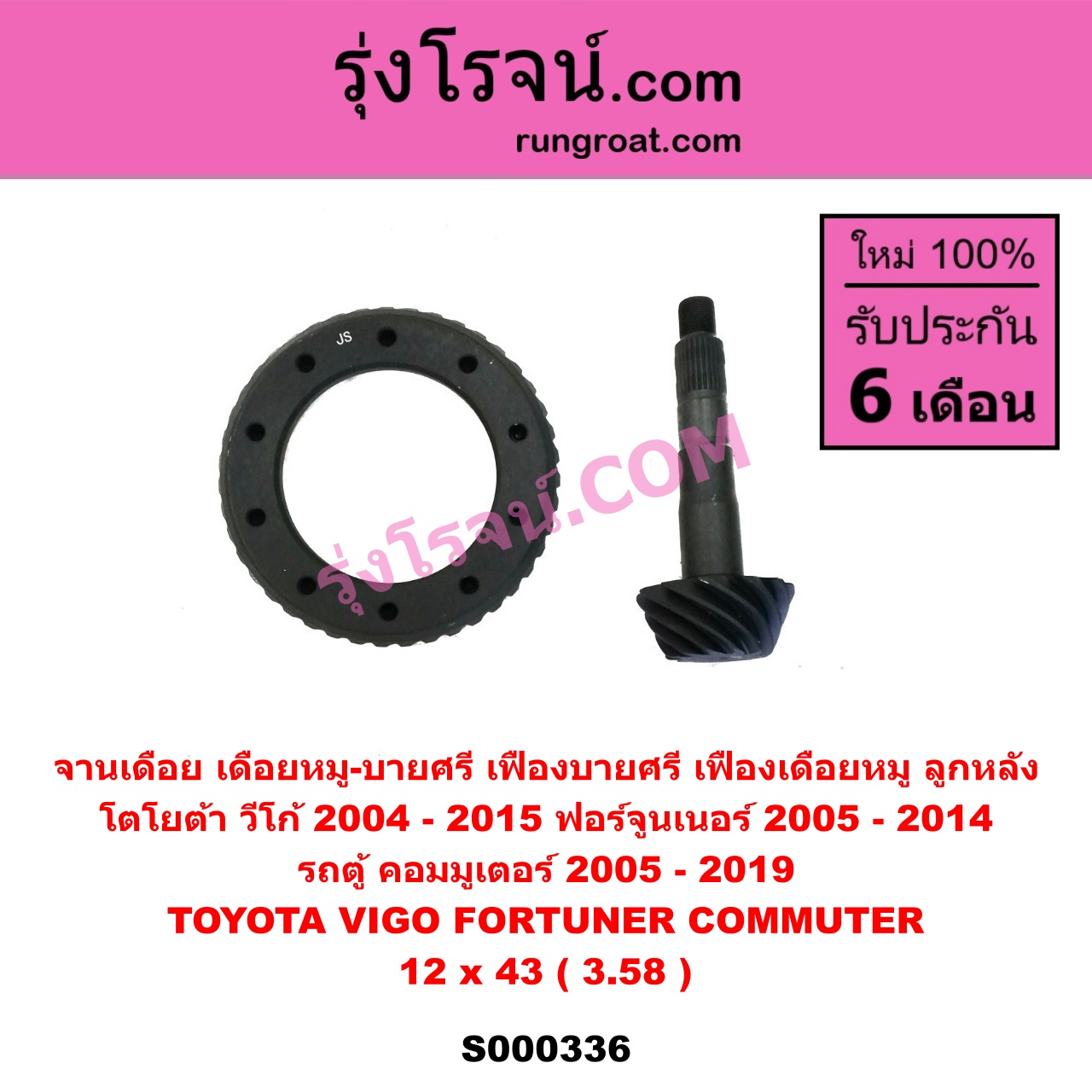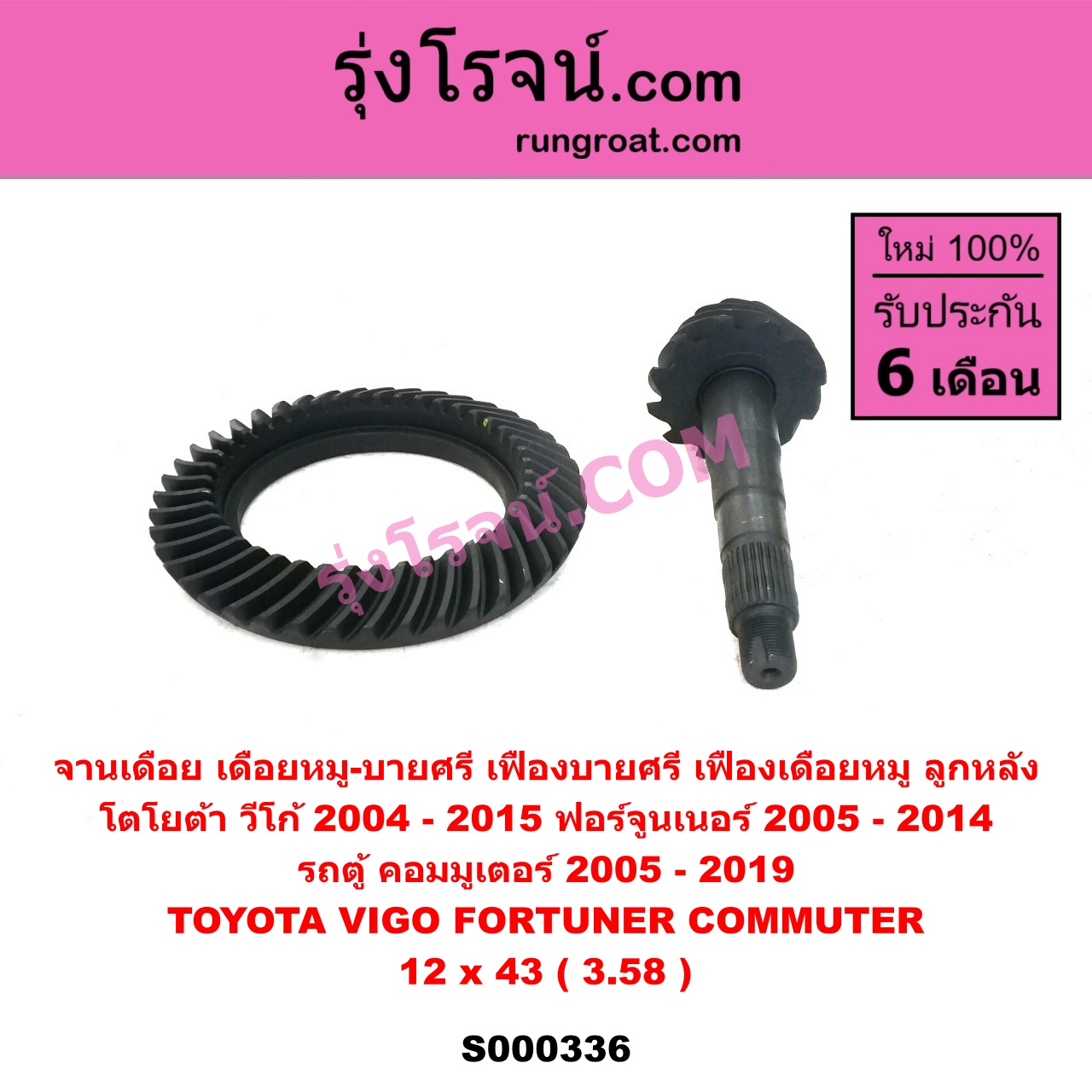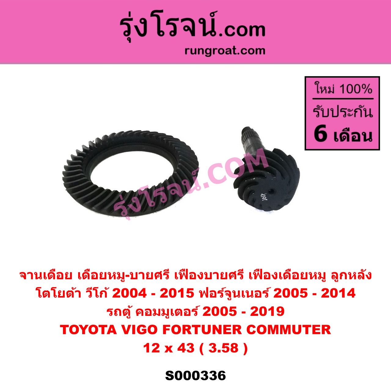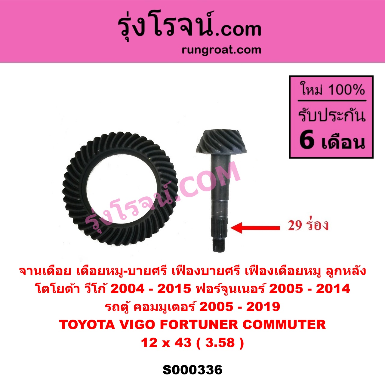 | S000336 | จานเดือย (เดือยหมู-บายศรี, เฟืองบายศรี เฟืองเดือยหมู) | TOYOTA (โตโยต้า) / COMMUTER (รถตู้ คอมมิวเตอร์ คอมมูเตอร์ 2005 – 2019) , TOYOTA (โตโยต้า) / FORTUNER (ฟอร์จูนเนอร์ 2005 – 2014) (รุ่นแรก) , TOYOTA (โตโยต้า) / VIGO (วีโก้ 2004 – 2015) |