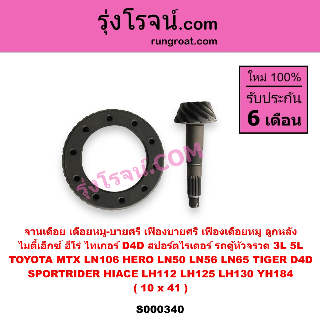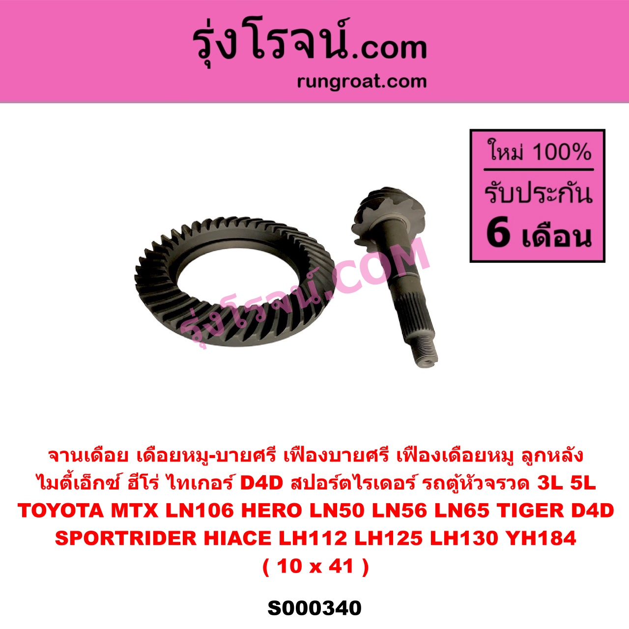 | S000340 | จานเดือย (เดือยหมู-บายศรี, เฟืองบายศรี เฟืองเดือยหมู) | TOYOTA (โตโยต้า) / HERO (ฮีโร่ 1886 / 1888) (LN50, LN56) , TOYOTA (โตโยต้า) / HIACE (ไฮเอซ LH112 LH125 LH130 YH184) (รถตู้หัวจรวด 3L 5L) , TOYOTA (โตโยต้า) / LN106 (ไมตี้ X 4WD) , TOYOTA (โตโยต้า) / LN65 (ฮีโร่ 4X4) , TOYOTA (โตโยต้า) / MTX (ไมตี้ X 1988 – 1996) , TOYOTA (โตโยต้า) / SPORTRIDER (สปอร์ตไรเดอร์) , TOYOTA (โตโยต้า) / TIGER/TIGER D4D (ไทเกอร์ / ไทเกอร์ ดีโฟร์ดี) |